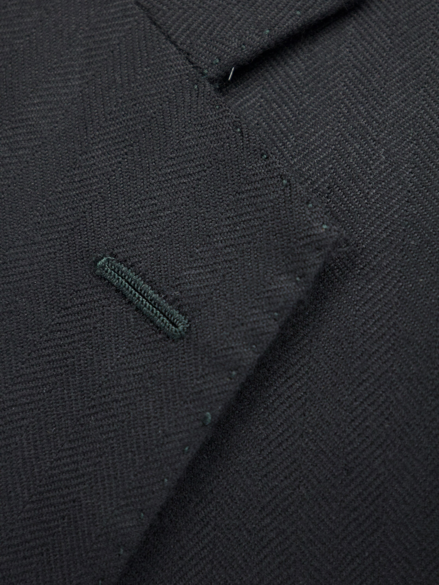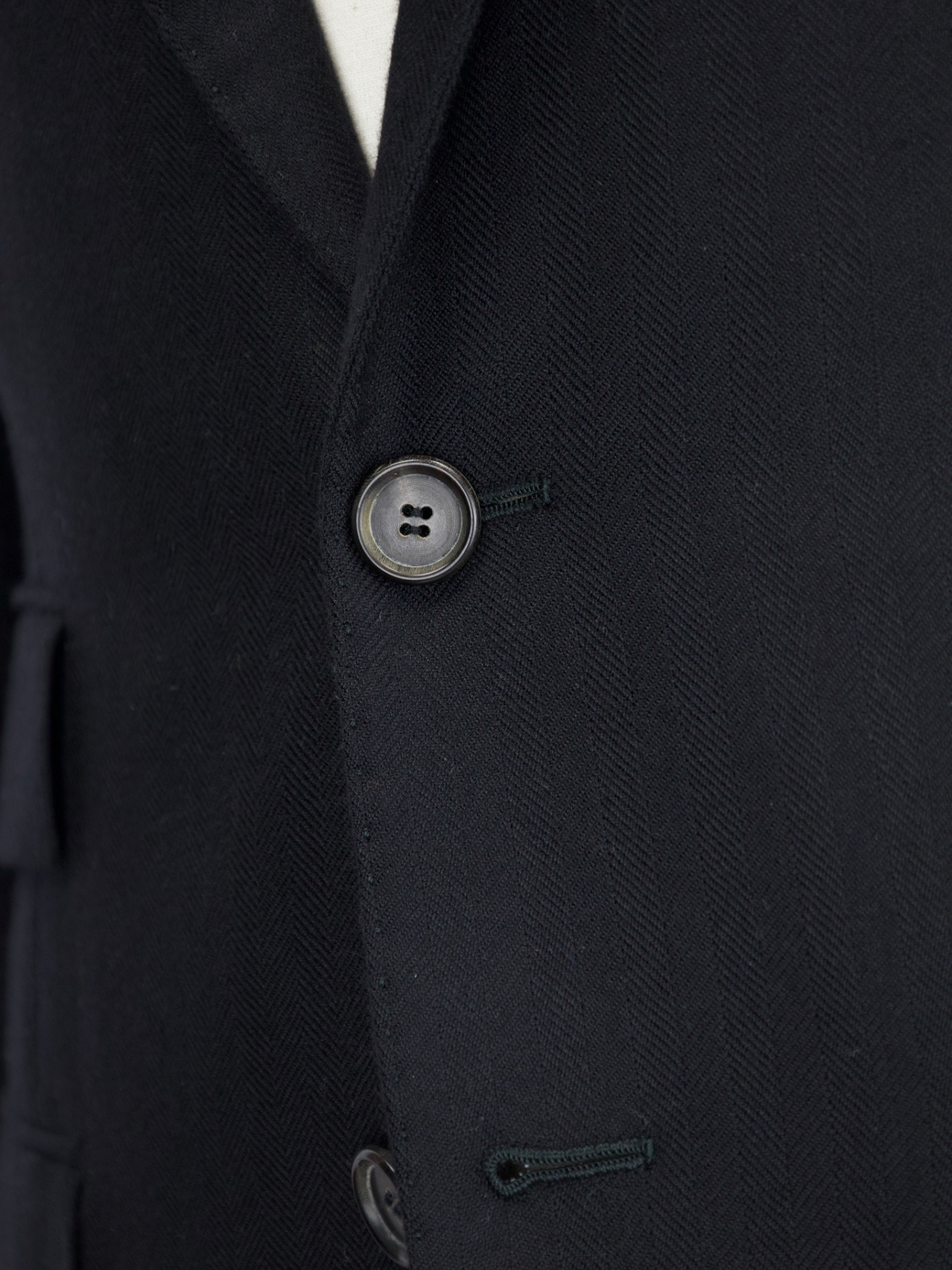 The ‘tre bottoni stirato a due’, also known as the three rolling on two lapel style, is perhaps the most infamous characteristic of the Neapolitan style jacket. The top button and buttonhole are ornamental, so are left unbuttoned. As the lapel rolls down it elegantly folds over the top button and stops just 4 cm above the second button creating the distinct roll of the lapel the style is known for. As it is intended to remain unbuttoned, the top buttonhole is actually made inside out so the beautiful side will still be visible.