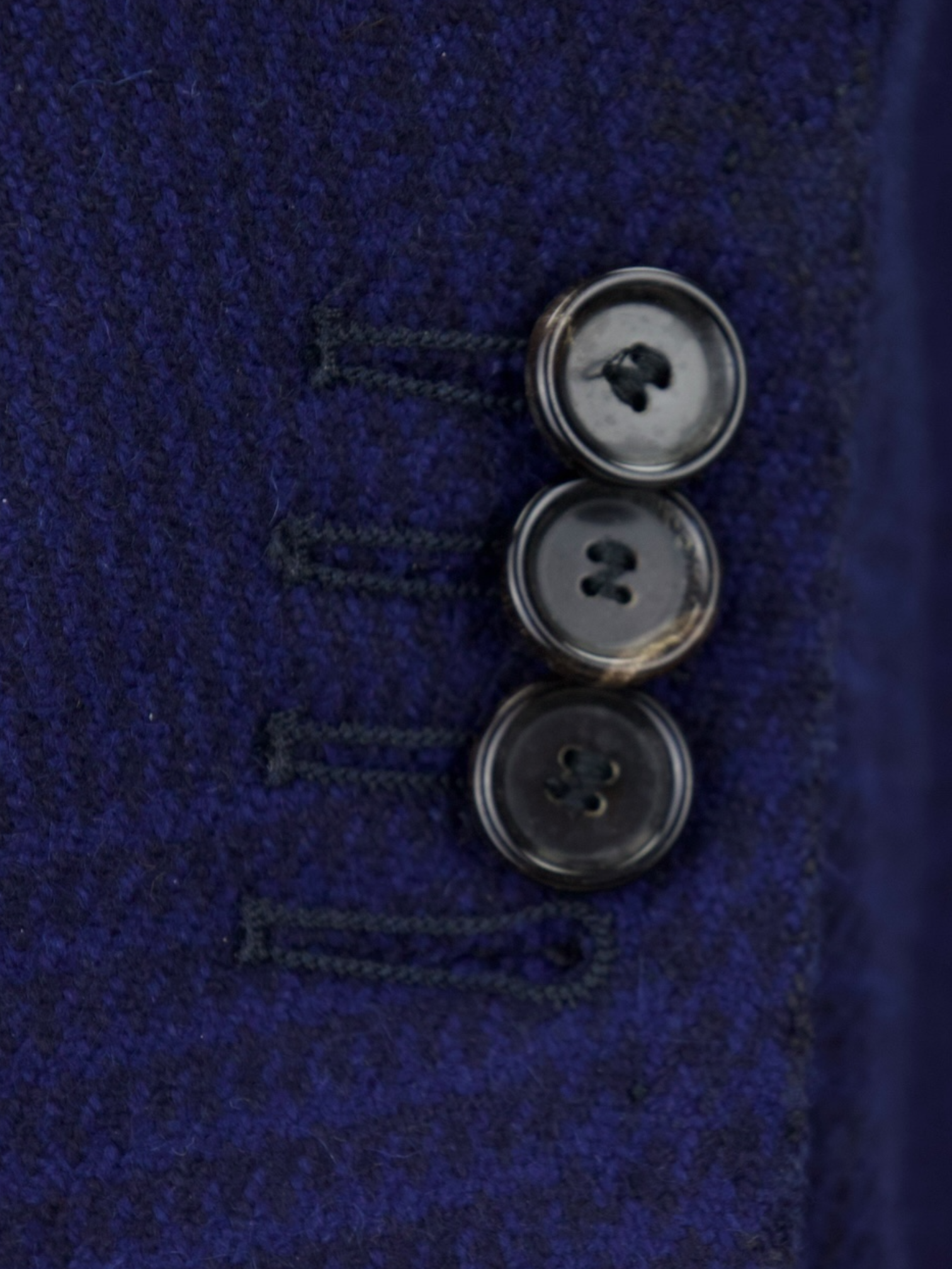 Also known as stacked buttons or waterfall buttons, kissing buttons are associated with Italian tailoring as Italian tailors make their jacket sleeve buttons in the kissing style. In this style, buttons touch each other and overlap one another. Handmade buttonholes; Even this step, apparently the simplest, is treated with an abundance of detail. Attaching the buttons is a job that requires patience and must be completed to perfection.