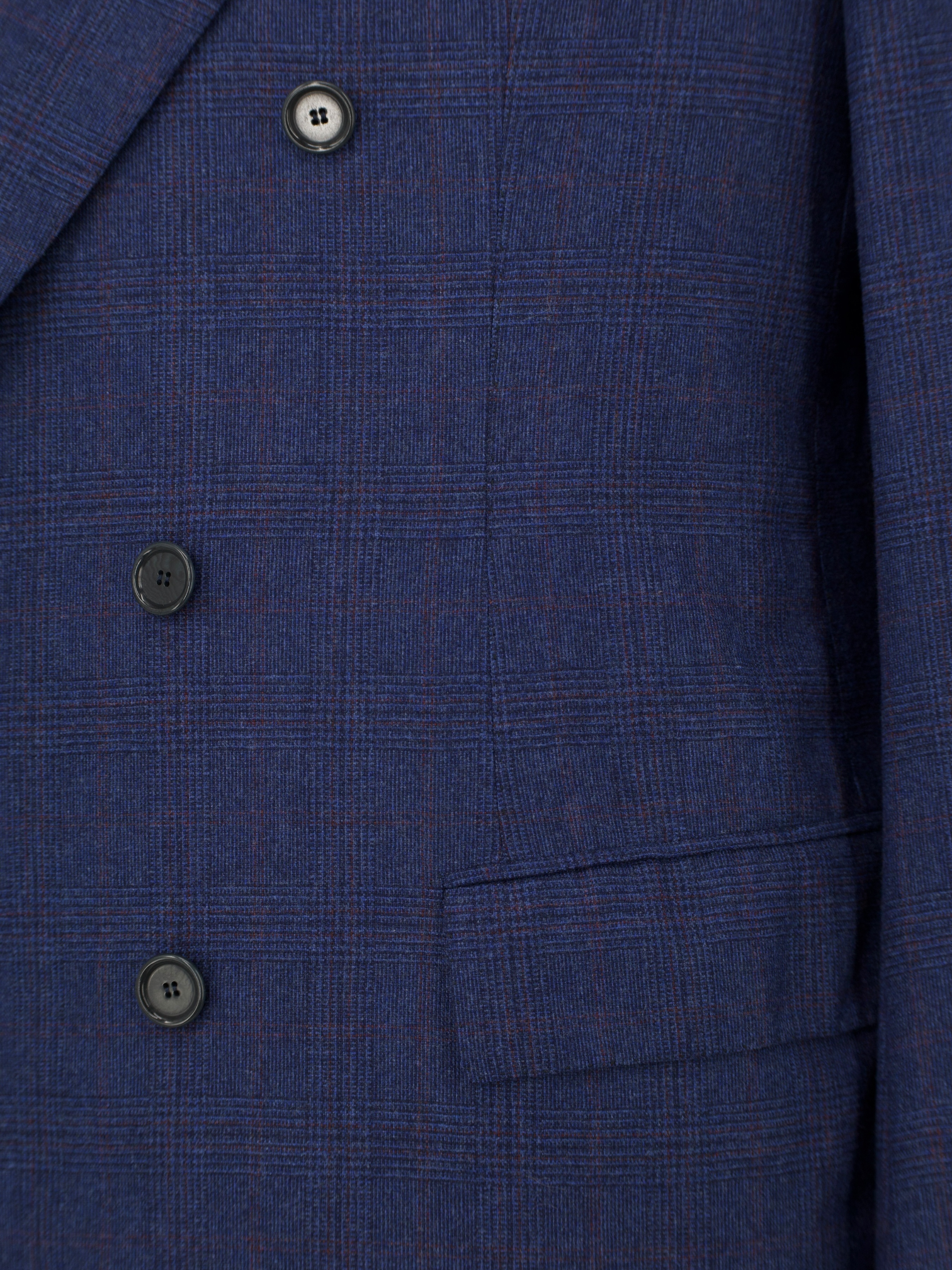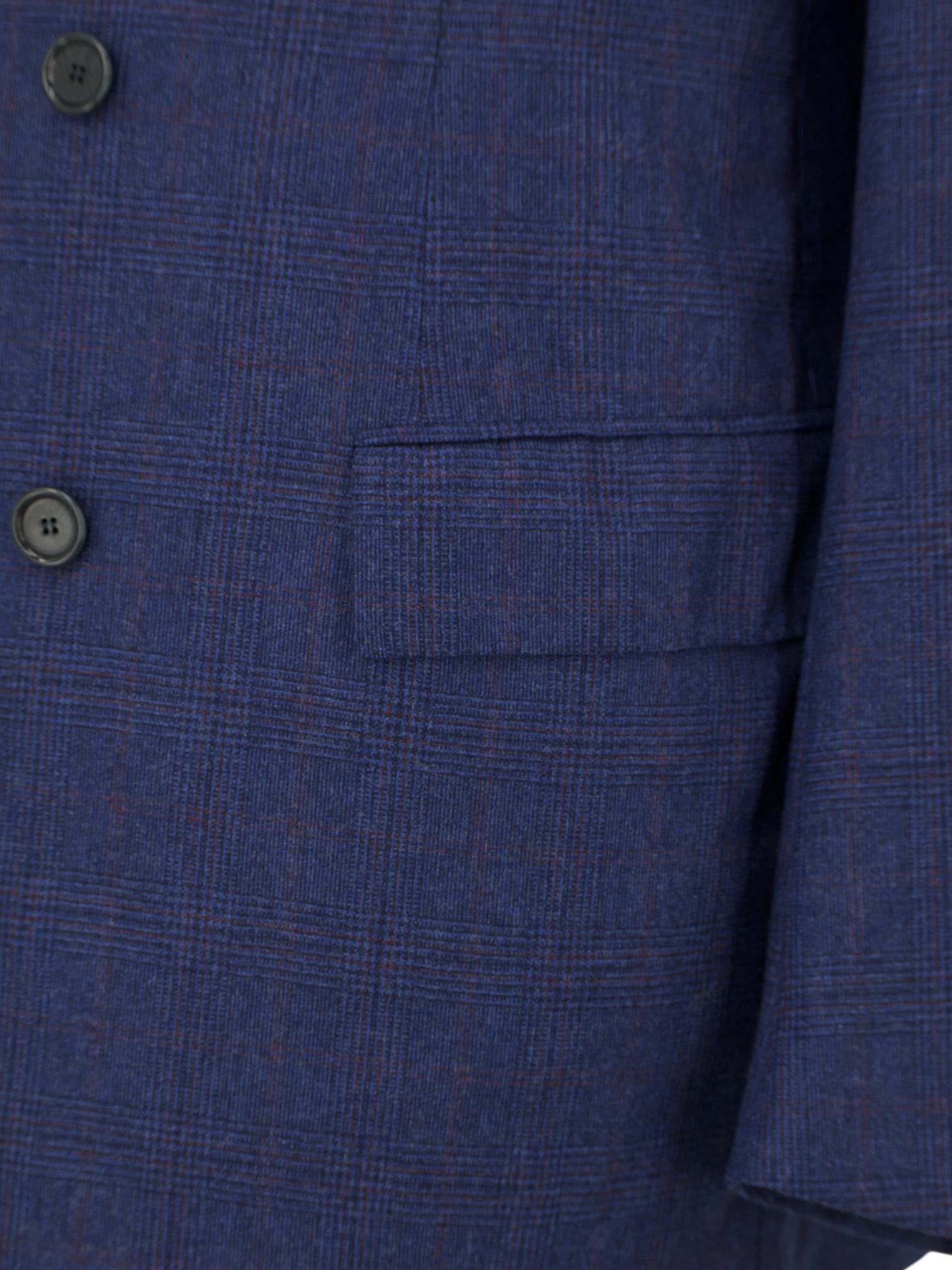 Discover the refined complexity of this Cesare Attolini double-breasted suit, tailored in a luxurious blend of Super 170’s wool and cashmere. The blue and red glenplaid pattern offers subtle depth with a touch of flair, perfectly balanced by the natural softness and fluid drape of the fabric. Broad peak lapels, horn buttons, flap pockets and a strong, elegant silhouette make this a standout piece for the gentleman who favours timeless structure with a distinctive edge. The trousers are cut with a flat front, belt loops and turn-ups, completing the look with classic precision.