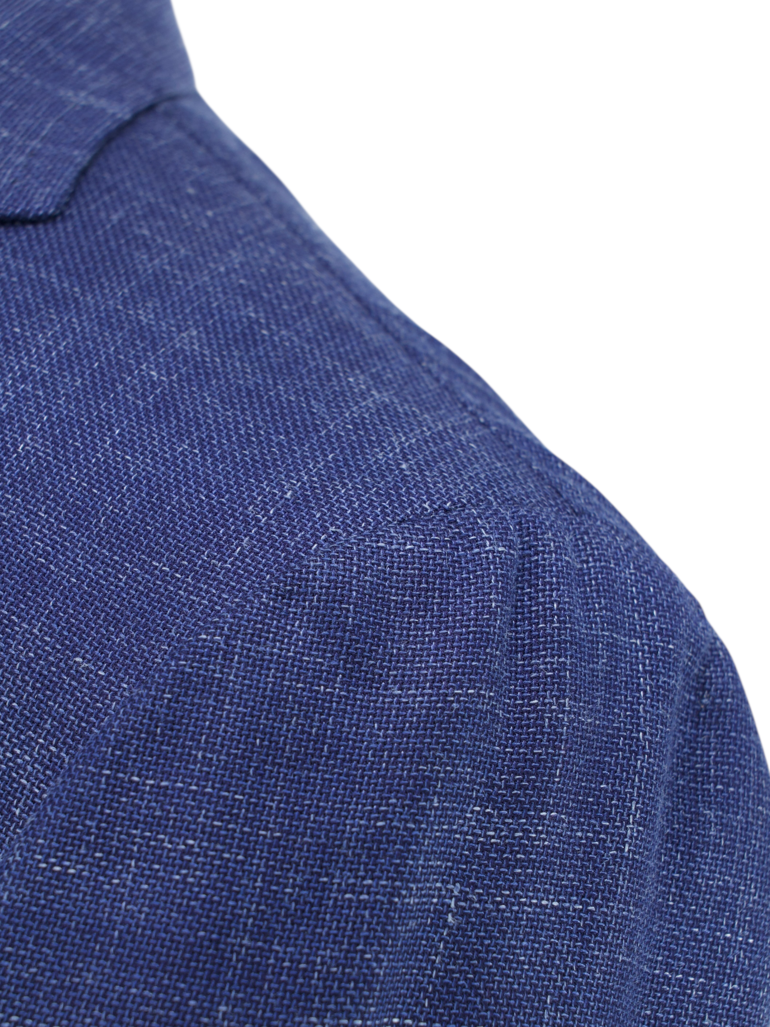 Discover the Cesare Attolini Blue Wool, Silk and Linen Hopsack Jacket, a quintessential expression of Neapolitan summer tailoring. Woven in a dry, open-weave hopsack that blends breathable wool, soft silk and crisp linen, this fabric offers lightness with structure, perfect for the warm season. The saturated blue tone is enhanced by texture and depth, while classic notch lapels, patch pockets, and silvery grey mother-of-pearl buttons bring an elegant nonchalance. Doppio impuntura, the signature double pick stitching along the lapels and pockets, adds a subtle yet refined artisanal touch that sets the tone for the entire jacket.