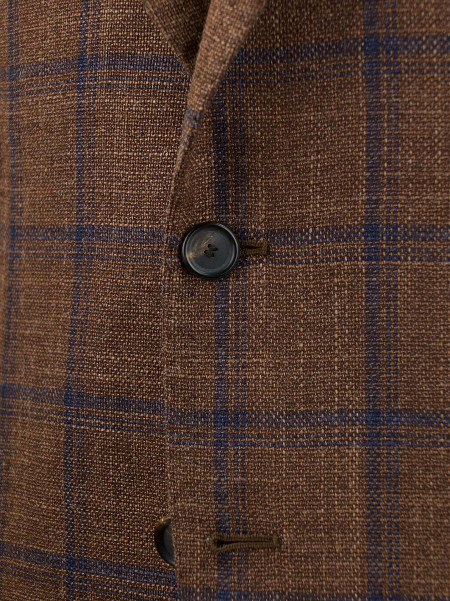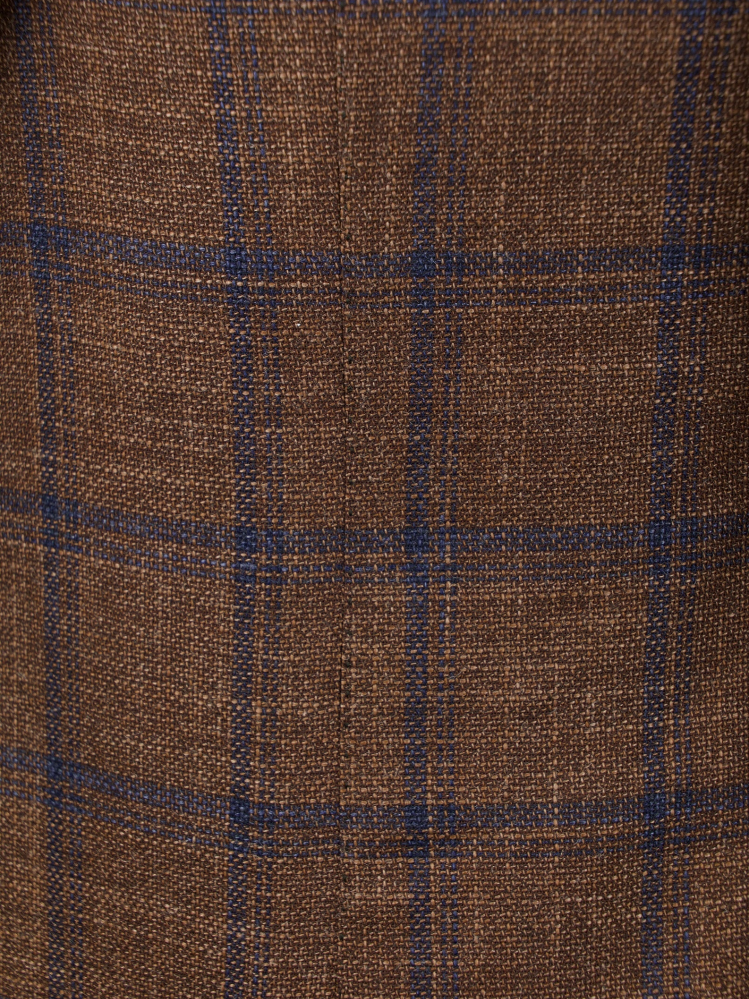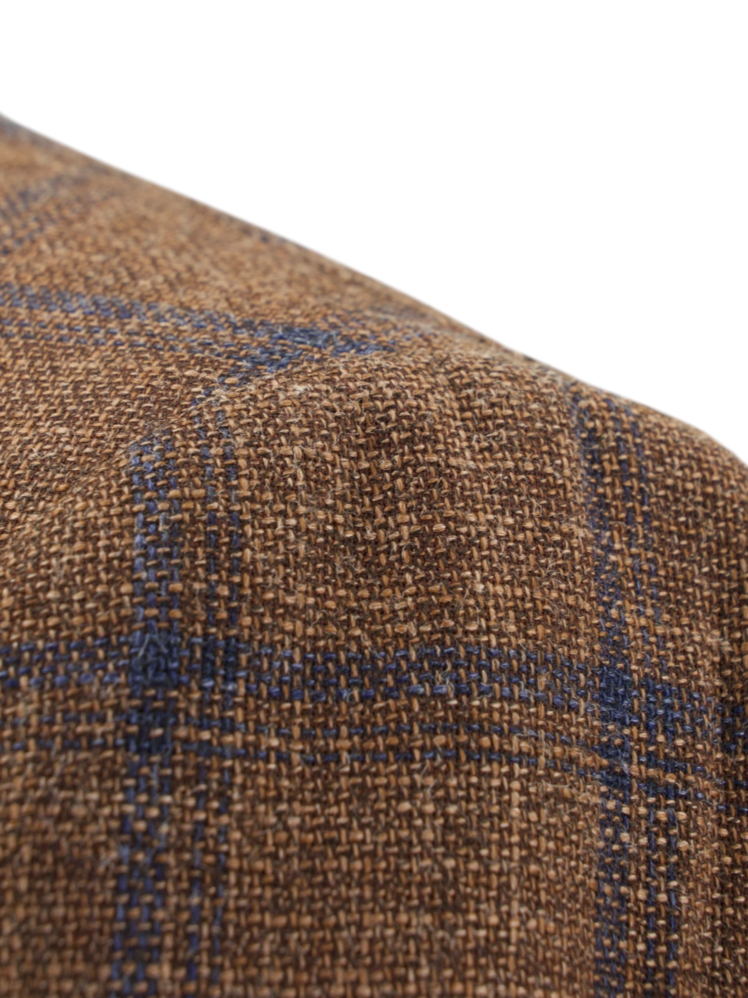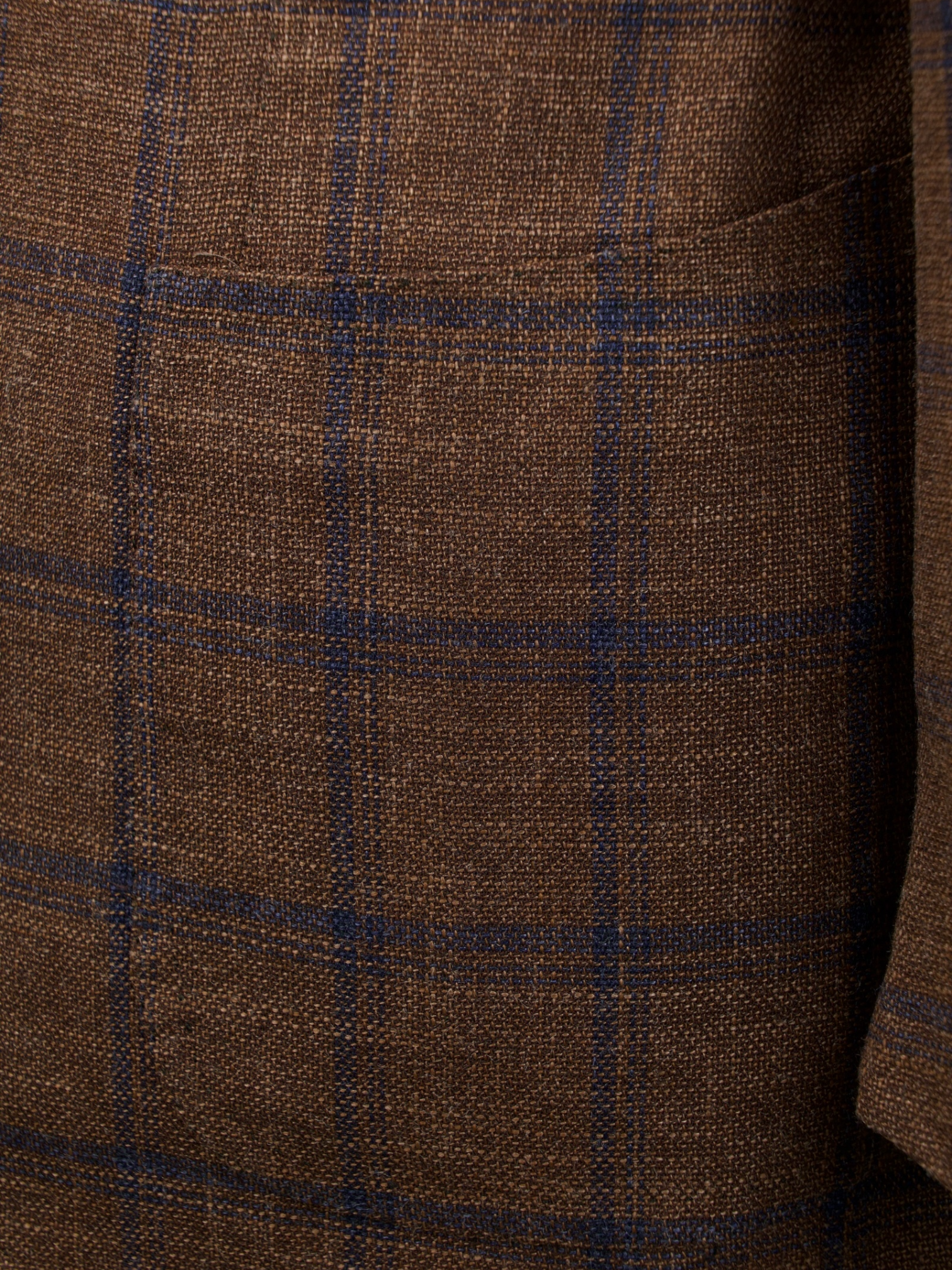 Discover the Cesare Attolini chestnut brown hopsack jacket, a quietly striking piece that pairs earthy depth with refined pattern. Woven from a lightweight blend of wool and silk, the hopsack fabric offers a dry, open texture ideal for milder temperatures. Its rich chestnut undertone is crossed with a soft blue windowpane—just enough contrast to catch the eye without tipping into boldness. The jacket features classic notch lapels, is half lined for breathable ease, and is finished with Attolini’s distinctive doppio impuntura, the subtle double stitching that frames the lapel and pockets with artisanal intent.