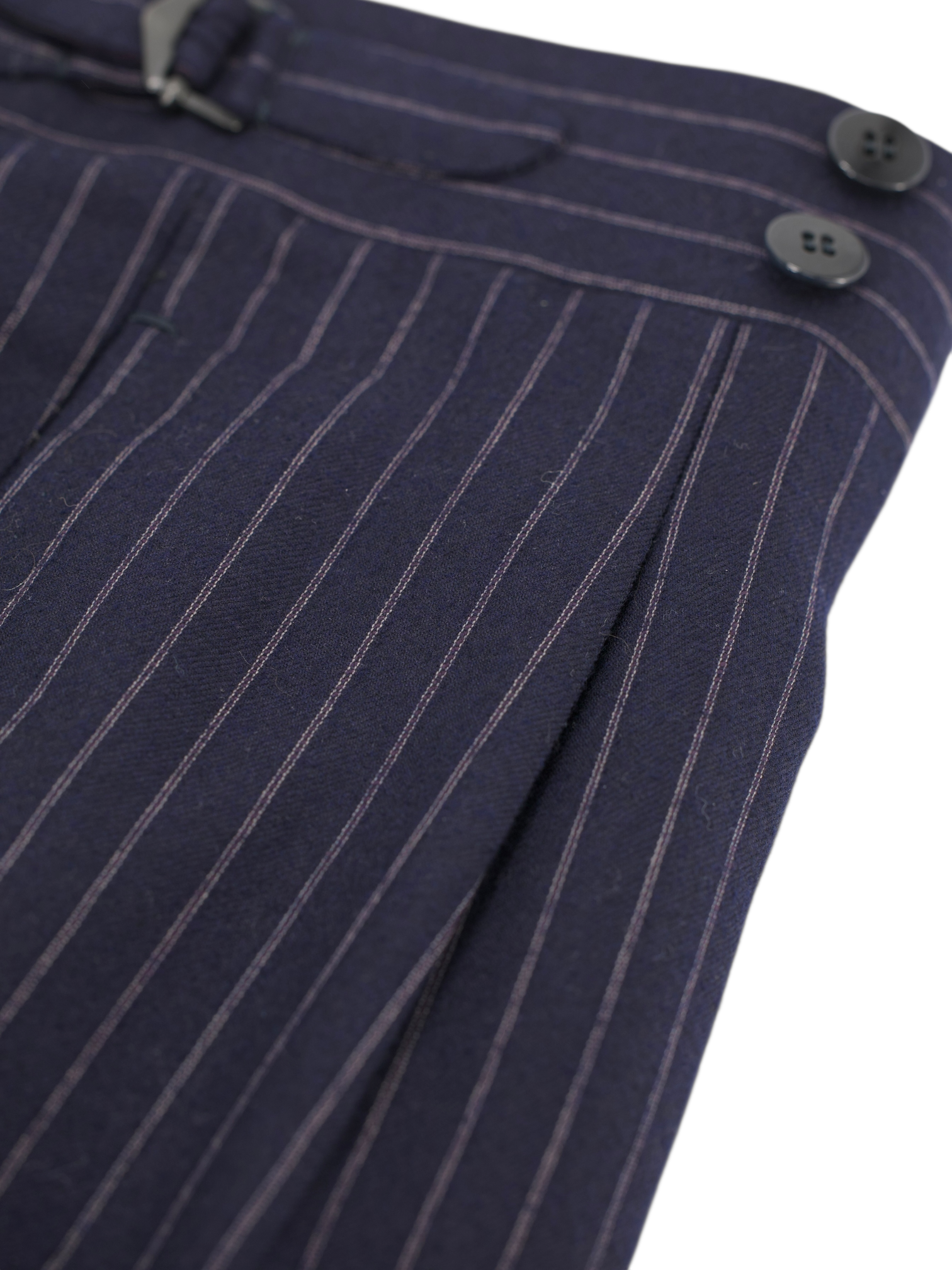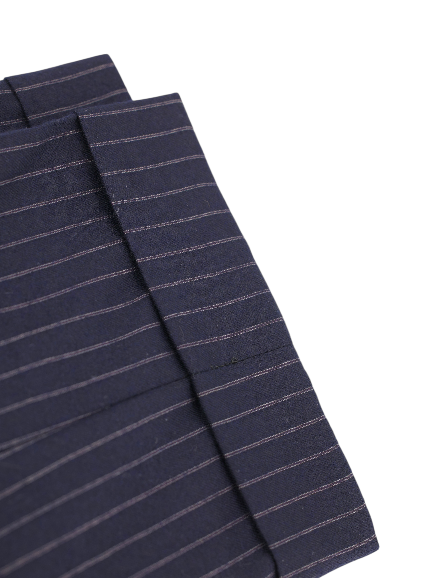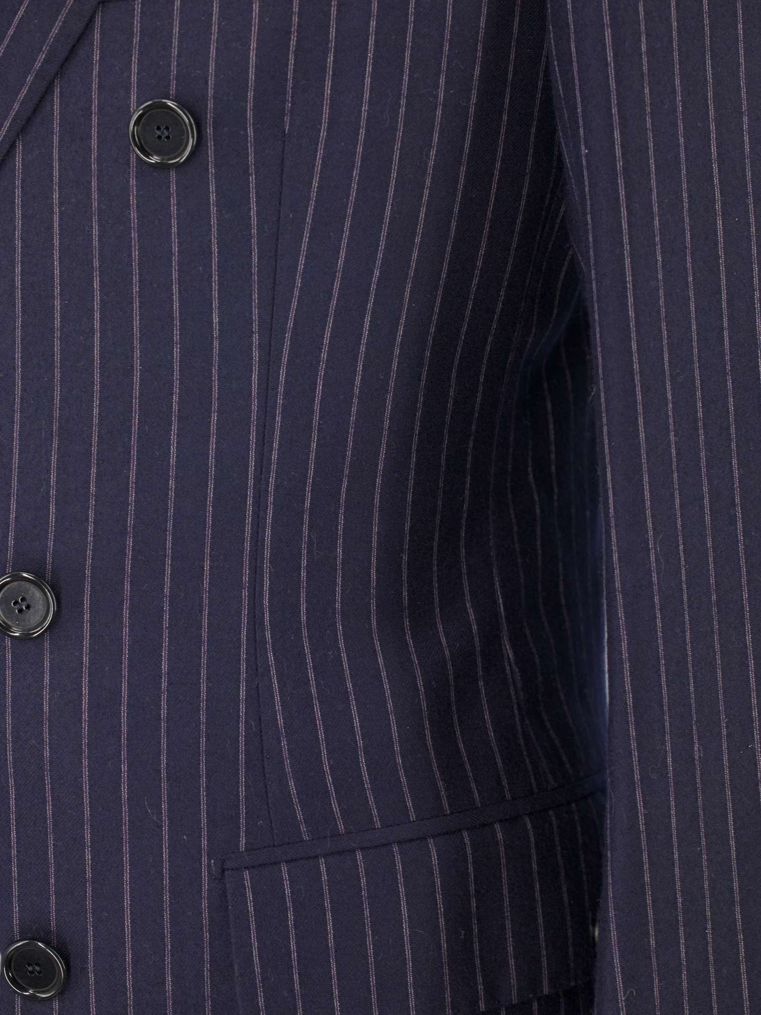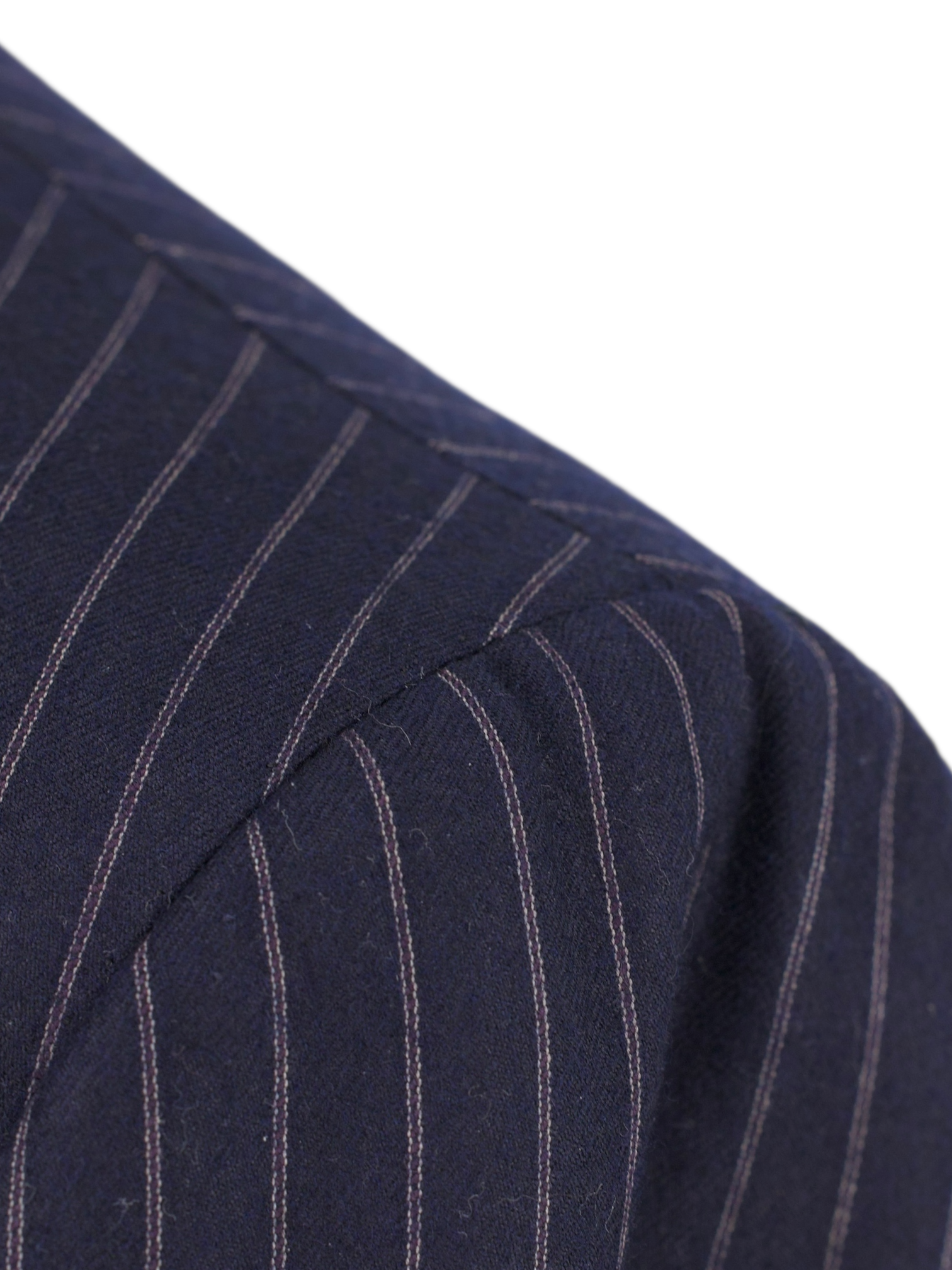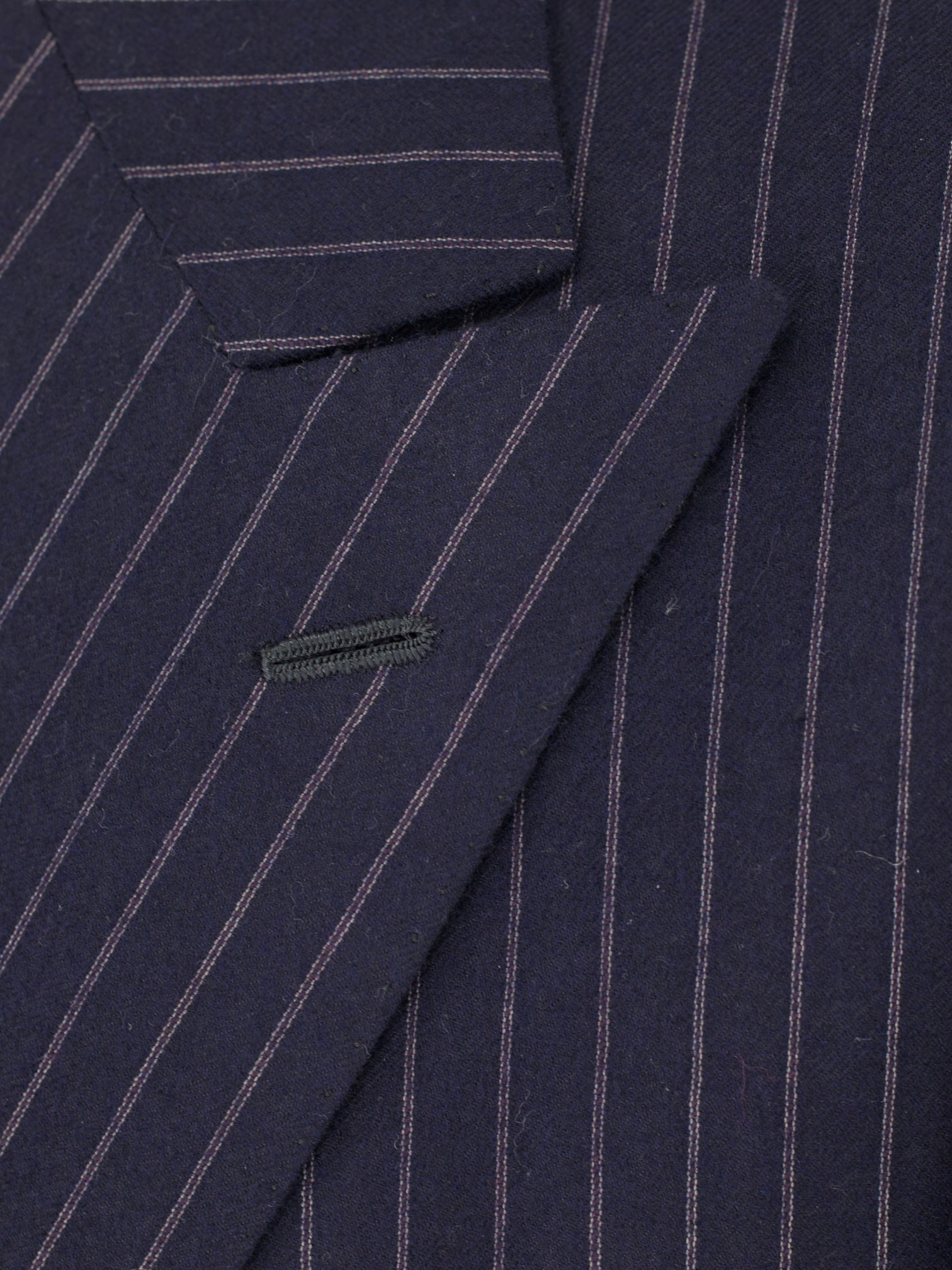 Discover the refined power of this Cesare Attolini double-breasted suit, tailored from a dark blue blend of Super 120’s wool and cashmere in a richly detailed pinstripe. The fabric has a soft, brushed flannel-like touch, giving it warmth and texture ideally suited to fall and winter. The stripe itself is distinctive, with two white edges framing a subtle red line that adds remarkable depth. The jacket features peak lapels, handmade buttonholes, and a six-button Neapolitan double-breasted configuration that balances elegance with presence. The accompanying trousers are finished with side adjusters and an extended two-button tab for secure fastening.