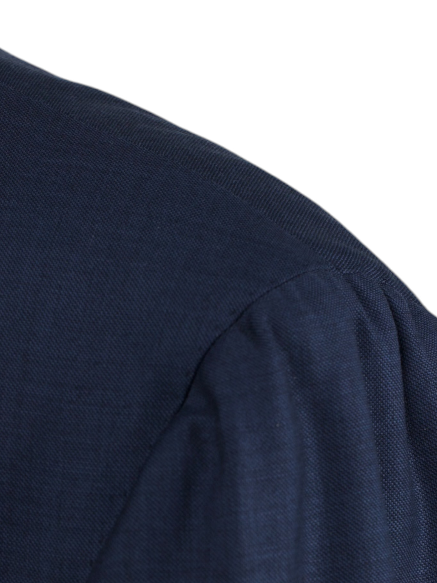 Spalla Camicia roughly translates to 'shirt sleeve' in Italian and is a shoulder style created and popularized by Neapolitan tailors. The name 'shirt sleeve' was so coined due to the characteristic shirring found at the sleeve's head where the fullness of the larger sleeve collapses. Rather than having the head of the sleeve turned back and stitched inside, the head is lapped under and stitched along the top.