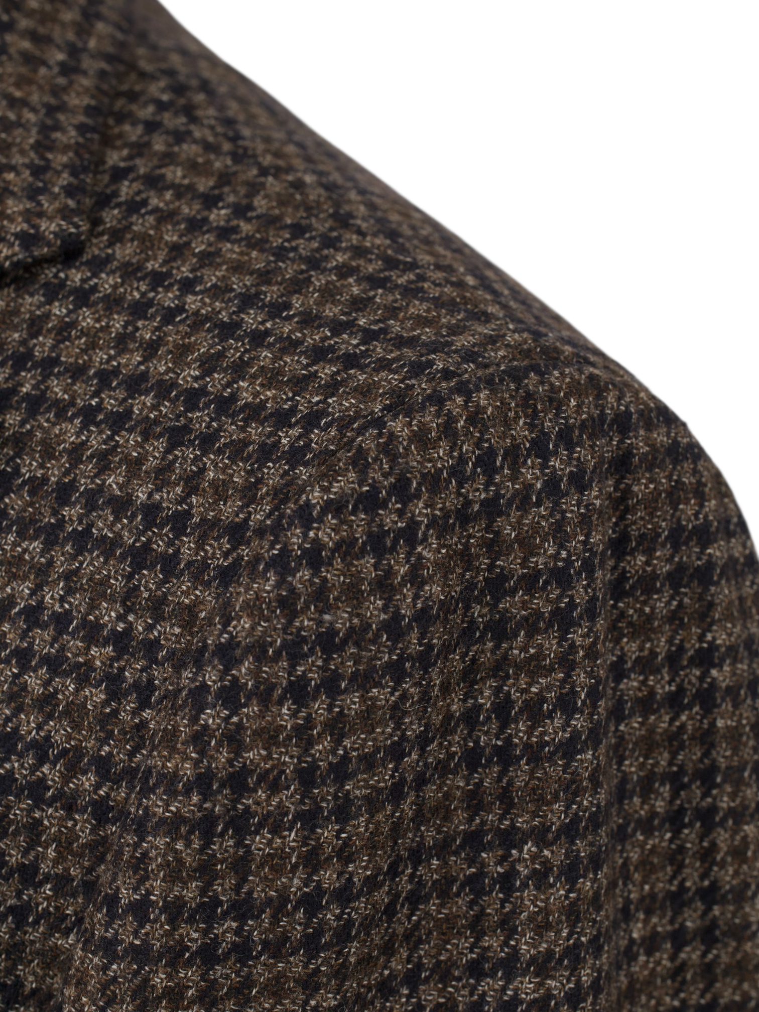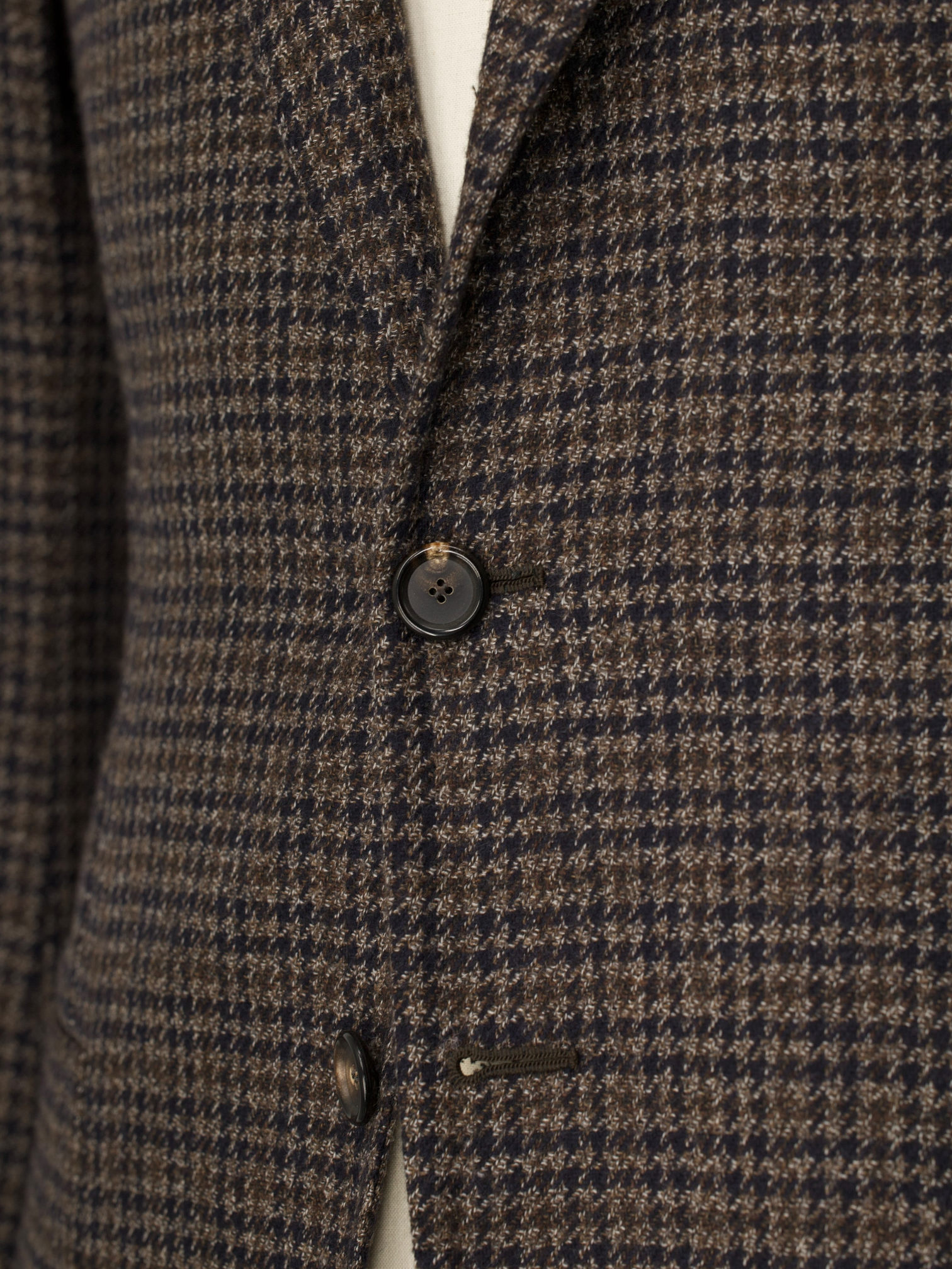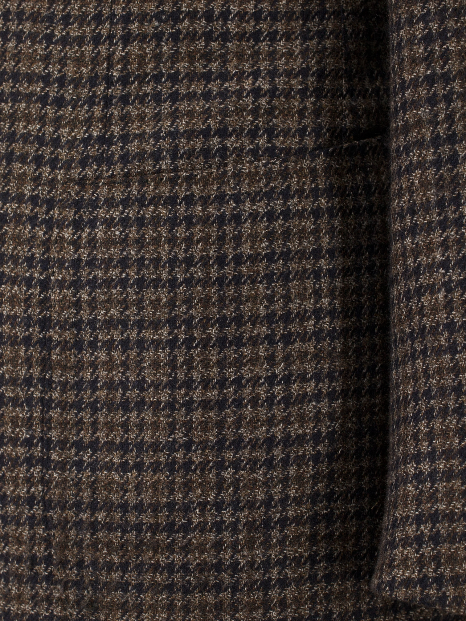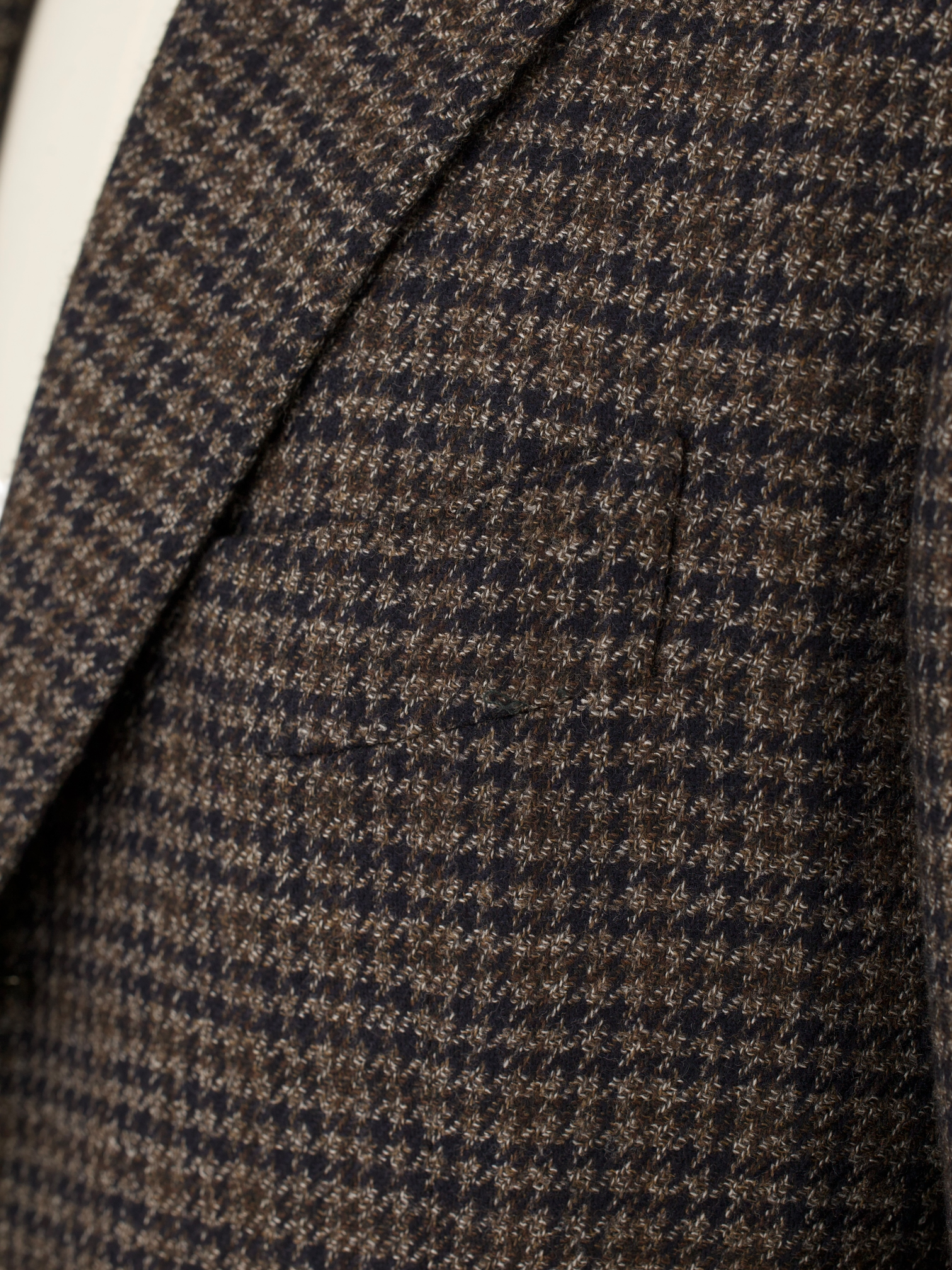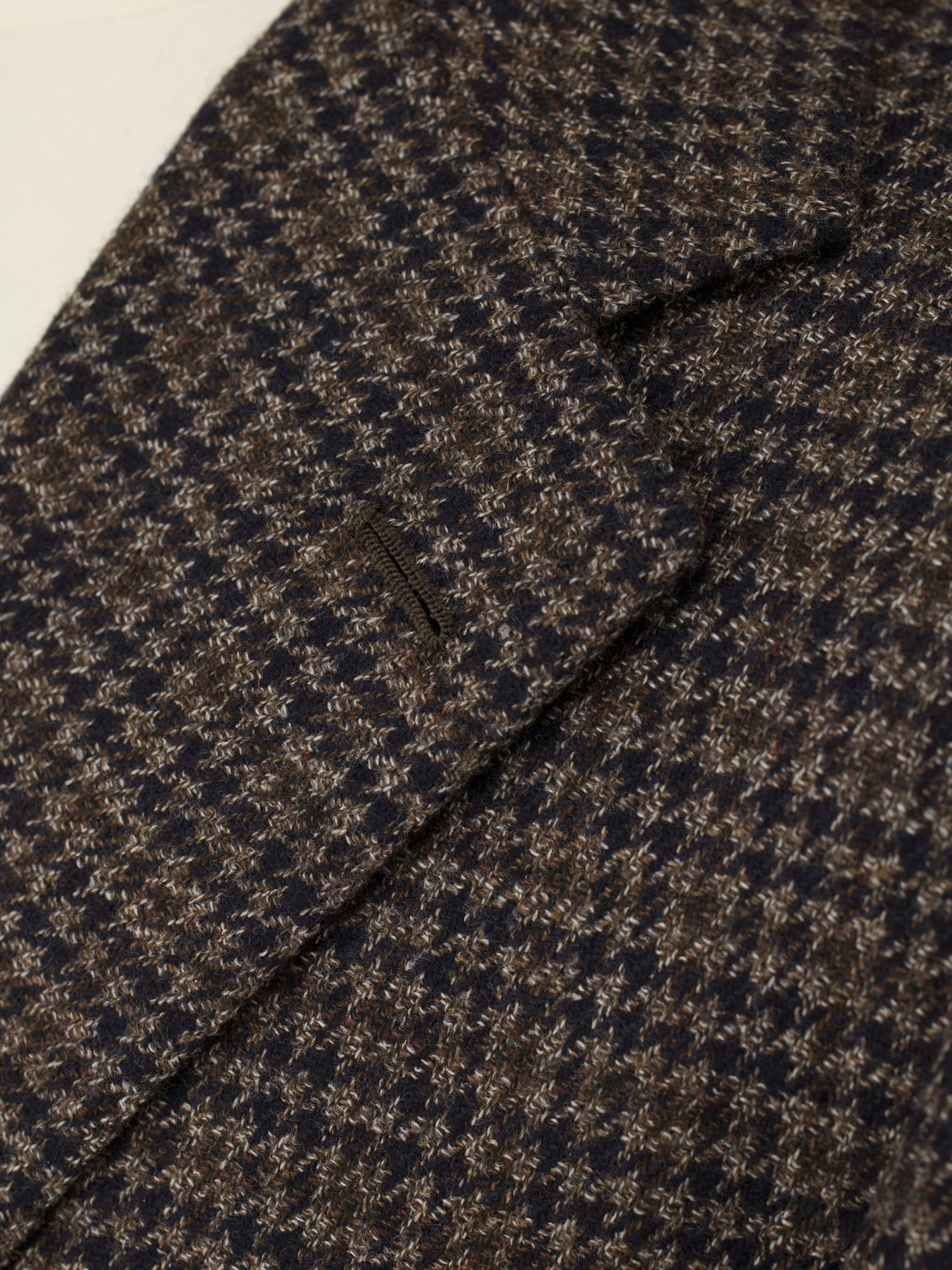 Discover the textured elegance of this Cesare Attolini jacket, tailored in a dark brown pure wool with a classic gun check pattern that adds depth and rural character without sacrificing urban sophistication. Featuring notch lapels, patch pockets, and a soft spalla camicia shoulder, it is shaped with Attolini’s signature ease and balance. The half-lined interior allows the fabric to breathe and move naturally, making it well-suited to transitional seasons. Horn buttons and finely sewn handmade buttonholes at the end of the sleeves offer a finishing touch rooted in quiet craftsmanship.