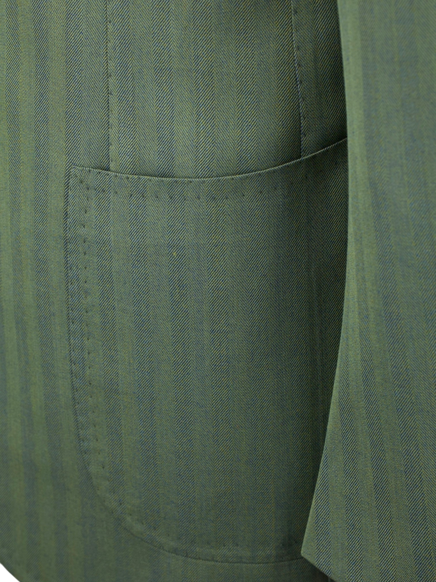 The doppio impuntura or ‘double pick stitching’. It is made as a backstitch, which is a highly time consuming process that looks like a little dot on the surface of the fabric. The doppio impuntura runs throughout the sides of the lapel, collar, pockets and shoulder seam. As a visible detail of handwork, it can be seen as the ultimate touch of elegance.