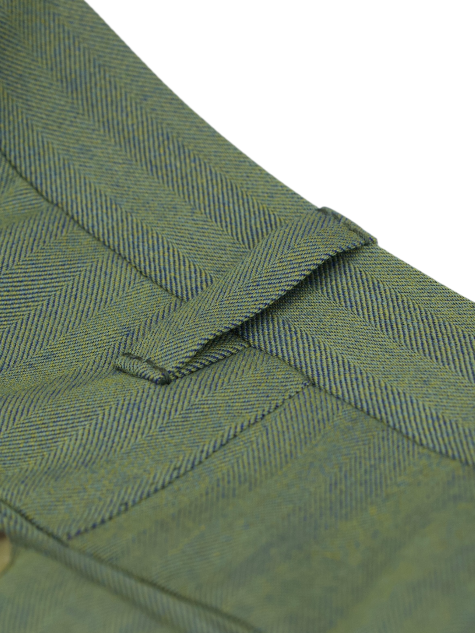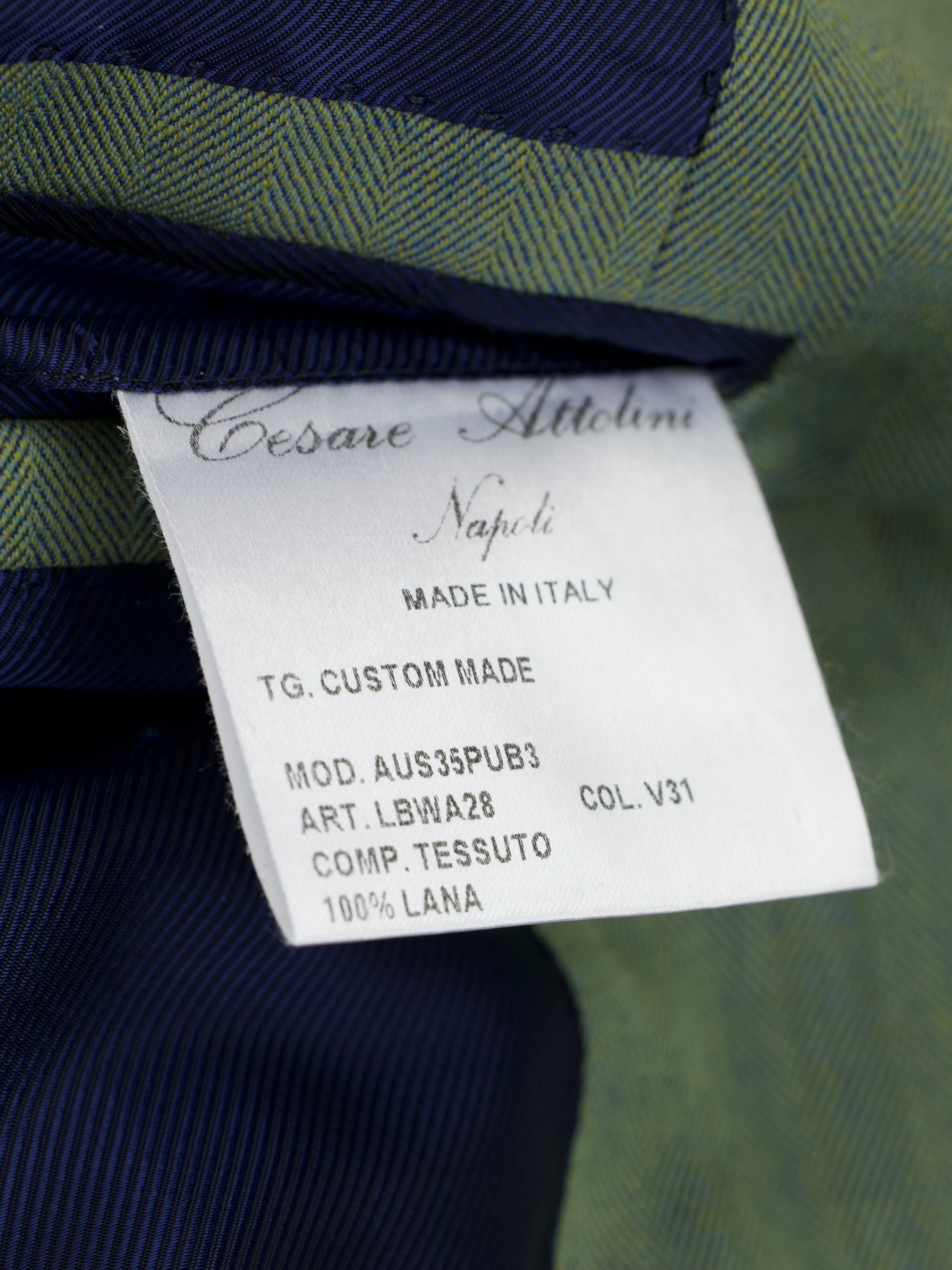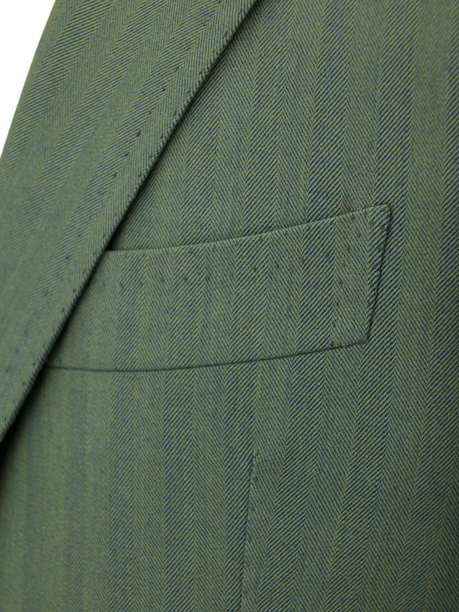 Discover the nuanced elegance of this Cesare Attolini forest-sage green suit, tailored in a refined wool herringbone with a distinctive “Solaro” effect—an iridescent finish that subtly shifts tone under natural light. The green hue blends forest and sage undertones, offering a sophisticated alternative to classic neutrals, particularly well-suited for spring and early autumn. Cut with notch lapels, a softly structured shoulder, and a full canvas construction, the suit is balanced in both color and proportion. Its unique depth makes it equally appropriate for daytime events, refined businesswear, or more expressive formal settings.