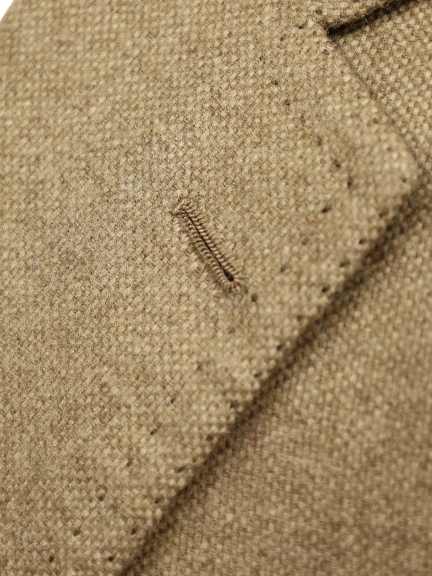 The doppio impuntura or ‘double pick stitching’. It is made as a backstitch, which is a highly time consuming process that looks like a little dot on the surface of the fabric. The doppio impuntura runs throughout the sides of the lapel, collar, pockets and shoulder seam. As a visible detail of handwork, it can be seen as the ultimate touch of elegance.