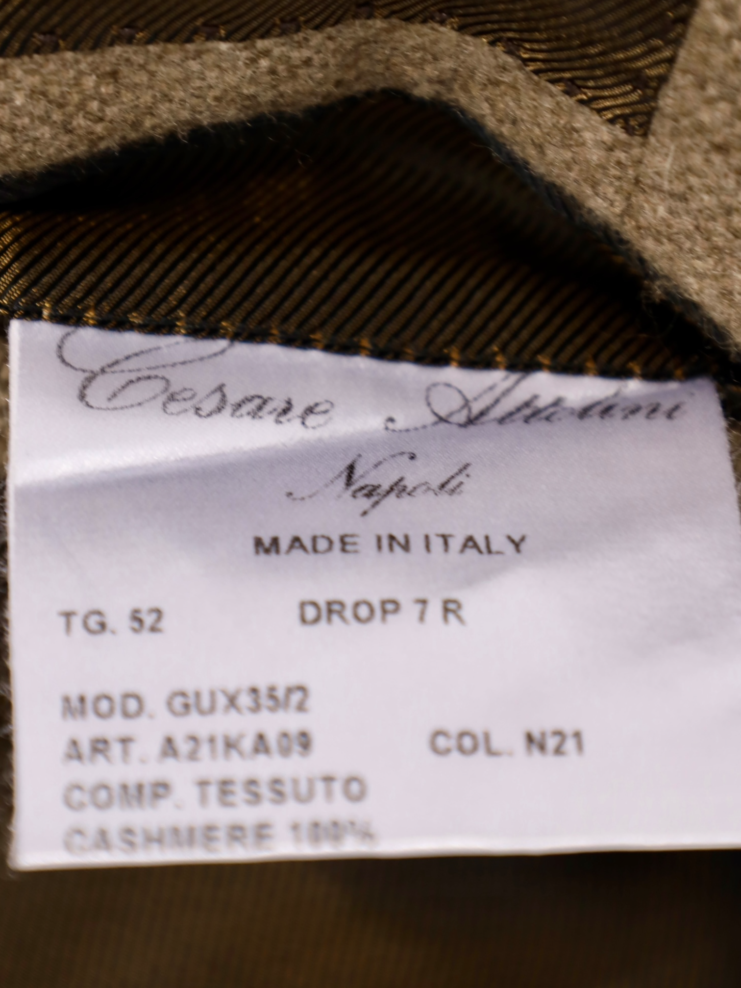 Discover the Cesare Attolini Light Brown Cashmere Jacket, a masterpiece of craftsmanship and style. Made entirely by hand in Cesare Attolini's Casalnuovo tailor’s shop just outside Naples, this jacket exemplifies the meticulous attention to detail for which Attolini is renowned. Crafted from luxurious light brown cashmere, it features the brand's commitment to absolute perfectionism.