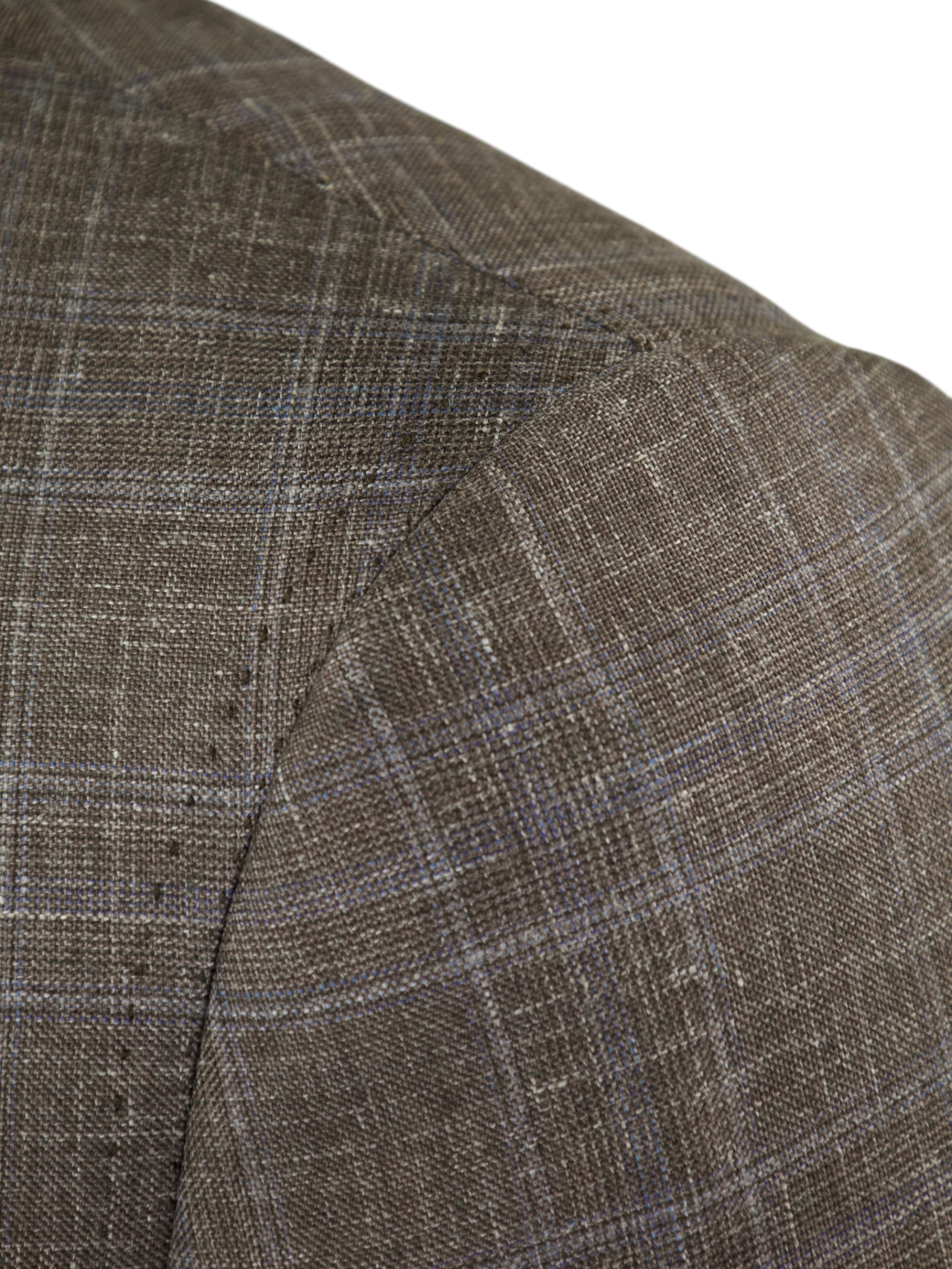 The doppio impuntura or ‘double pick stitching’. It is made as a backstitch, which is a highly time consuming process that looks like a little dot on the surface of the fabric. The doppio impuntura runs throughout the sides of the lapel, collar, pockets and shoulder seam. As a visible detail of handwork, it can be seen as the ultimate touch of elegance.