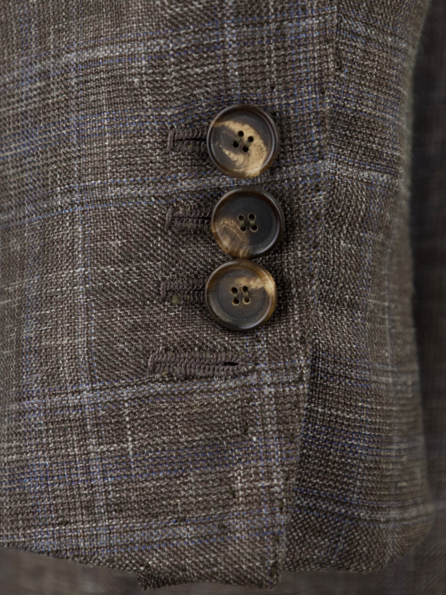 Also known as stacked buttons or waterfall buttons, kissing buttons are associated with Italian tailoring as Italian tailors make their jacket sleeve buttons in the kissing style. In this style, buttons touch each other and overlap one another. Handmade buttonholes; Even this step, apparently the simplest, is treated with an abundance of detail. Attaching the buttons is a job that requires patience and must be completed to perfection.