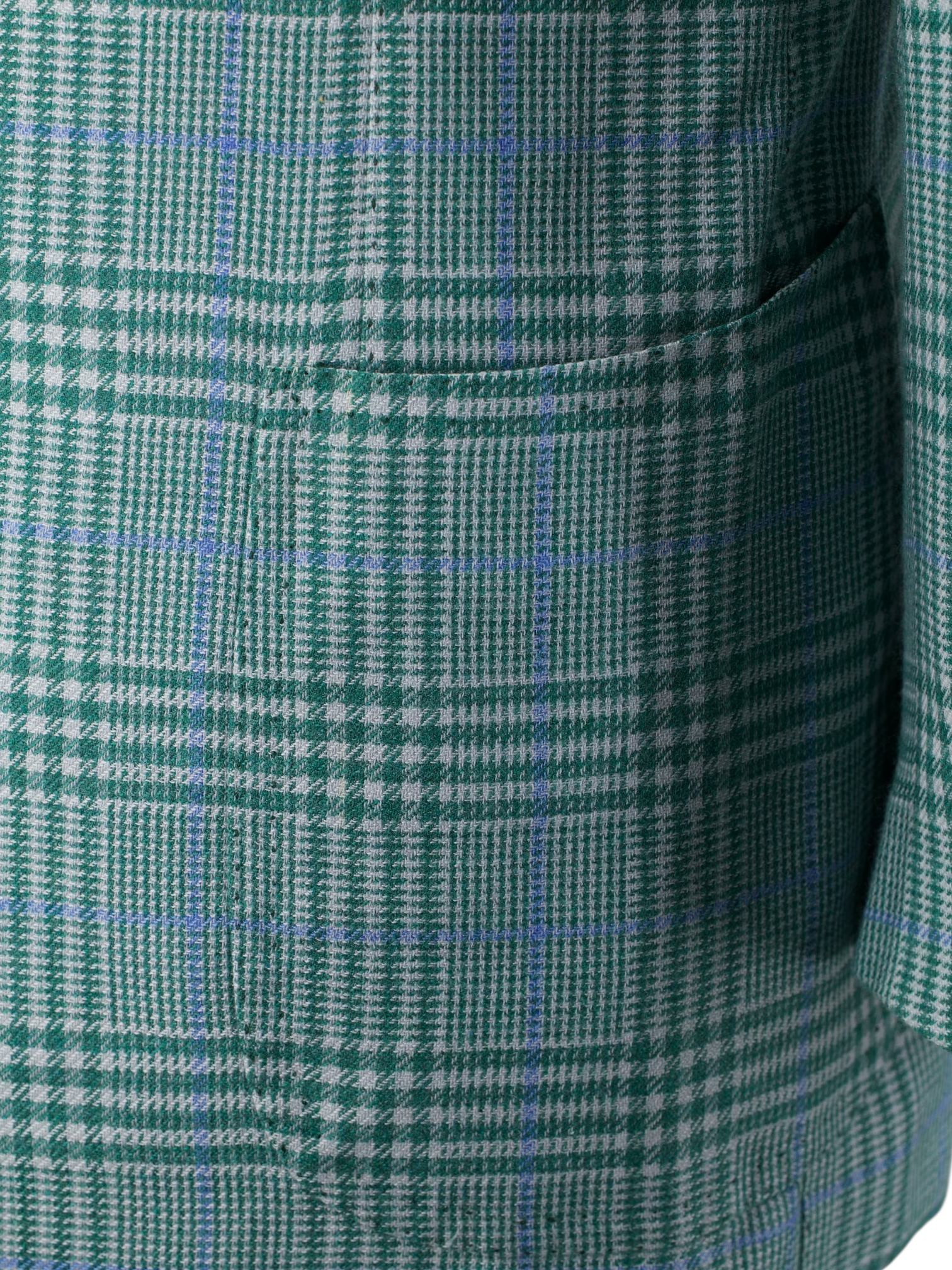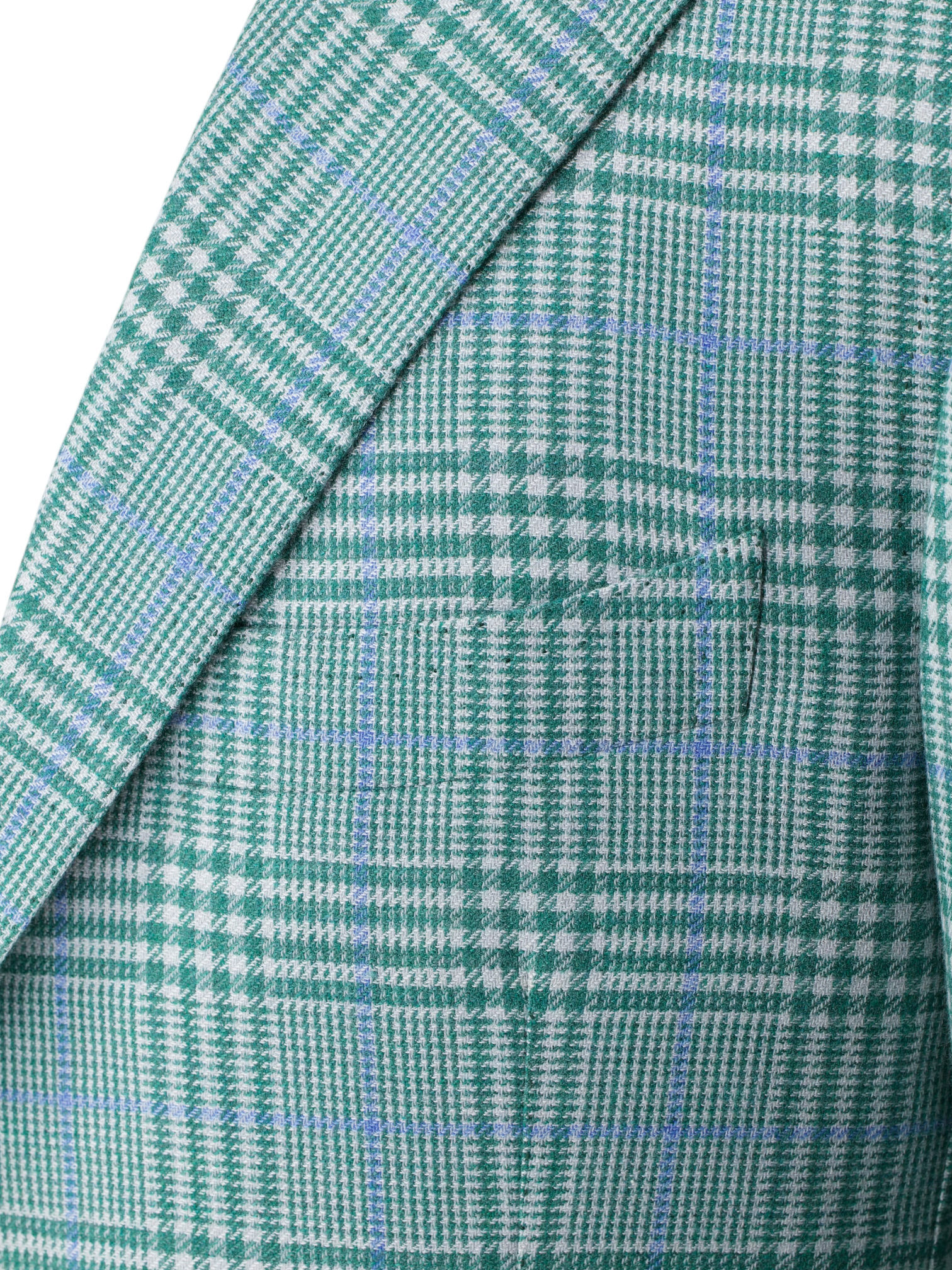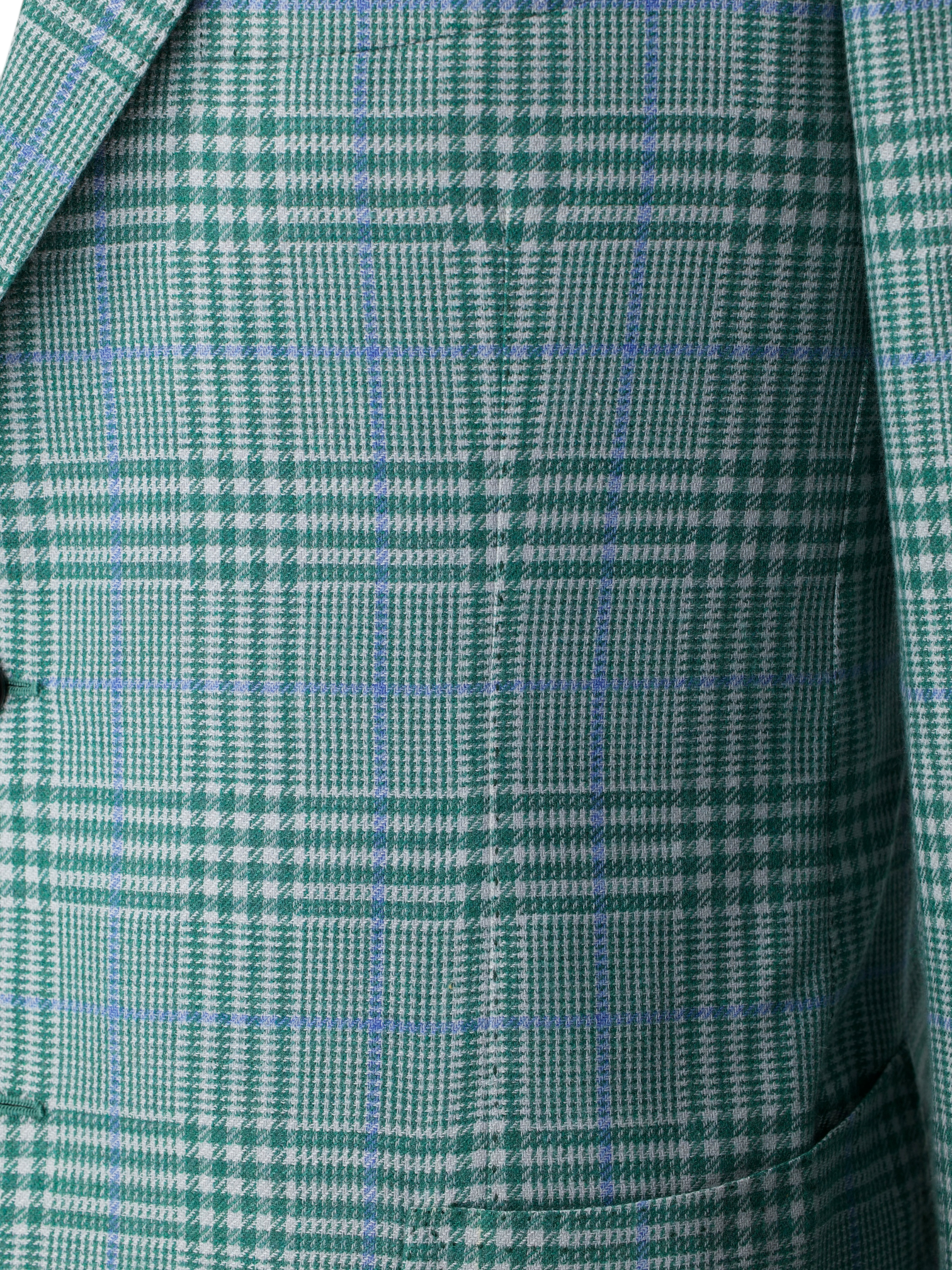 Discover the Cesare Attolini Light Green and Blue Cashmere Silk Glenplaid Jacket, an effortlessly distinctive piece woven in a luxurious cashmere silk blend that feels as refined as it looks. The base cloth carries a light green and white glenplaid undertone, elevated by a light blue windowpane overcheck that adds clarity and dimension. Tailored with notch lapels and left half lined for fluidity, the jacket retains a natural, easy drape. Tasca a pignata patch pockets reinforce its Neapolitan character, while doppio impuntura double pick stitching traces the edges with subtle artisanal definition. It is the sort of quietly confident statement that would feel entirely at home in Attolini’s seasonal Timeless campaign imagery.