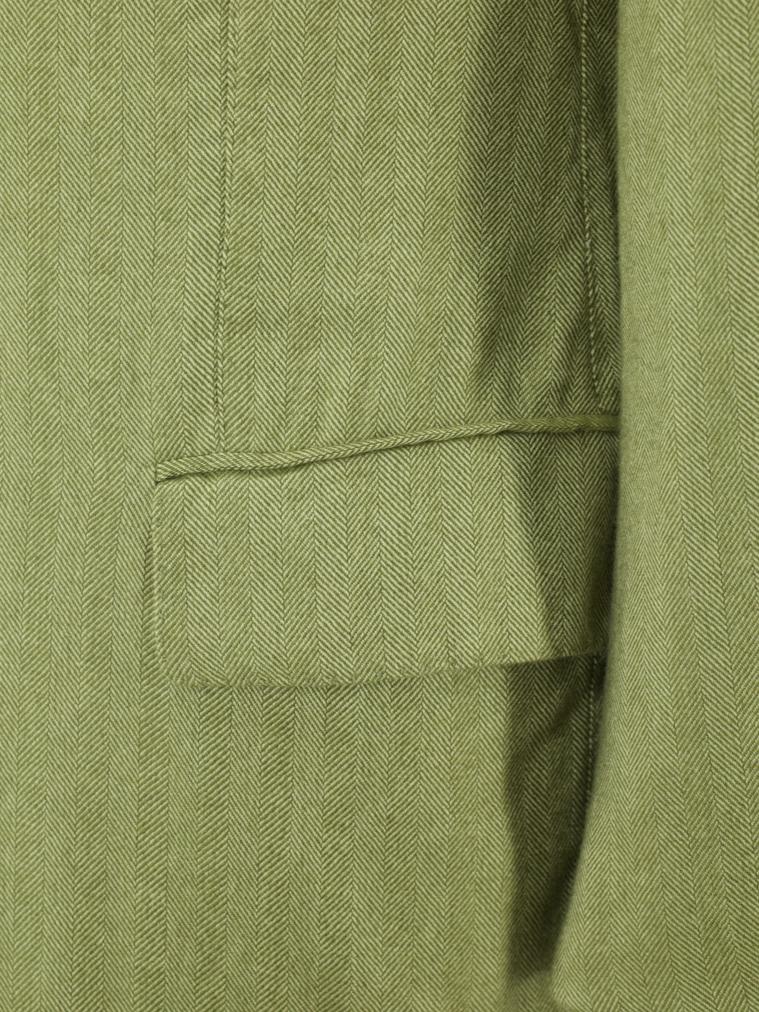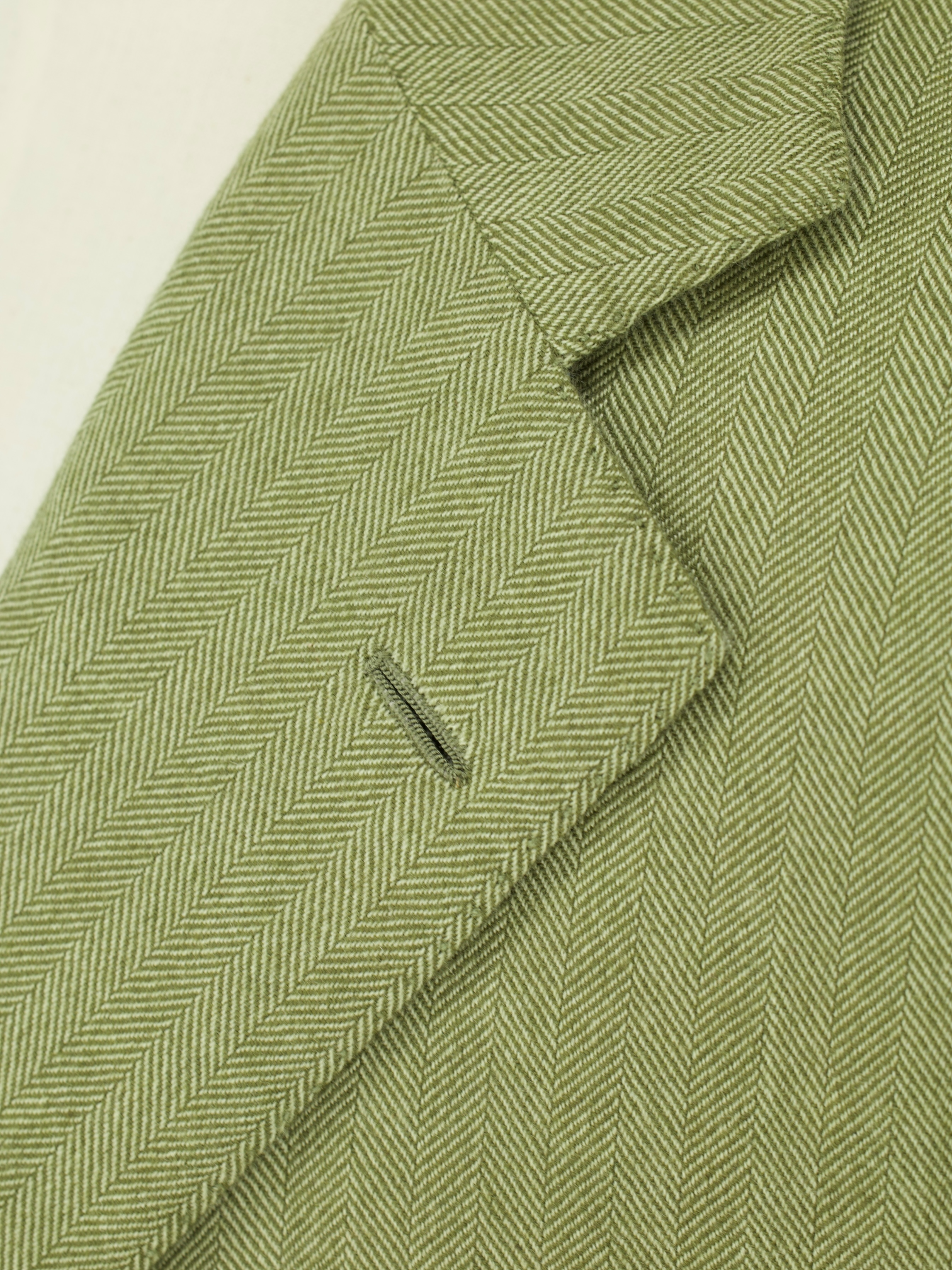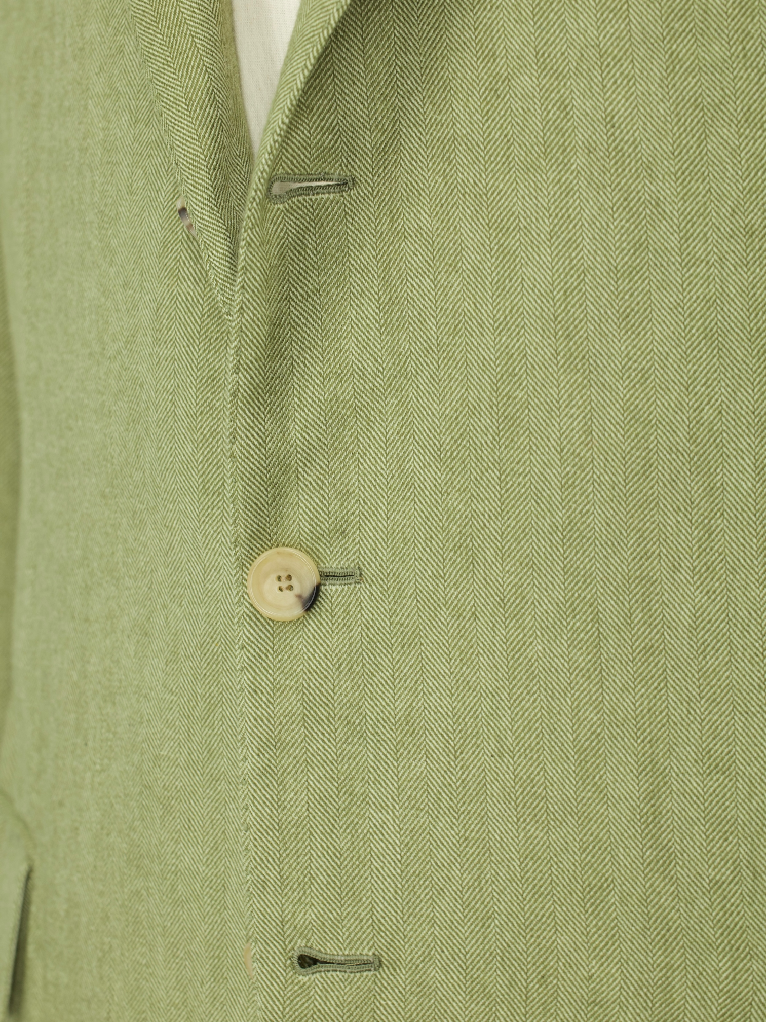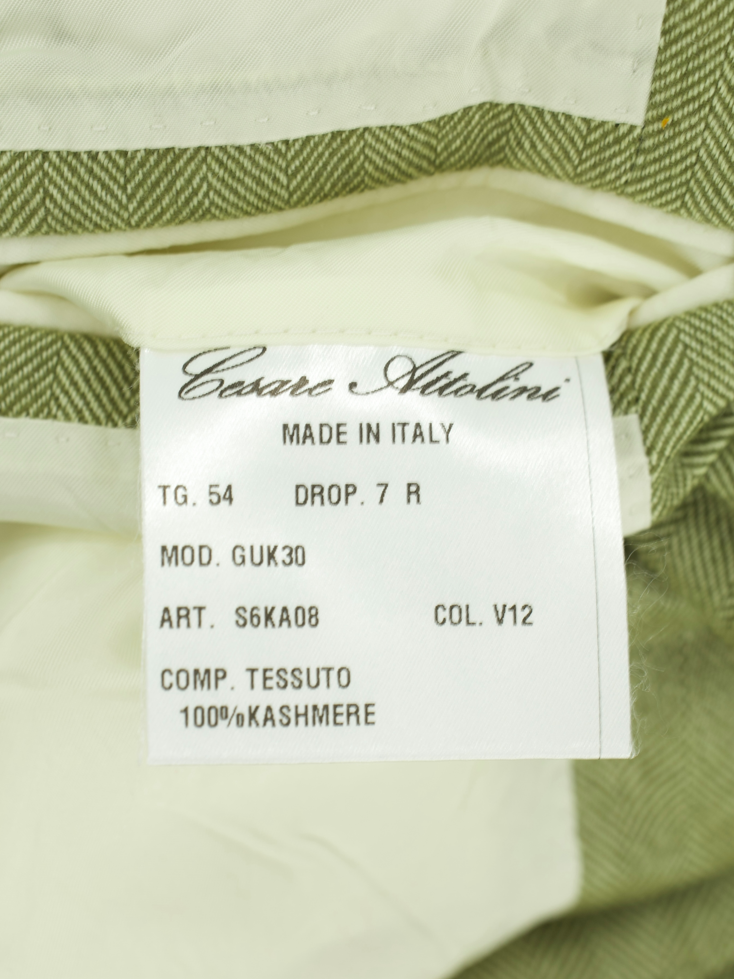 Discover the soft vibrancy of this Cesare Attolini jacket, tailored in pure cashmere with a delicate herringbone weave and a distinctive light green tone that feels both fresh and refined. The fabric offers an exceptionally smooth hand and gentle drape, making it a luxurious yet versatile choice for cooler months. Designed with notch lapels, flap pockets, and a fully lined interior, the silhouette carries the house’s signature balance of elegance and ease. Originally purchased at Dolph Schmid, this piece reflects a discerning eye for refined tailoring with character.