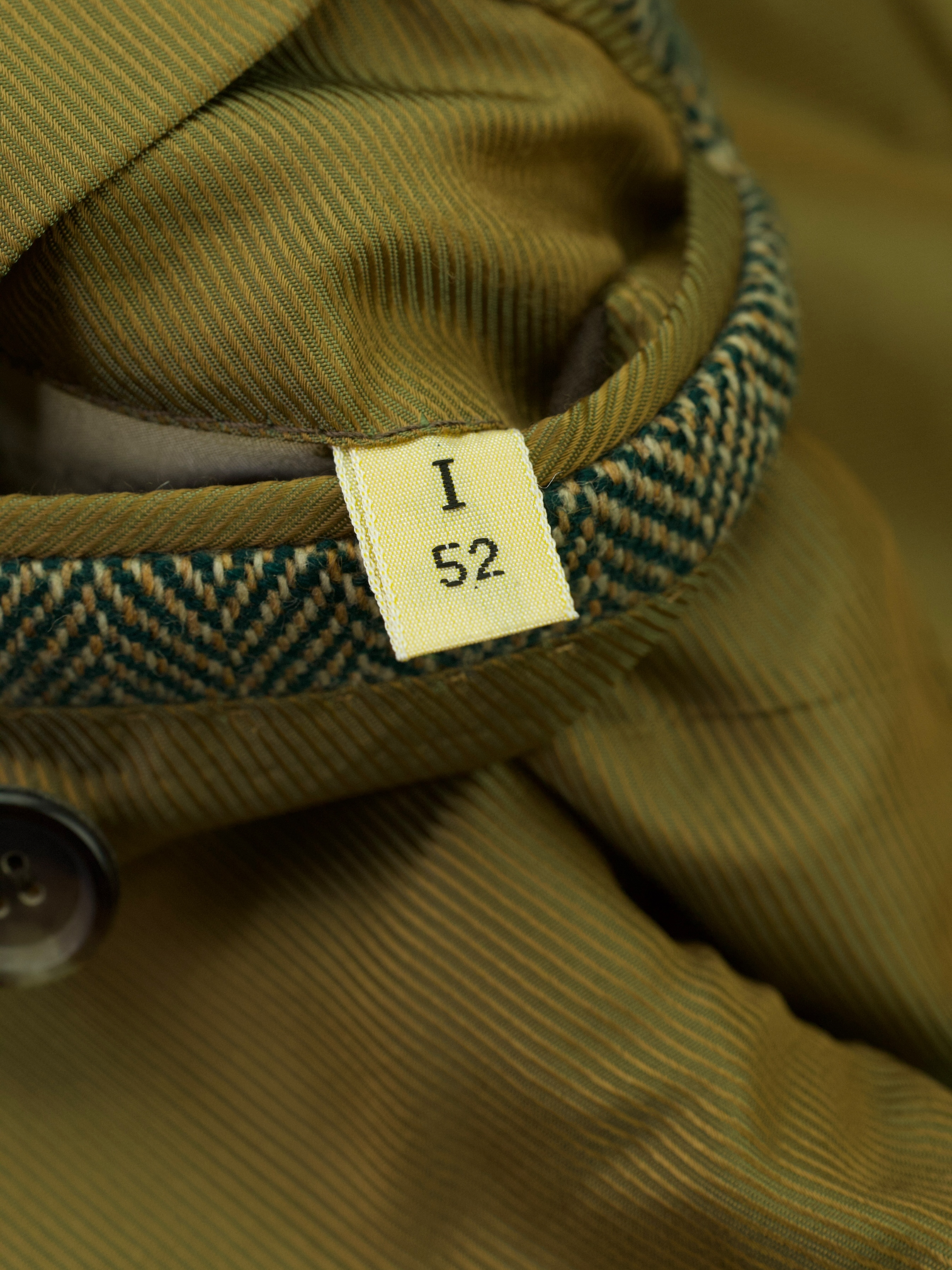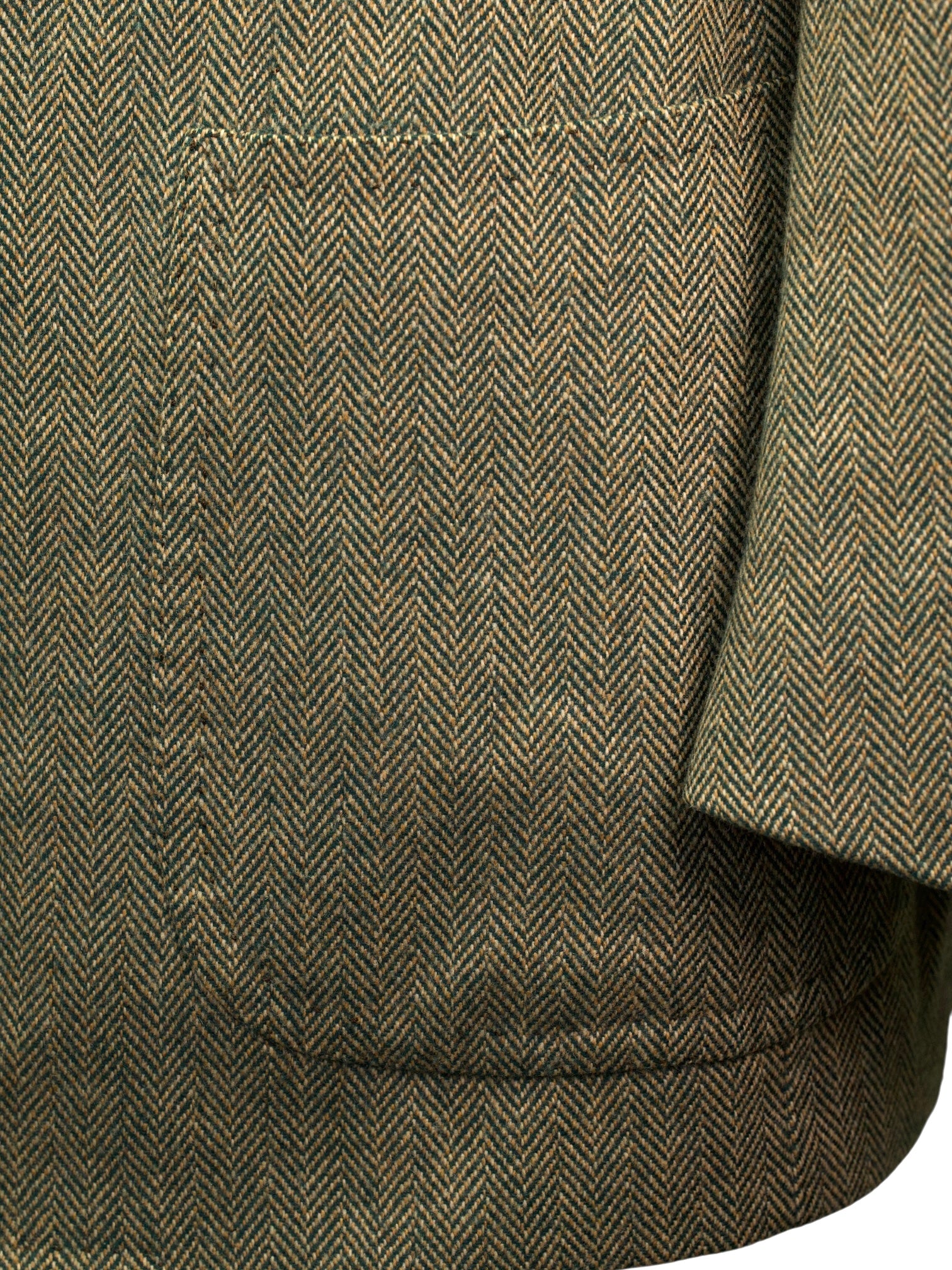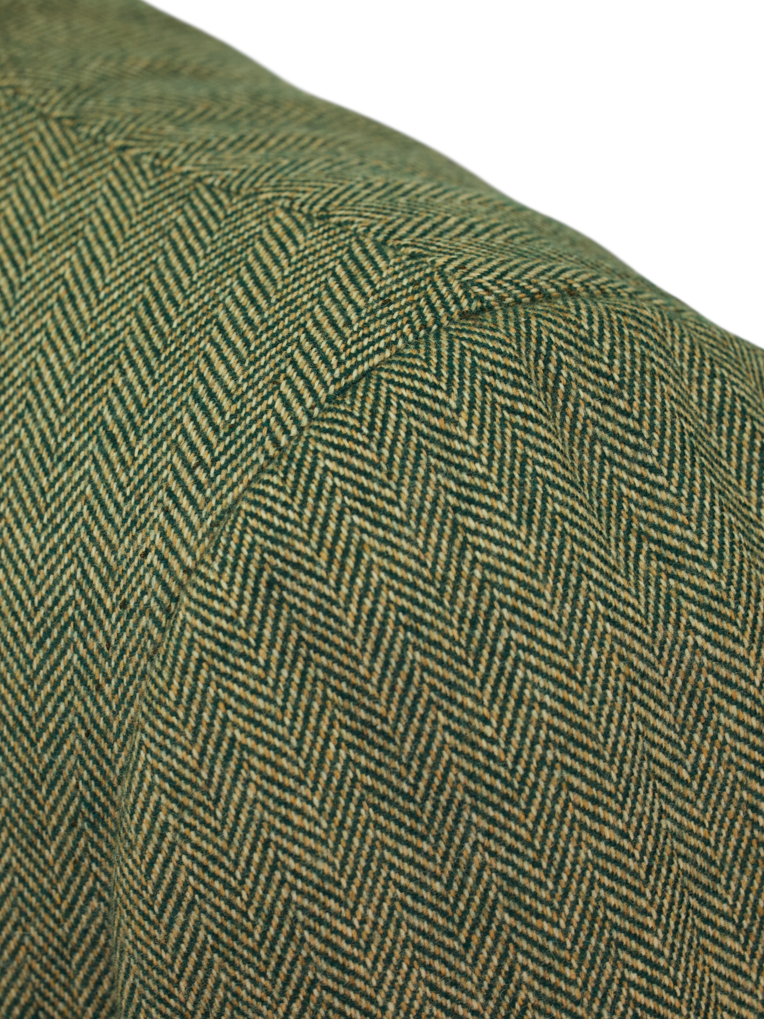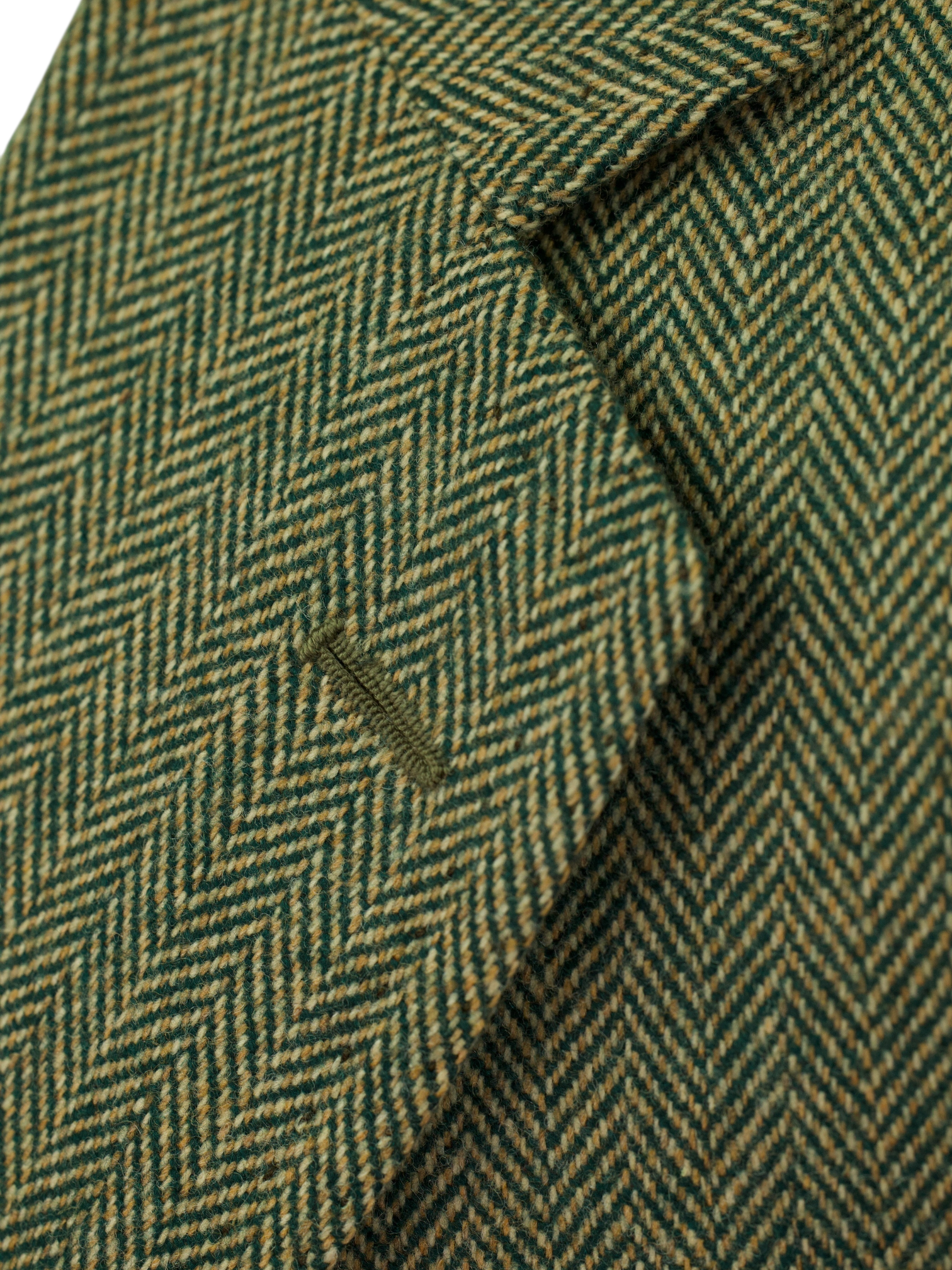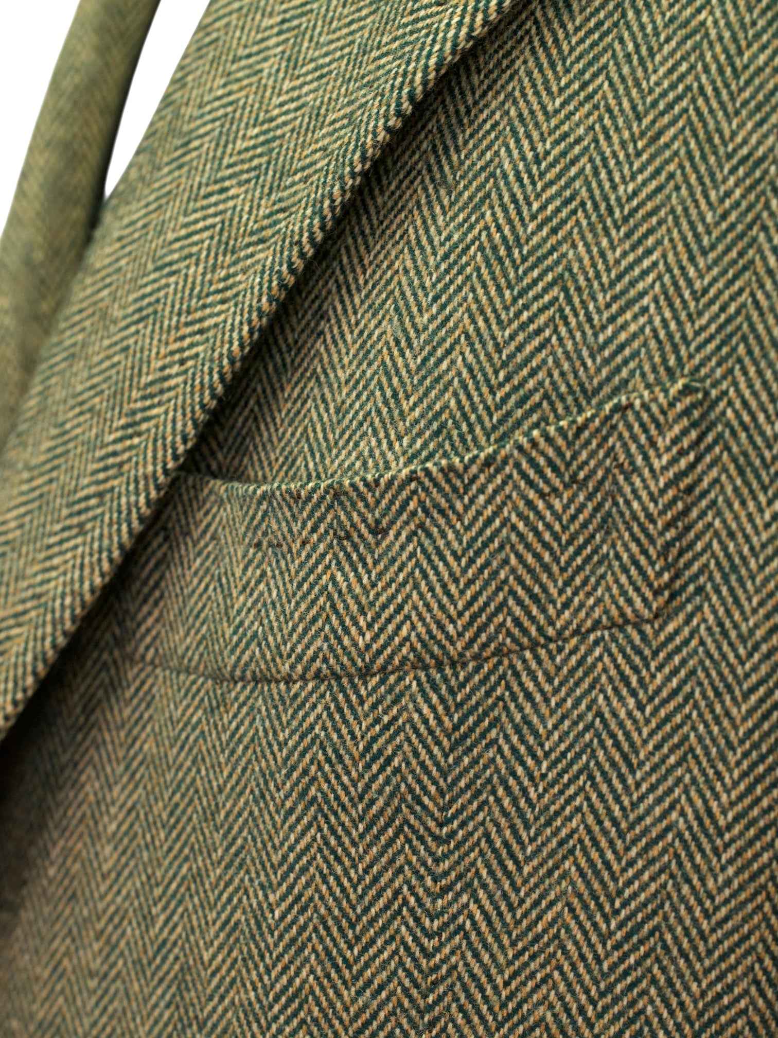 Discover the Cesare Attolini jacket in a richly nuanced moss green wool and cashmere tweed, woven in a classic herringbone pattern with an understated forest green undertone. The fabric offers a tactile tweed touch—robust yet refined—balancing rugged texture with luxurious softness. Cut with notch lapels, patch pockets, and a fully lined interior, the jacket presents a timeless silhouette suited for cooler seasons and layered sophistication.