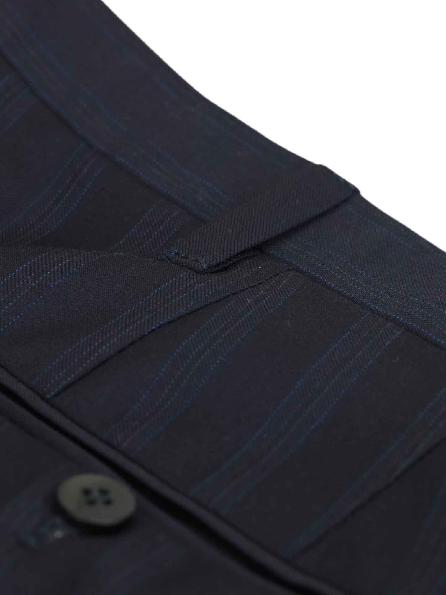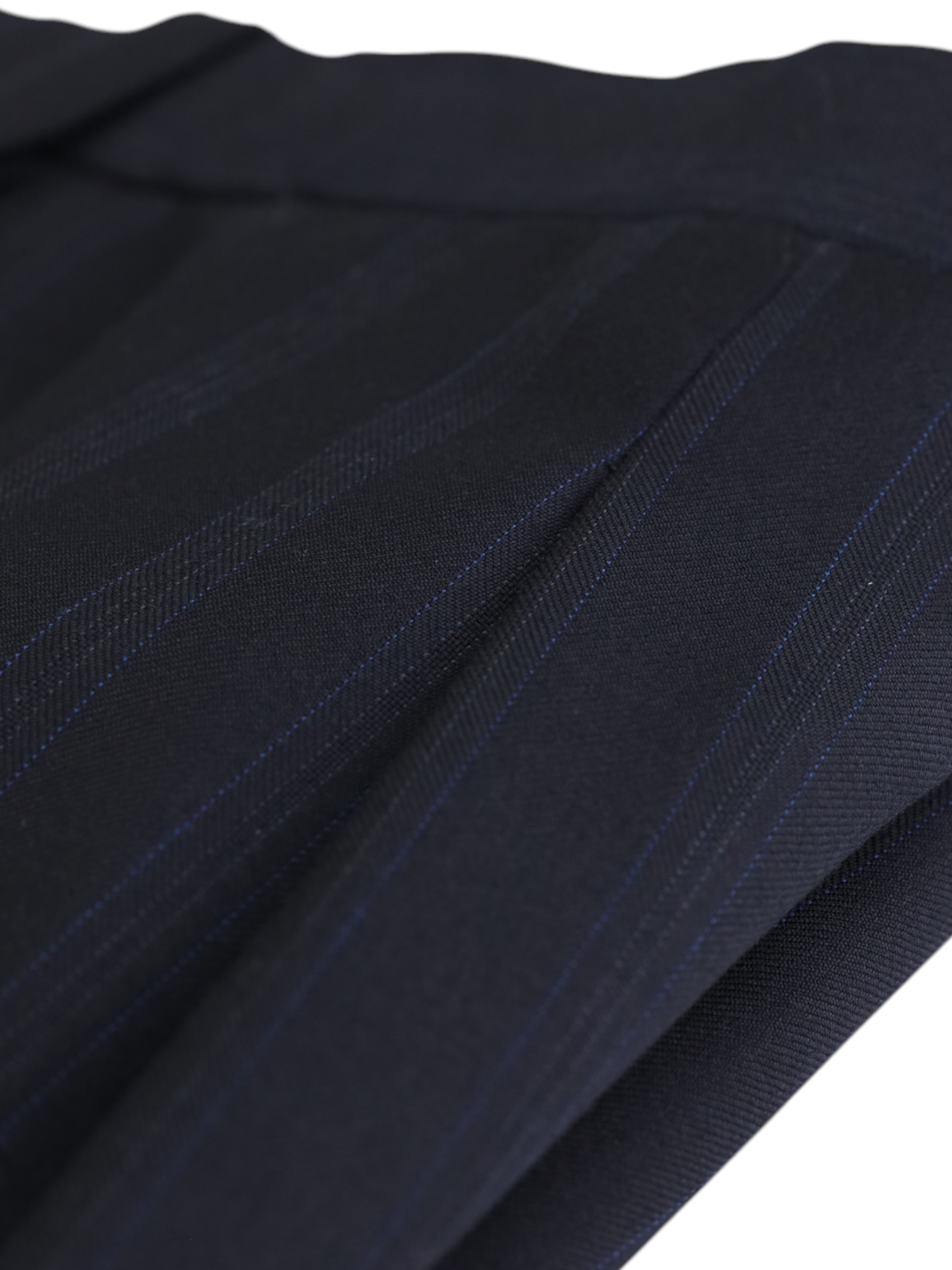Discover the Cesare Attolini navy and light blue pinstripe suit, a masterclass in Neapolitan tailoring and understated refinement. Cut from a Super 150's wool fabric, the navy base is punctuated by fine light blue pinstripes, offering a sharp, elongated silhouette without overpowering the classic character. The jacket features notch lapels, Spalla Camicia shoulders, and a soft, natural drape, all hallmarks of Attolini's signature cut. Paired with tailored flat-front trousers, the suit balances formal structure with unmistakable ease.