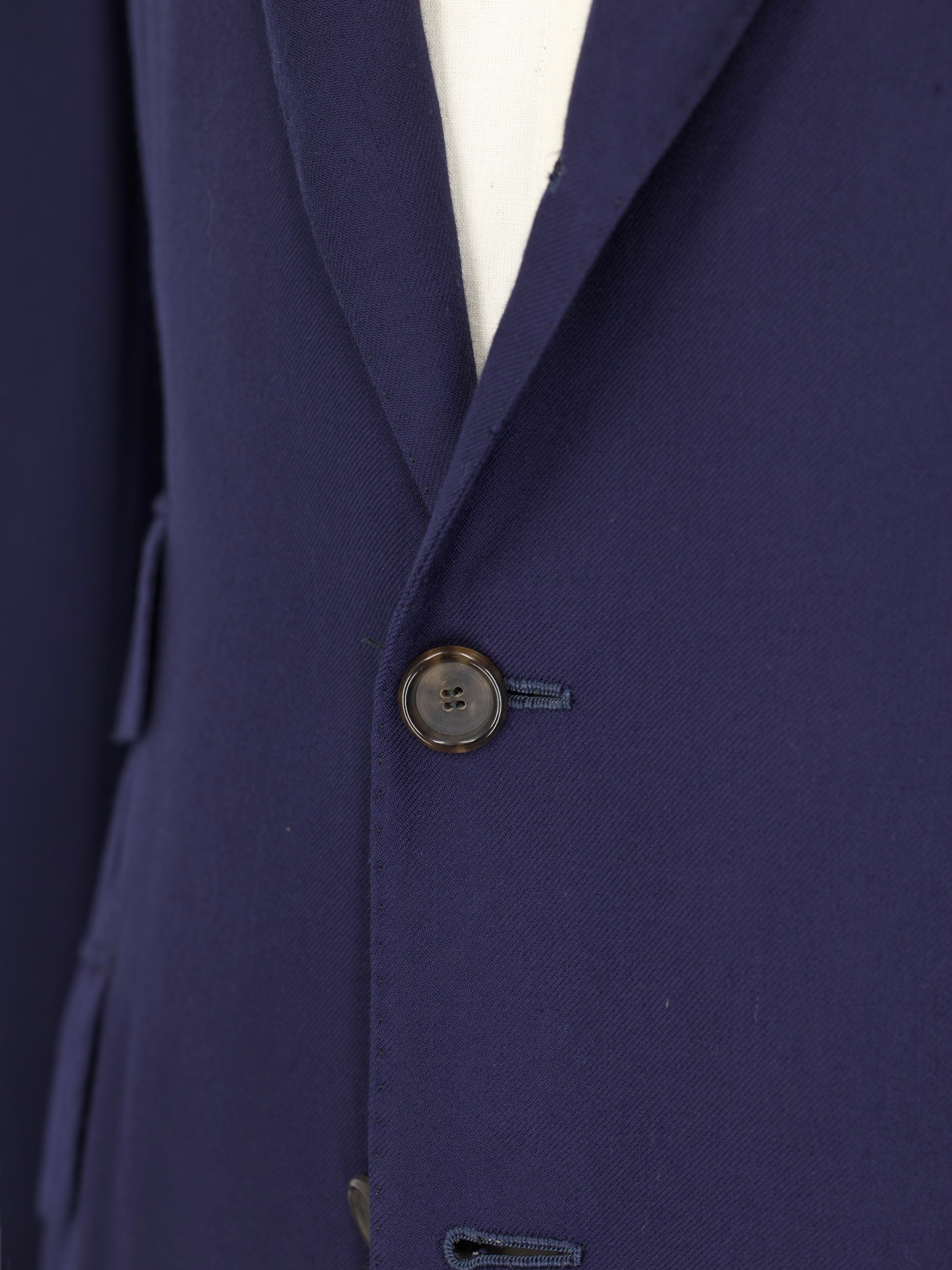 The ‘tre bottoni stirato a due’, also known as the three rolling on two lapel style, is perhaps the most infamous characteristic of the Neapolitan style jacket. The top button and buttonhole are ornamental, so are left unbuttoned. As the lapel rolls down it elegantly folds over the top button and stops just 4 cm above the second button creating the distinct roll of the lapel the style is known for. As it is intended to remain unbuttoned, the top buttonhole is actually made inside out so the beautiful side will still be visible.