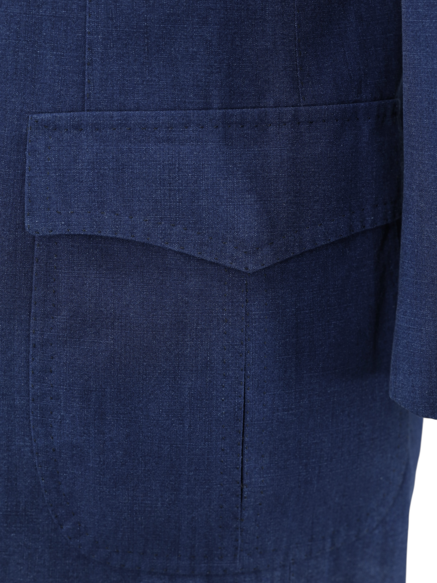 This particular version is something of a collector’s piece. It features generous bellows patch pockets on both the chest and hips, designed to hold volume while keeping the silhouette clean. At the back, two inward-facing pleats allow natural movement, while a hand-stitched half-belt defines the waist with subtle structure. A single vent adds ease without interrupting the line. Every element has been carefully considered, making this a rare example of tailoring where function and craft meet in perfect balance. Discover the elaborated sartorial details below.