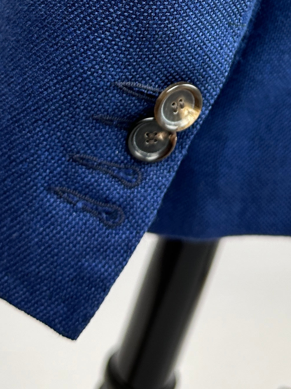 Handmade Neapolitan jacket crafted from a luxurious wool, silk and linen blend with notch lapels, patch pockets and handmade buttonholes - at the end of the sleeve. Discover the elaborated sartorial details below.