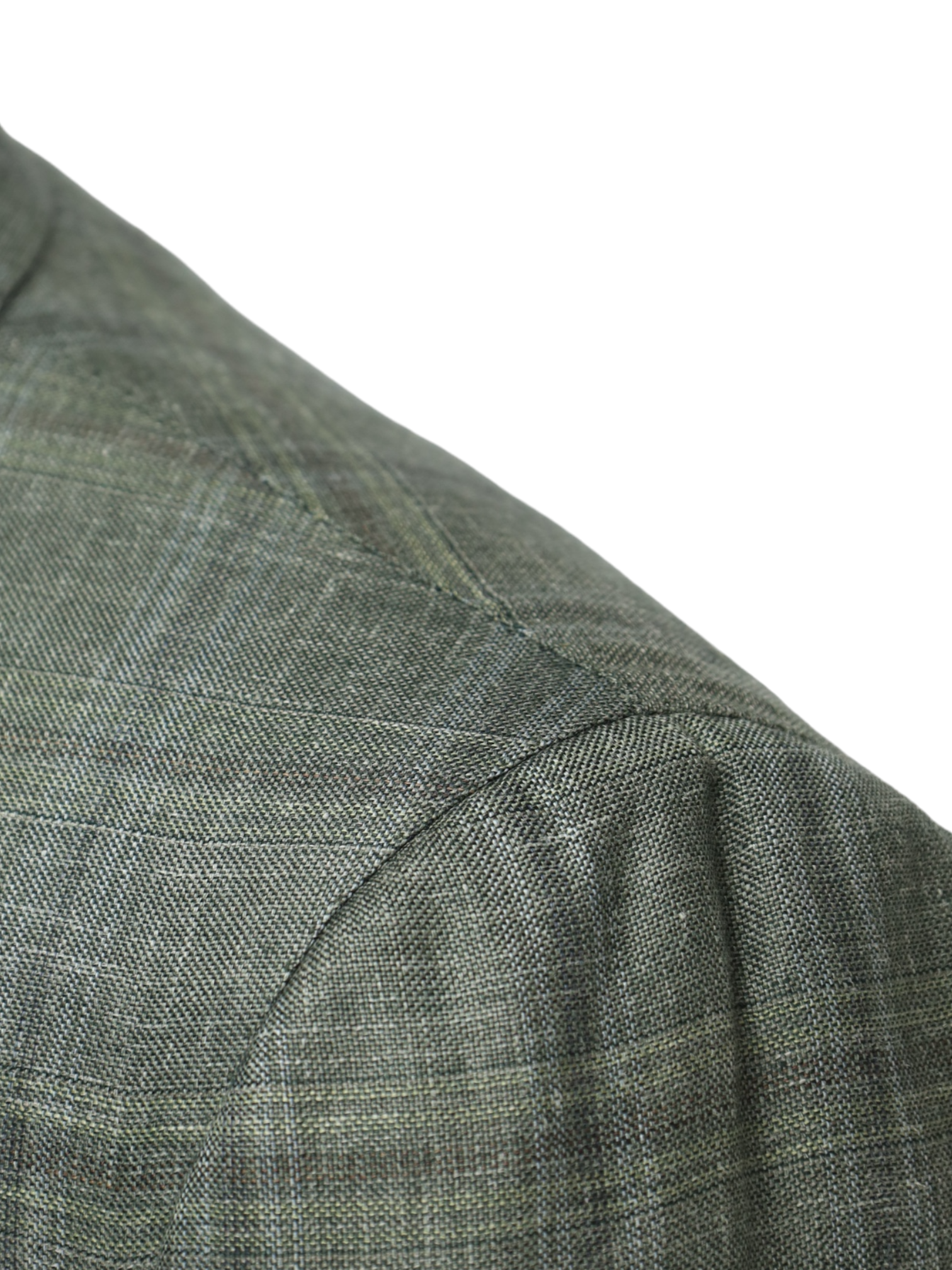 Spalla Camicia roughly translates to 'shirt sleeve' in Italian and is a shoulder style created and popularized by Neapolitan tailors. The name 'shirt sleeve' was so coined due to the characteristic shirring found at the sleeve's head where the fullness of the larger sleeve collapses. Rather than having the head of the sleeve turned back and stitched inside, the head is lapped under and stitched along the top.