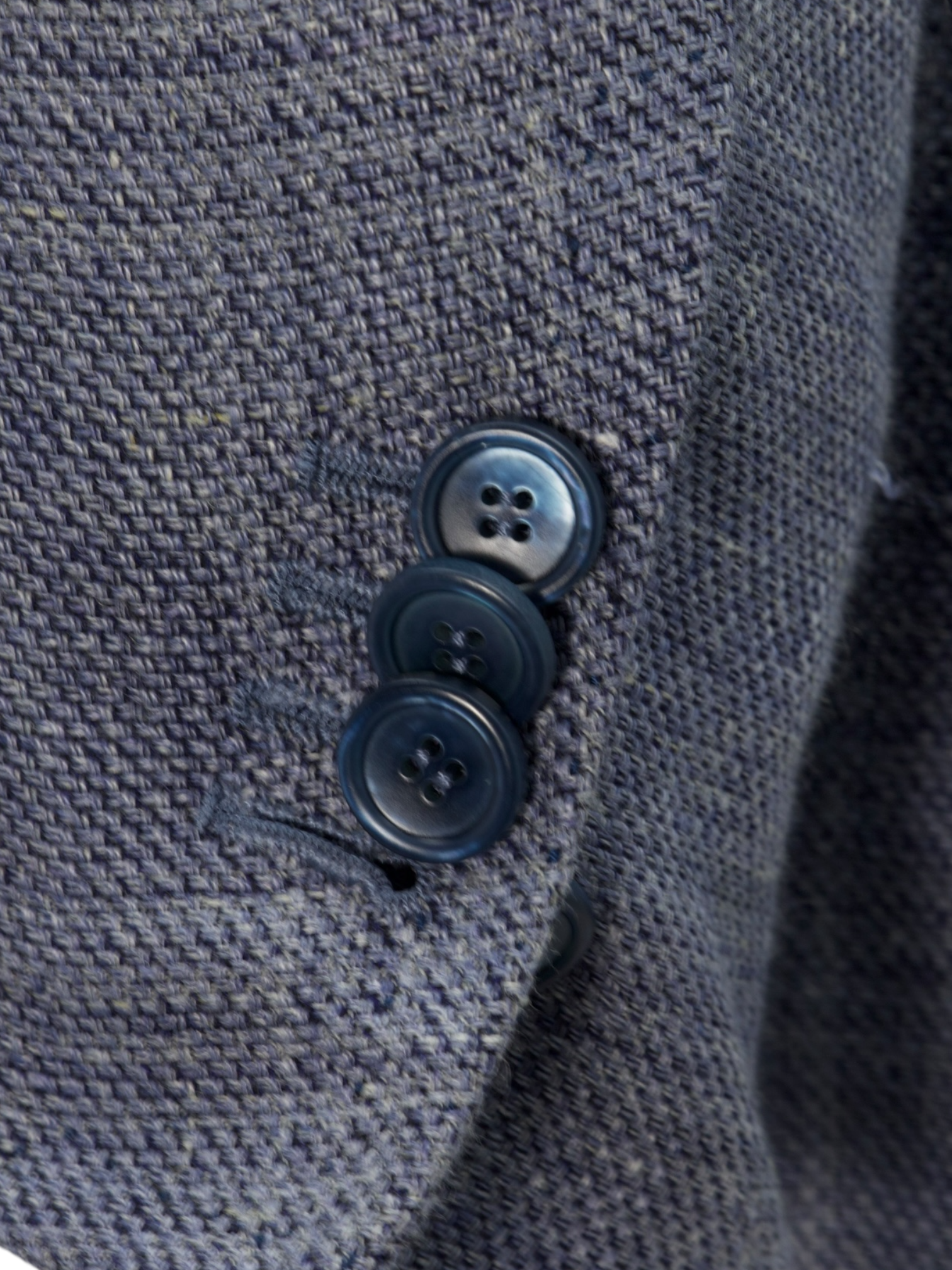 Also known as stacked buttons or waterfall buttons, kissing buttons are associated with Italian tailoring as Italian tailors make their jacket sleeve buttons in the kissing style. In this style, buttons touch each other and overlap one another. Handmade buttonholes; Even this step, apparently the simplest, is treated with an abundance of detail. Attaching the buttons is a job that requires patience and must be completed to perfection.