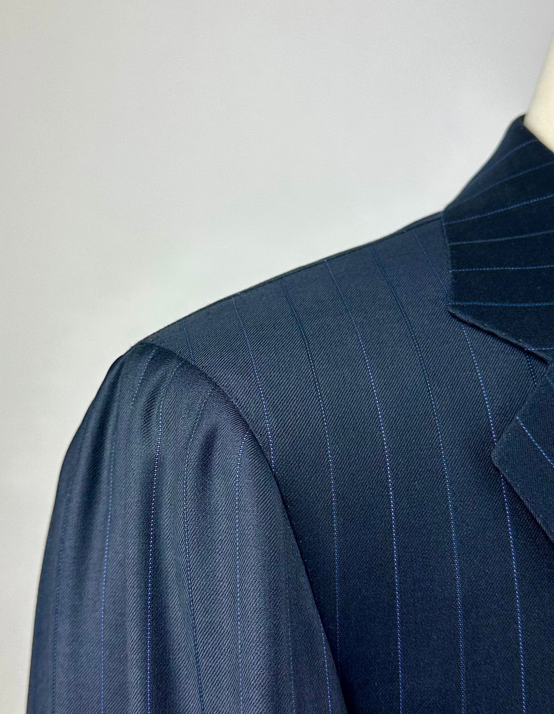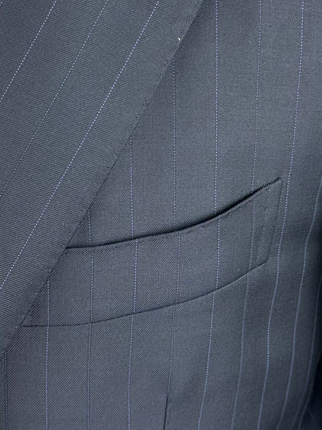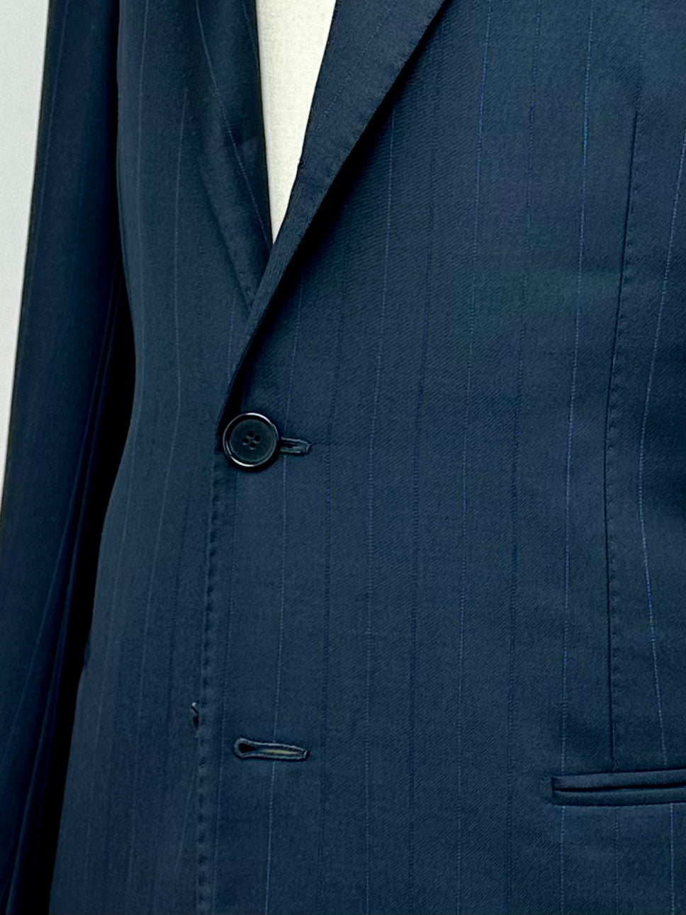 Handmade Neapolitan suit crafted from virgin wool, with notch lapels, jetted pockets and handmade buttonholes - at the end of the sleeve. The jacket contains a La Spalla Camicia, which is a quintessential detail from the Neapolitan tailoring. Discover the elaborated sartorial details below.