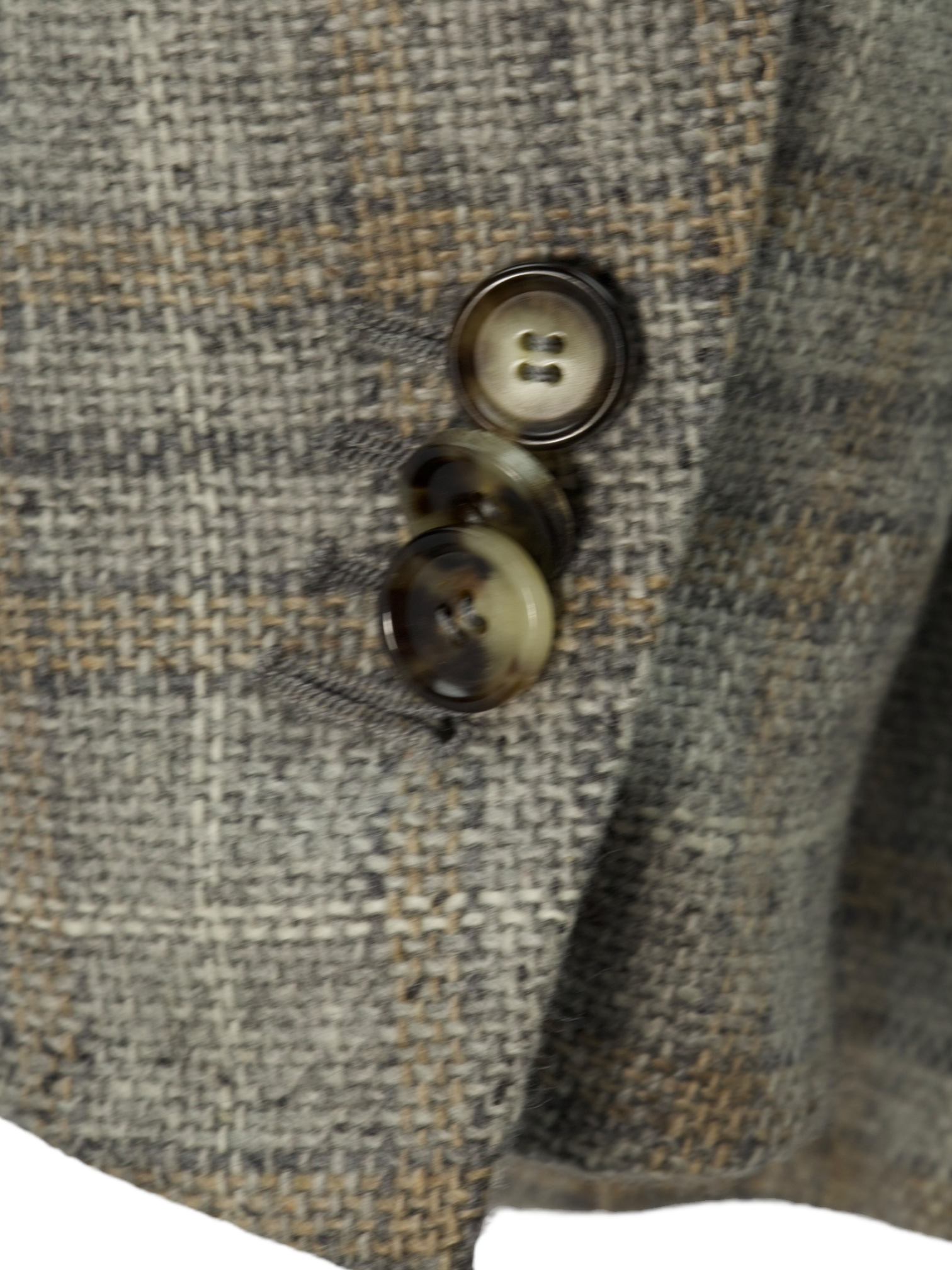 Also known as stacked buttons or waterfall buttons, kissing buttons are associated with Italian tailoring as Italian tailors make their jacket sleeve buttons in the kissing style. In this style, buttons touch each other and overlap one another. Handmade buttonholes; Even this step, apparently the simplest, is treated with an abundance of detail. Attaching the buttons is a job that requires patience and must be completed to perfection.