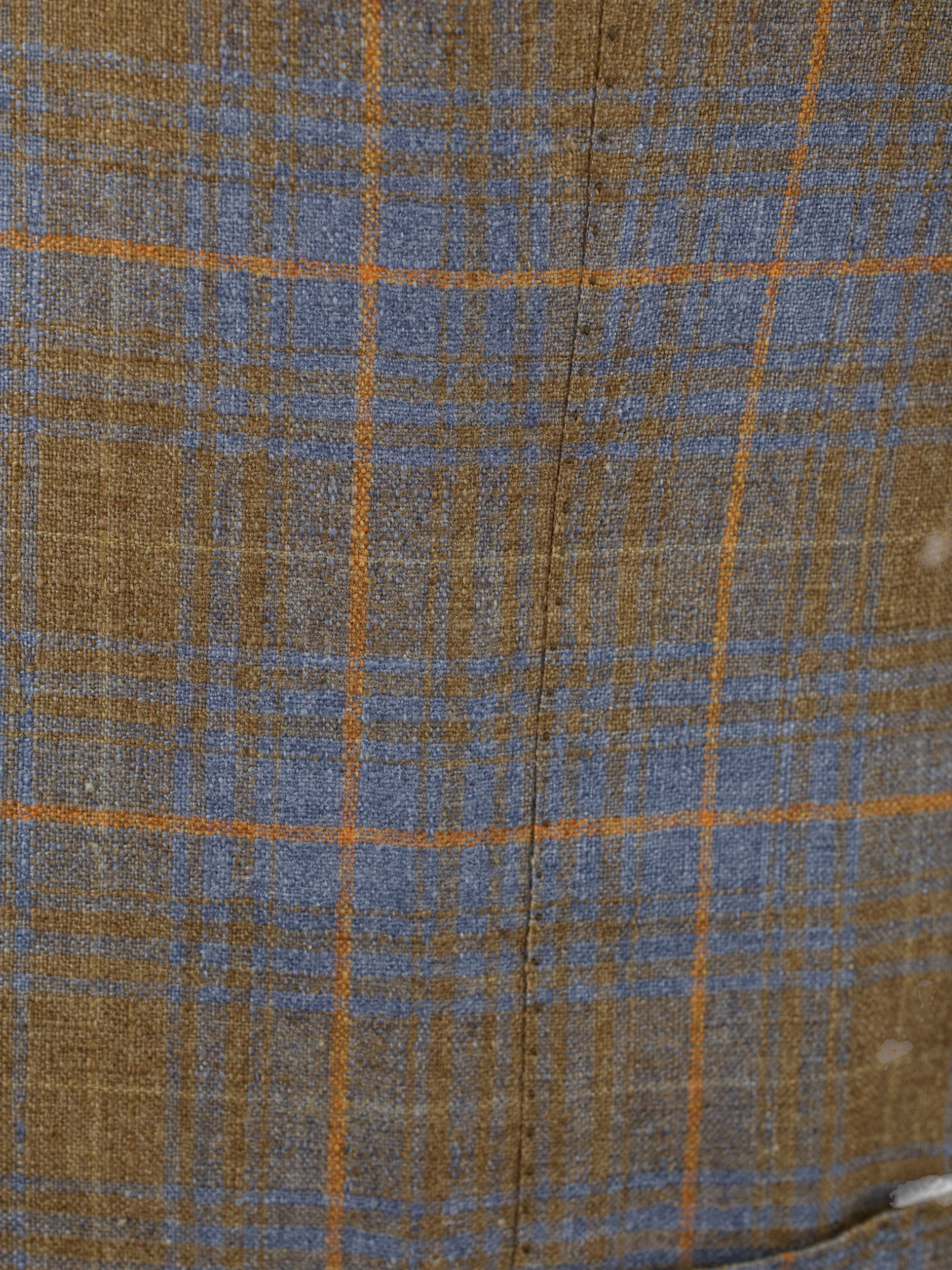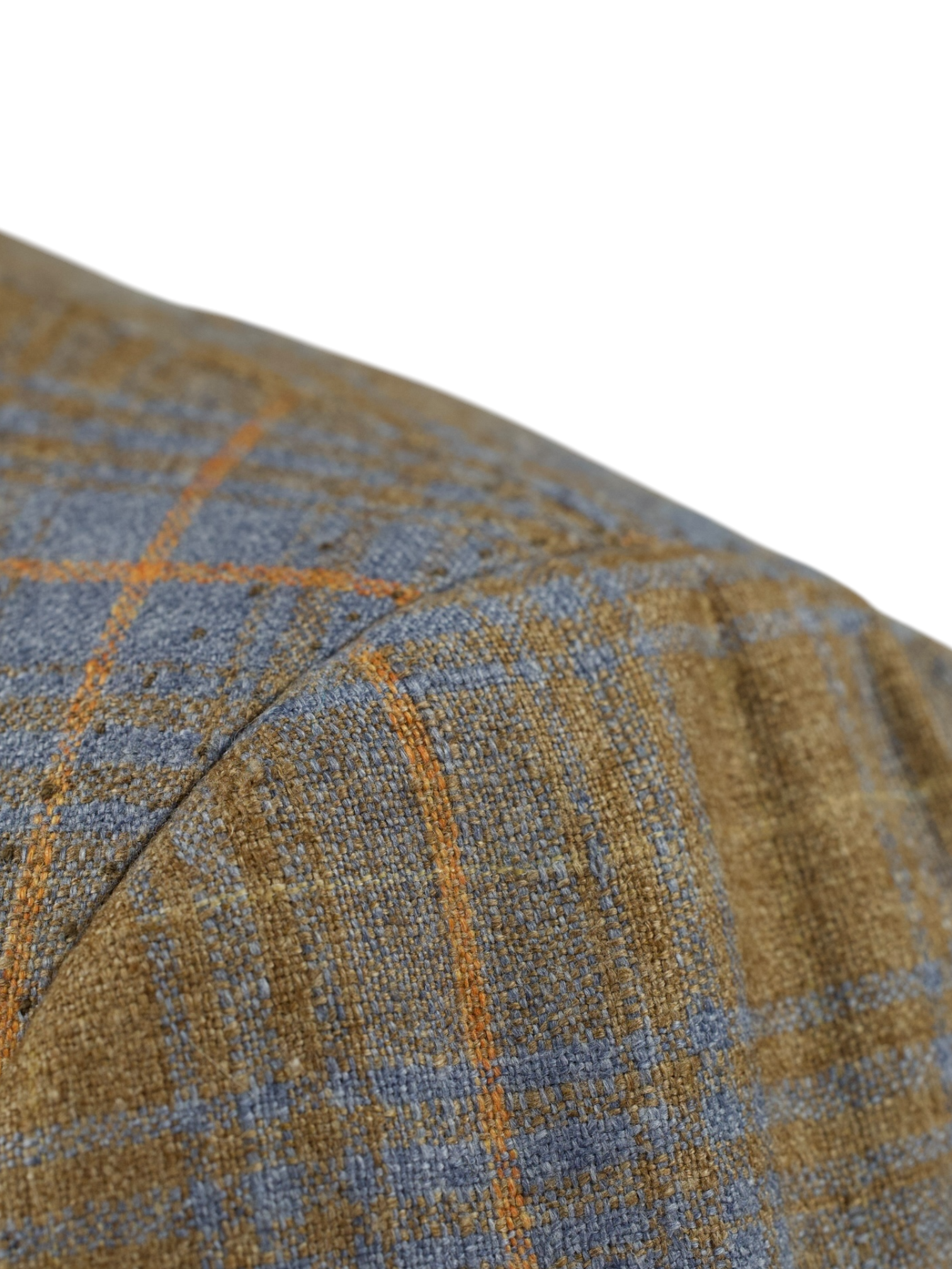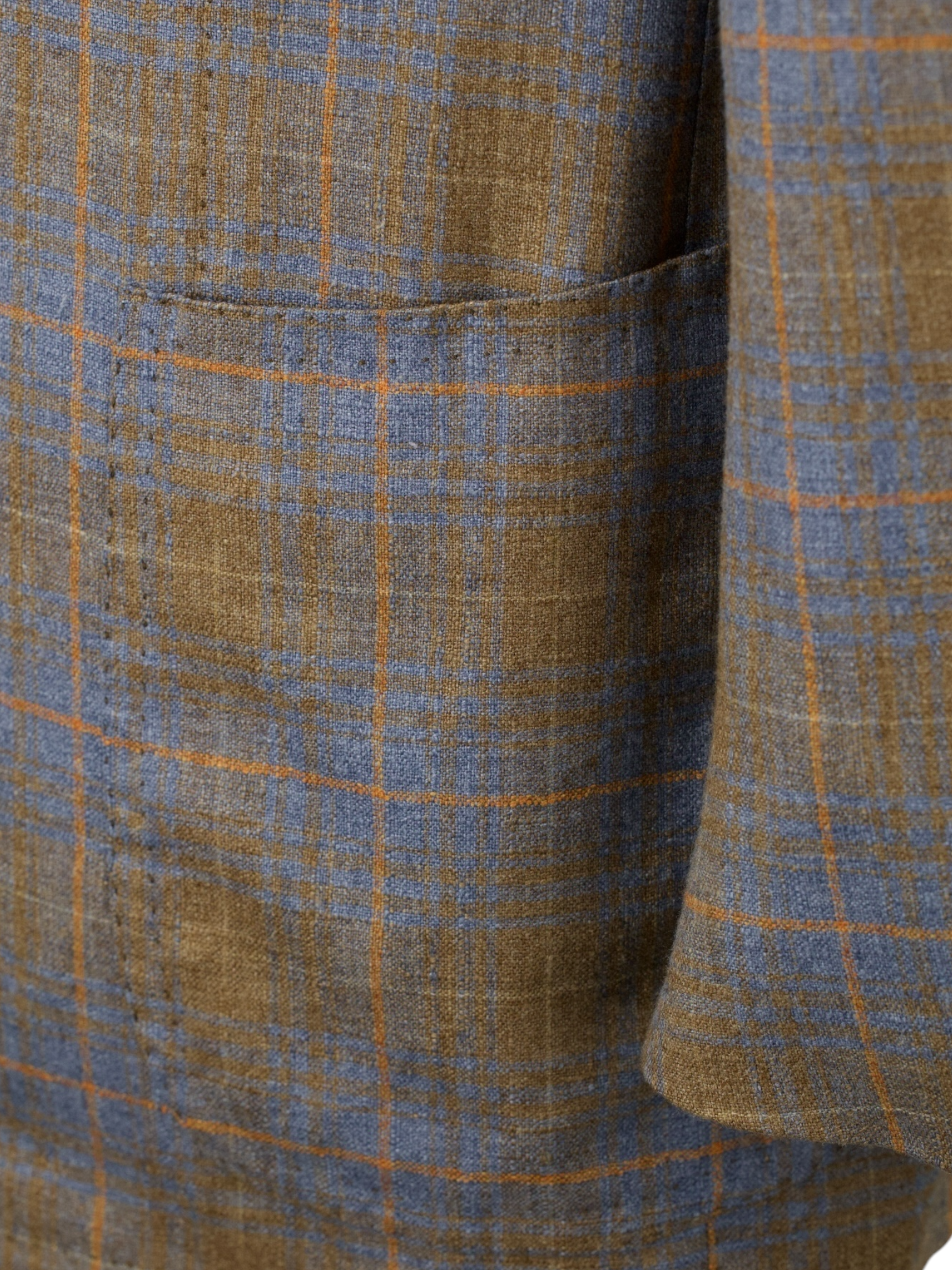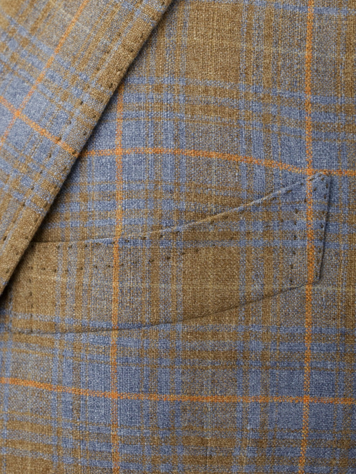 Discover the Cesare Attolini taupe, light blue, and orange check jacket, crafted from a luxurious blend of silk and cashmere. The fabric is soft and lightweight, with just the right amount of texture and sheen. The check pattern—set against a taupe base with subtle light blue and orange tones—adds a touch of personality while staying refined. Designed with notch lapels, spalla camicia shoulders, and tasca a pignata patch pockets, it's fully lined for comfort and finished with fine doppio impuntura double pickstitching along the seams.