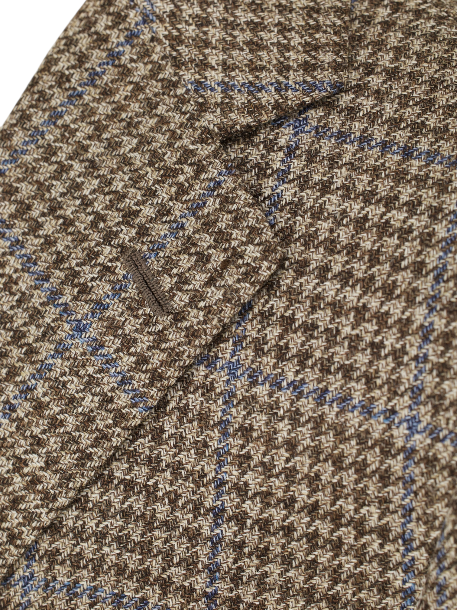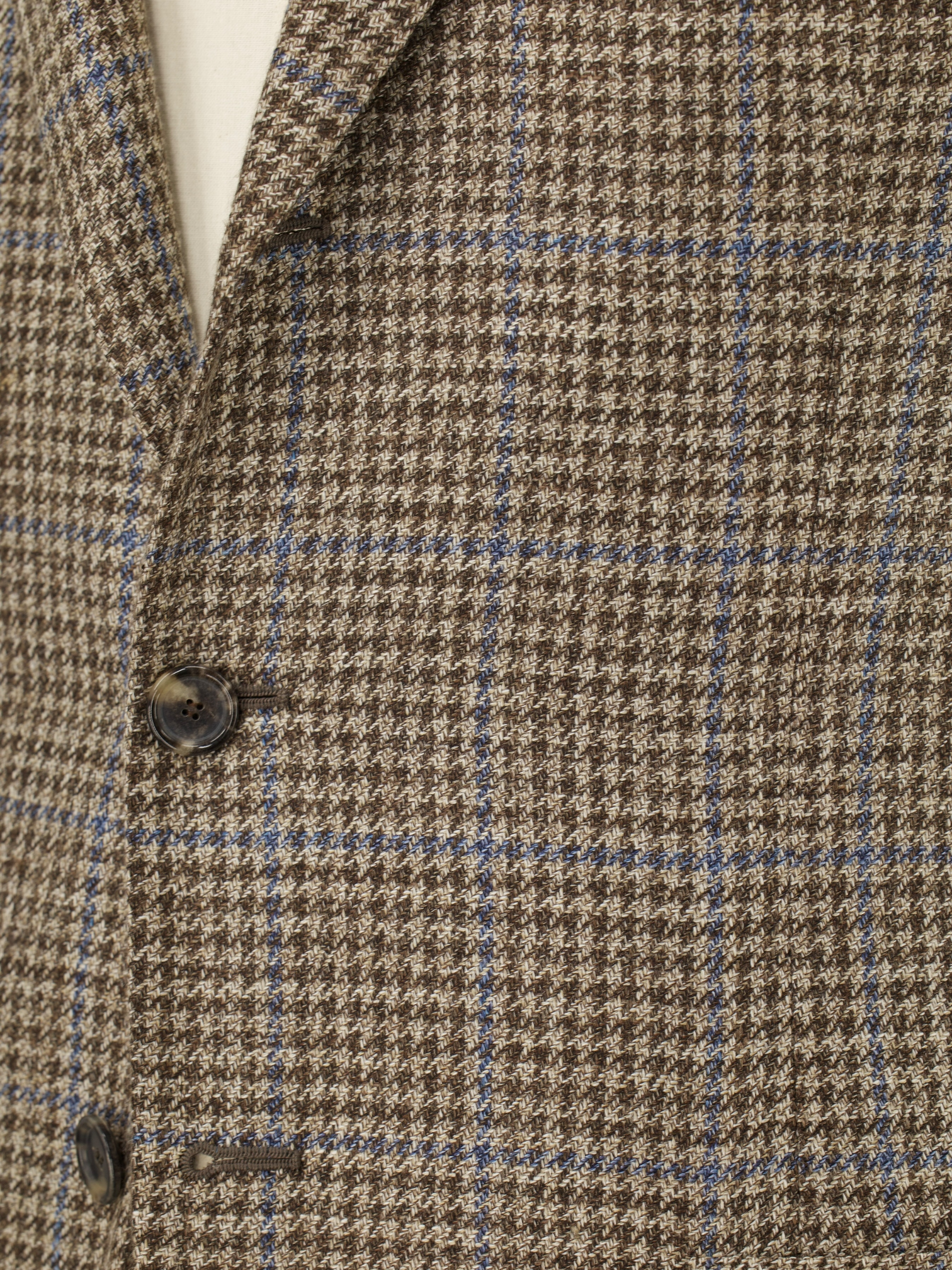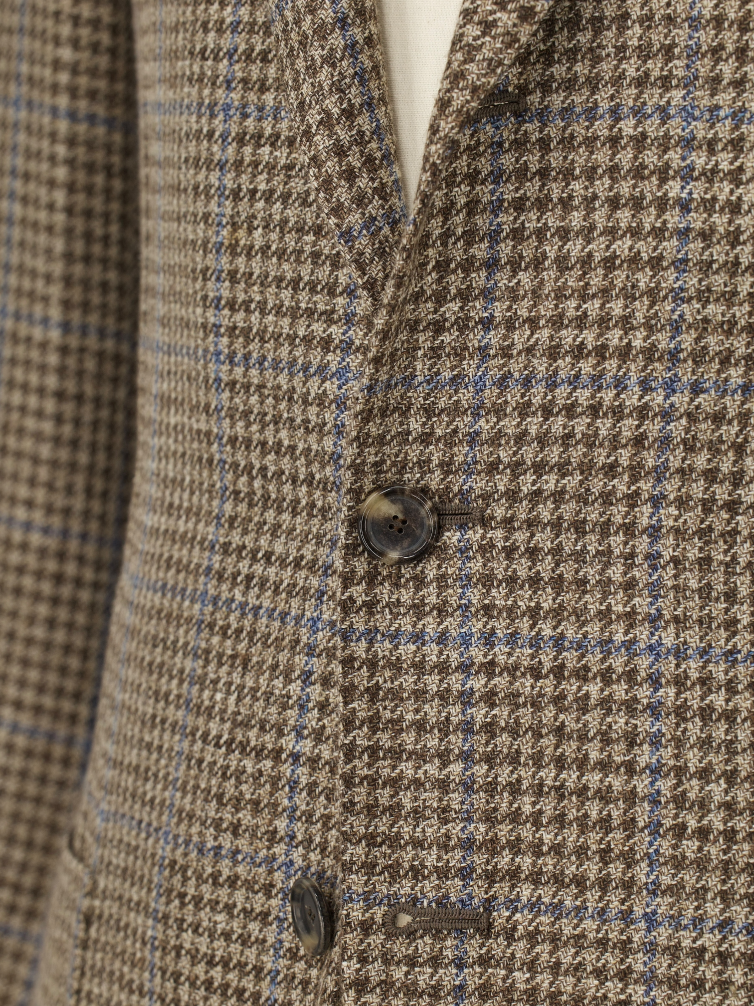 Discover the refined complexity of this Cesare Attolini jacket, tailored in a lightweight blend of wool, silk, and linen that feels as nuanced as it looks. The base is a soft taupe with a delicate brown pied de poule pattern, overlaid by a light chambray blue windowpane that adds clarity and visual rhythm. Notch lapels and a Neapolitan shoulder sleeve define the relaxed, elegant silhouette, while a half-lined interior allows the fabric to breathe and move naturally. Horn buttons and finely crafted handmade buttonholes complete the look with quiet assurance.