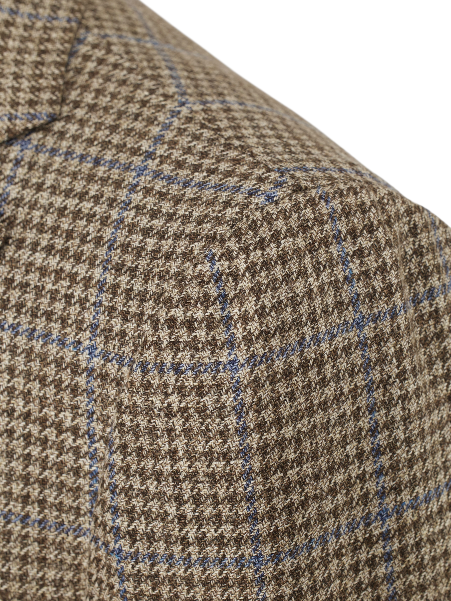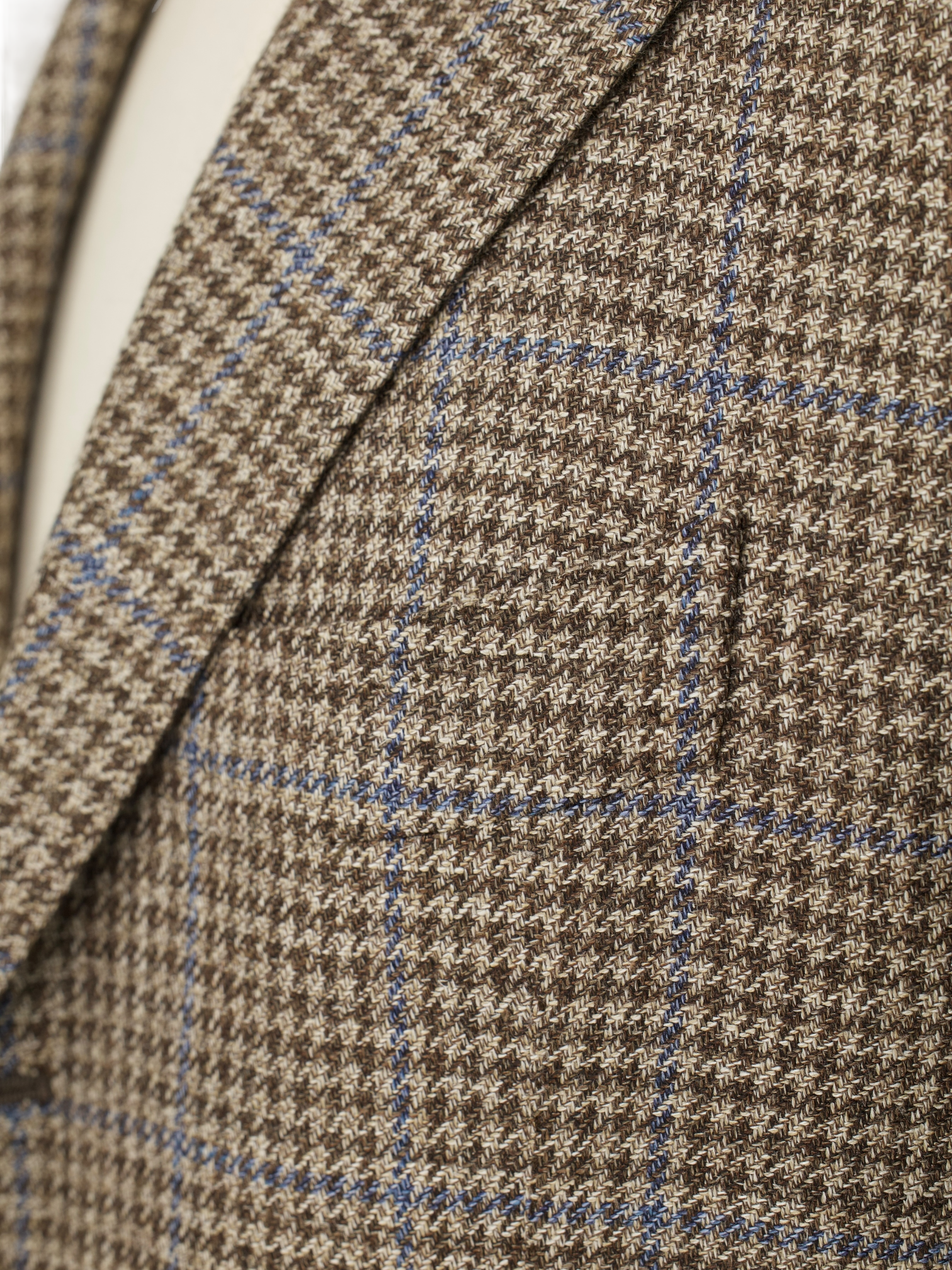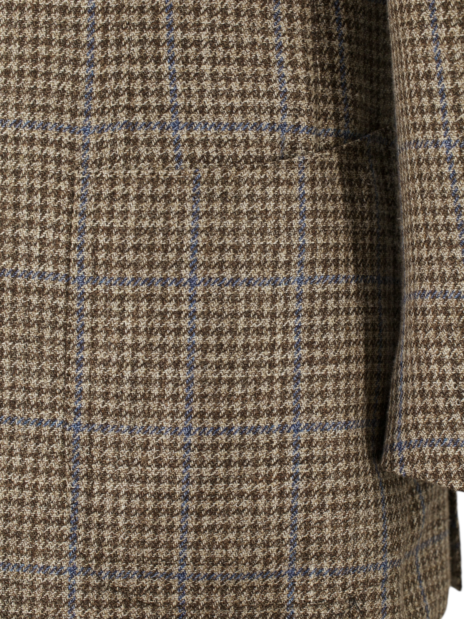 Discover the refined complexity of this Cesare Attolini jacket, tailored in a lightweight blend of wool, silk, and linen that feels as nuanced as it looks. The base is a soft taupe with a delicate brown pied de poule pattern, overlaid by a light chambray blue windowpane that adds clarity and visual rhythm. Notch lapels and a Neapolitan shoulder sleeve define the relaxed, elegant silhouette, while a half-lined interior allows the fabric to breathe and move naturally. Horn buttons and finely crafted handmade buttonholes complete the look with quiet assurance.