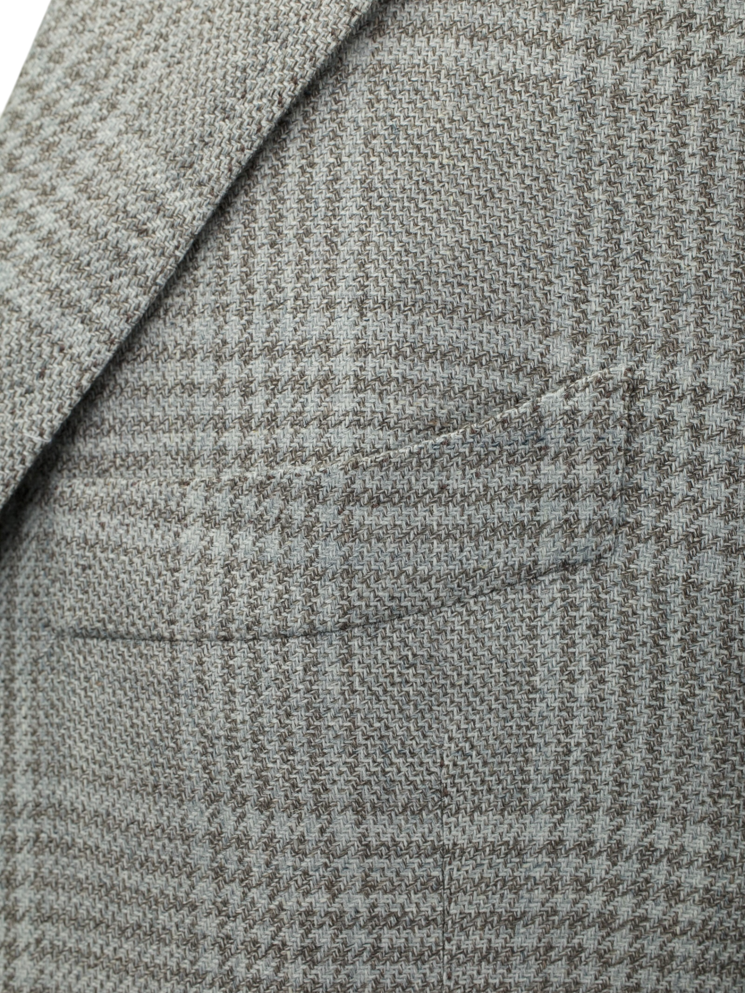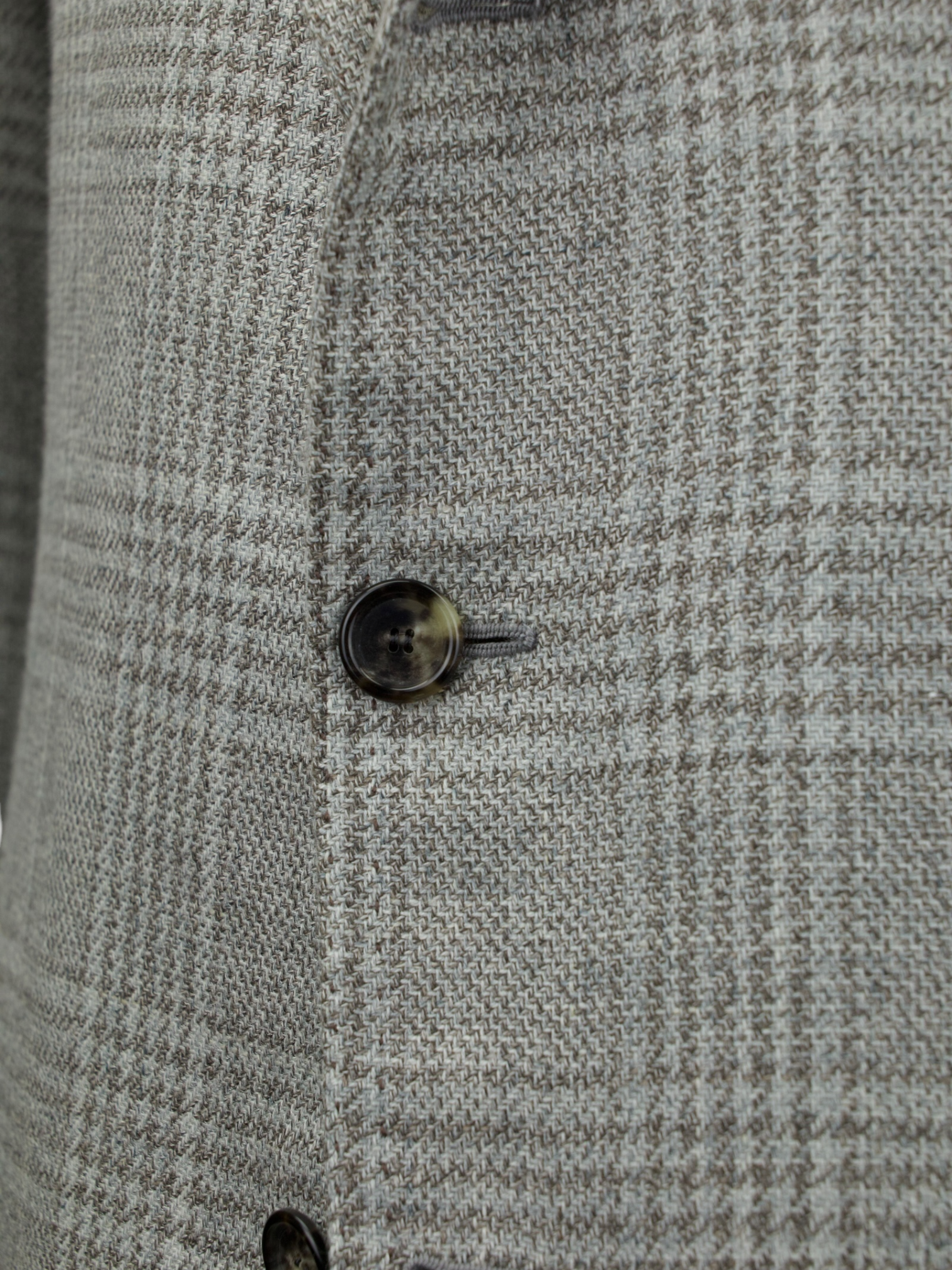 Discover the Cesare Attolini taupe Prince of Wales jacket, a masterclass in fabric nuance and refined summer tailoring. Woven from a blend of wool, silk, and linen, the cloth balances breathability with quiet sophistication—its open weave has the dry, airy lightness of a hopsack, paired with the subtle iridescence of silk. The Prince of Wales check is rendered in understated tones, allowing the micro-pattern to emerge only up close, making it visually rich without being loud. Designed with notch lapels, a half-lined interior, and handmade buttonholes, this is a jacket that feels as composed as it looks.