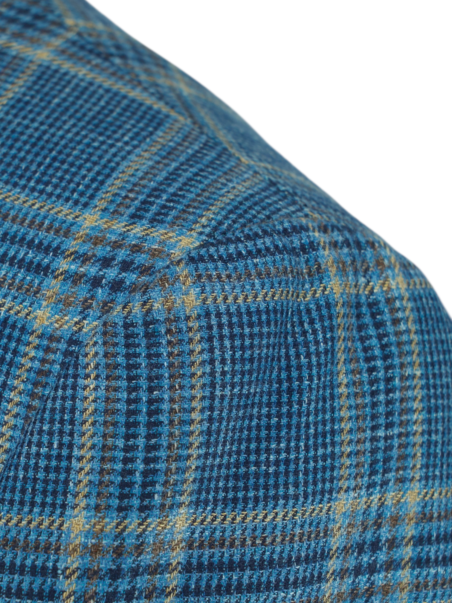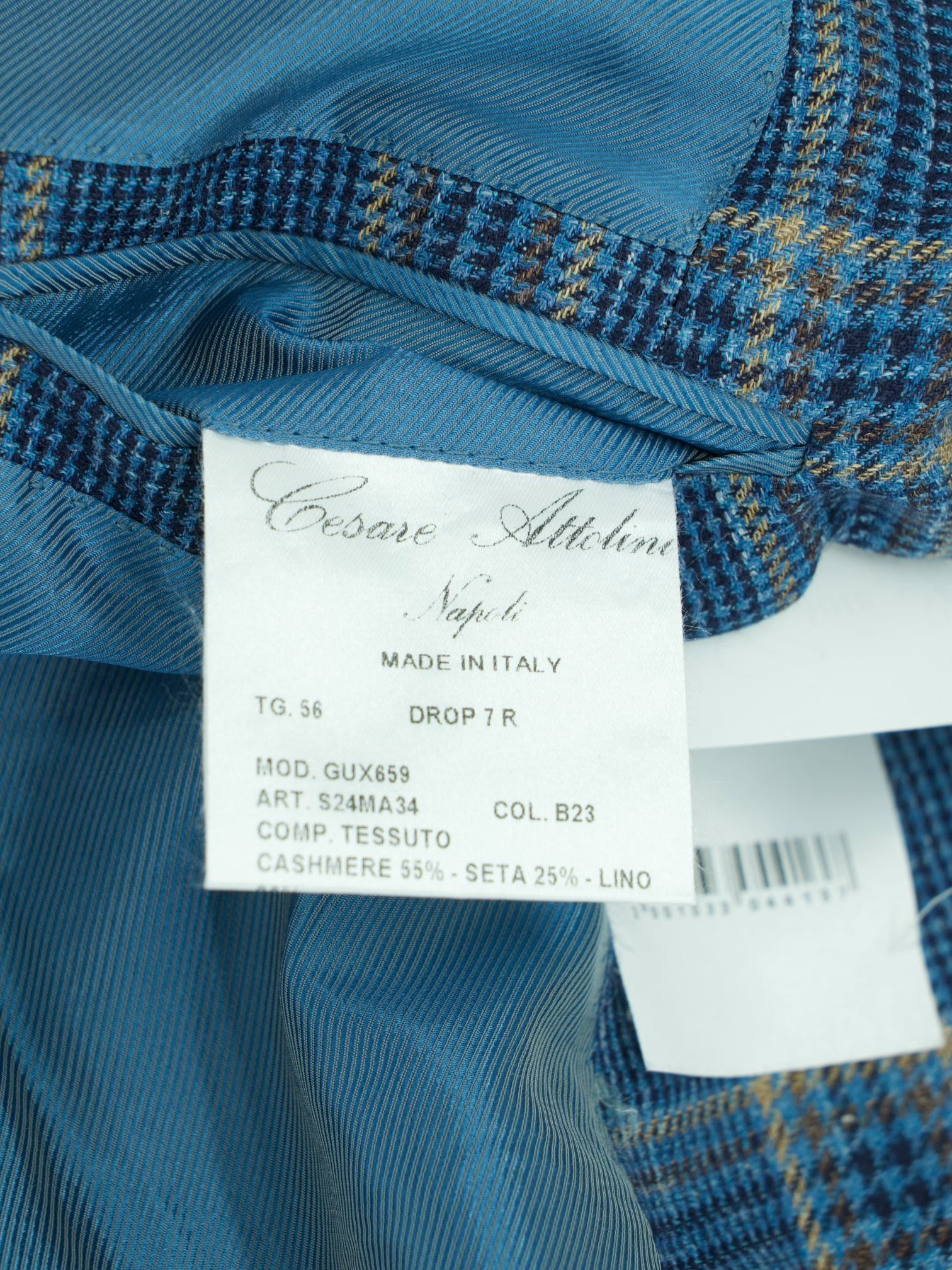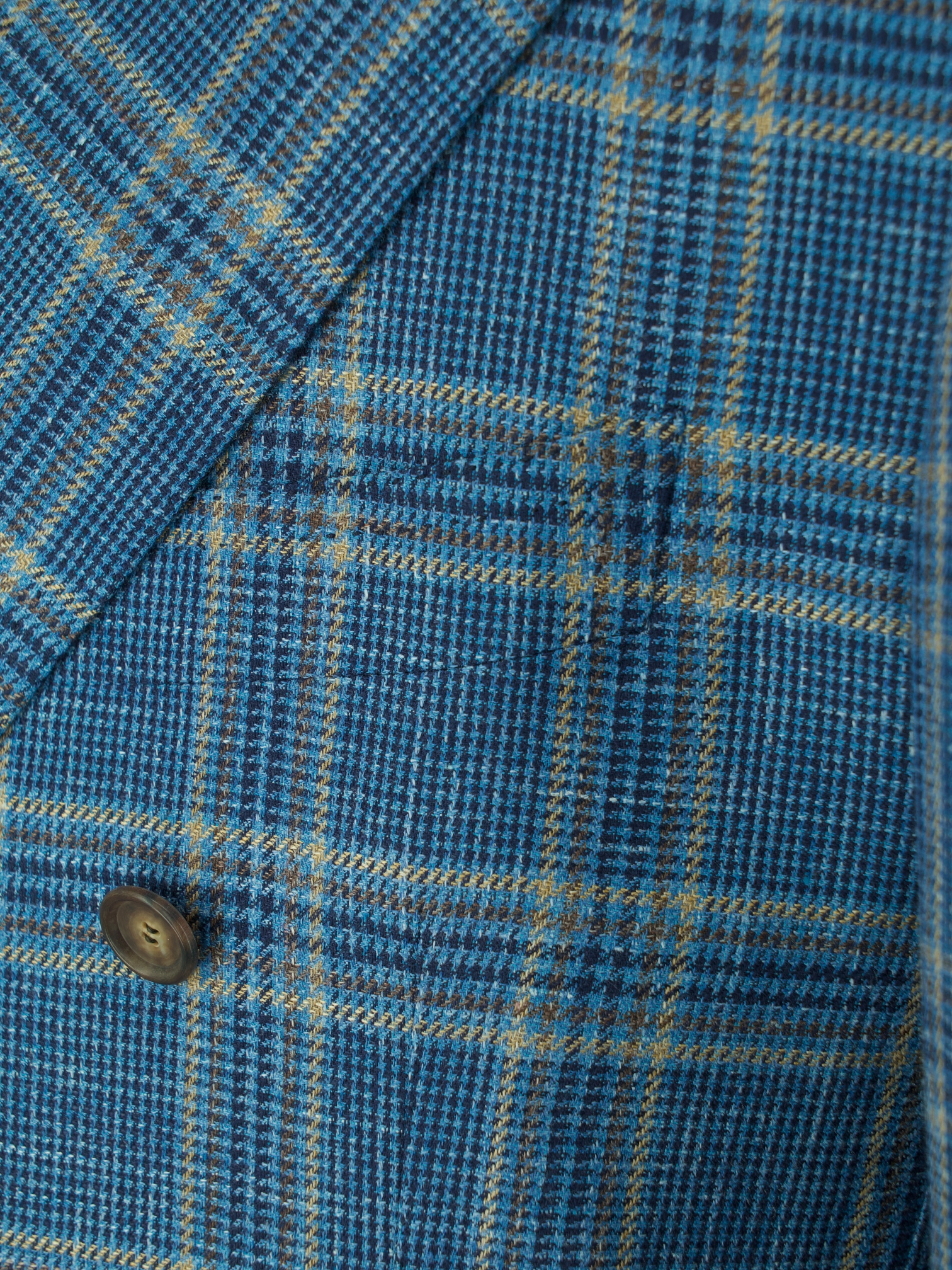 Discover the Cesare Attolini Turquoise Double-Breasted Cashmere, Silk and Linen Checkered Jacket, a bold yet refined expression of Neapolitan tailoring. The fabric is rich in character, blending cashmere, silk and linen into a soft, breathable weave with remarkable depth. A turquoise undertone sets the stage for a dark brown Prince of Wales check, overlaid with a light brown overcheck that catches the eye without overpowering. Cut with peak lapels, a six-button front and patch pockets, the jacket is finished with brown horn buttons and doppio impuntura double pick stitching along the lapels and pockets for a subtle artisanal touch.