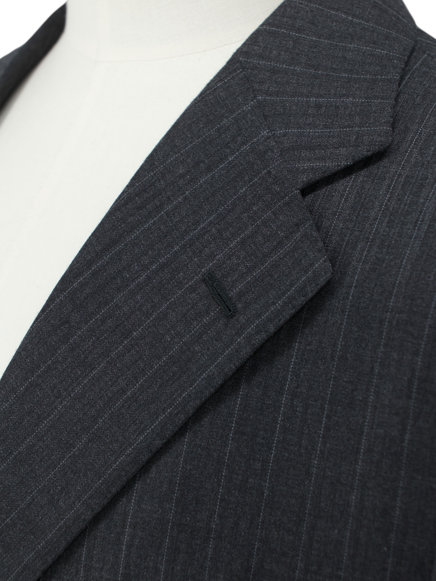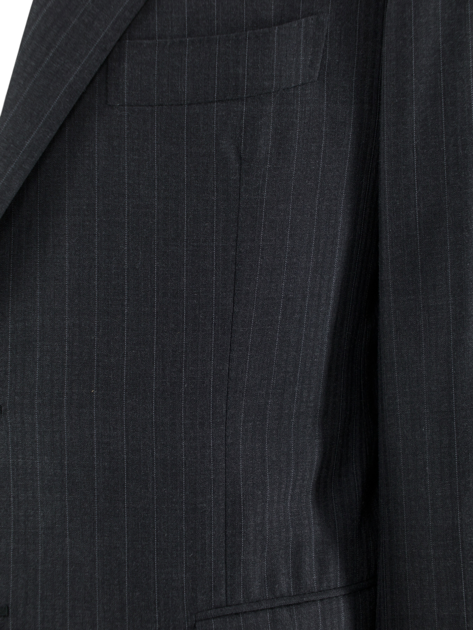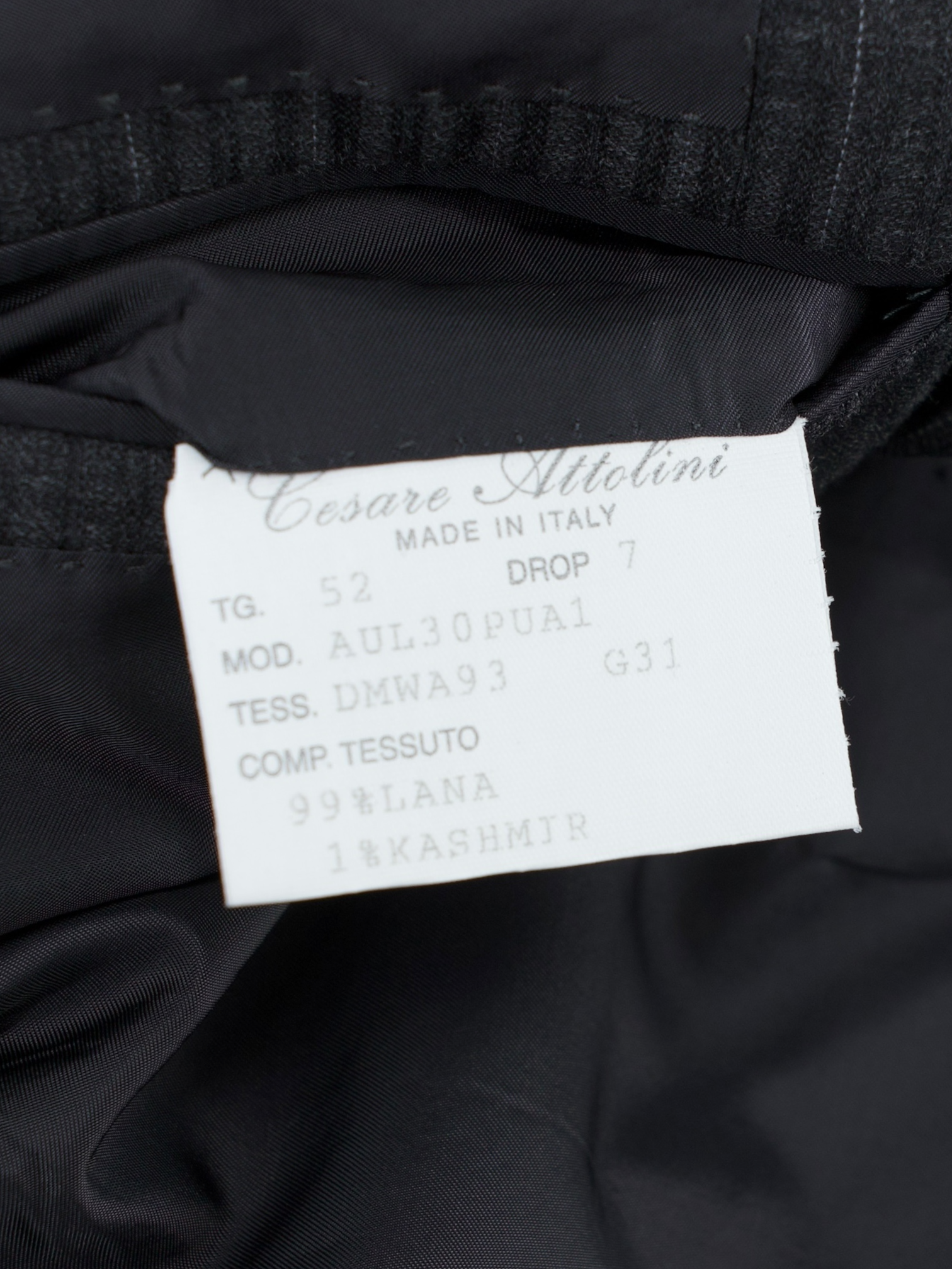 Discover the Cesare Attolini grey multi-pinstripe suit, originally purchased for Domenico Vacca’s Alta Sartoria collection, and tailored from an elegant blend of wool and cashmere. The fabric features a refined array of fine pinstripes set against a soft grey base, offering a quiet sophistication with just the right amount of visual rhythm. The jacket is fully lined, designed with notch lapels, a 2.5 button closure, and cut in a relaxed silhouette that maintains sharpness without rigidity. It’s a suit that reads classic, but with a distinctly Italian ease.