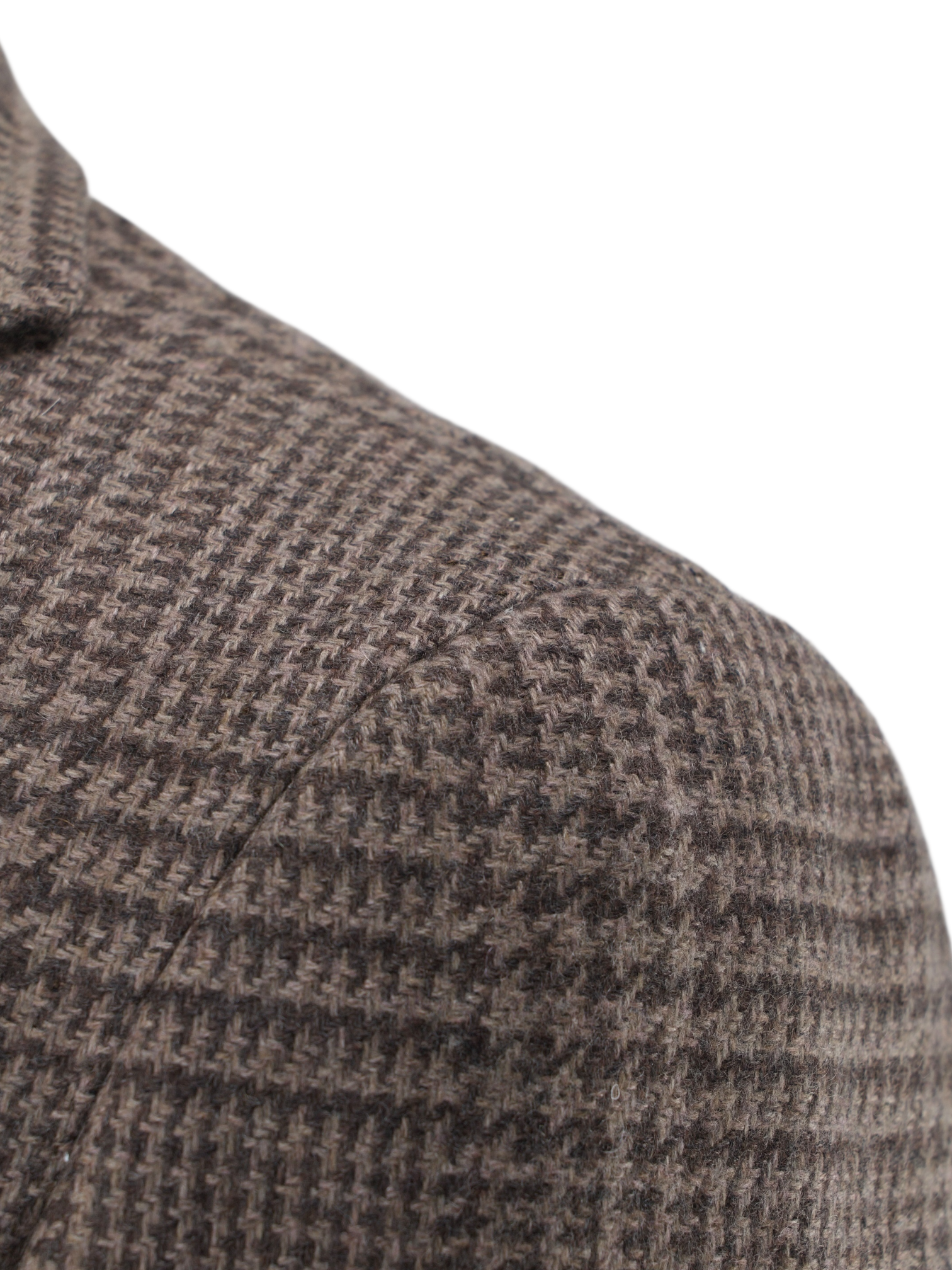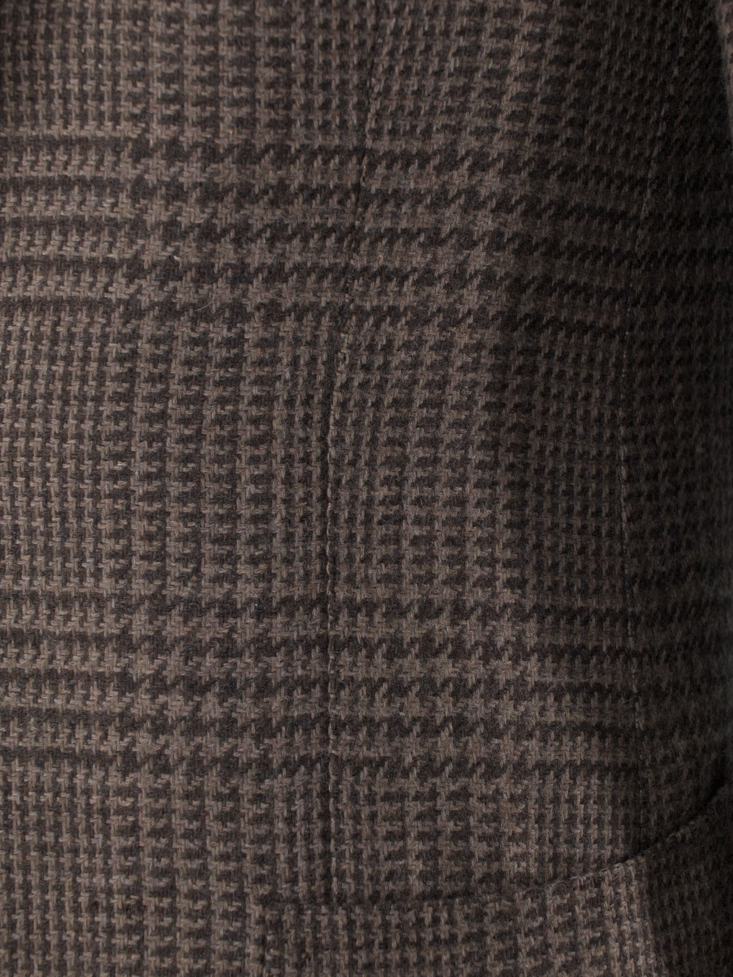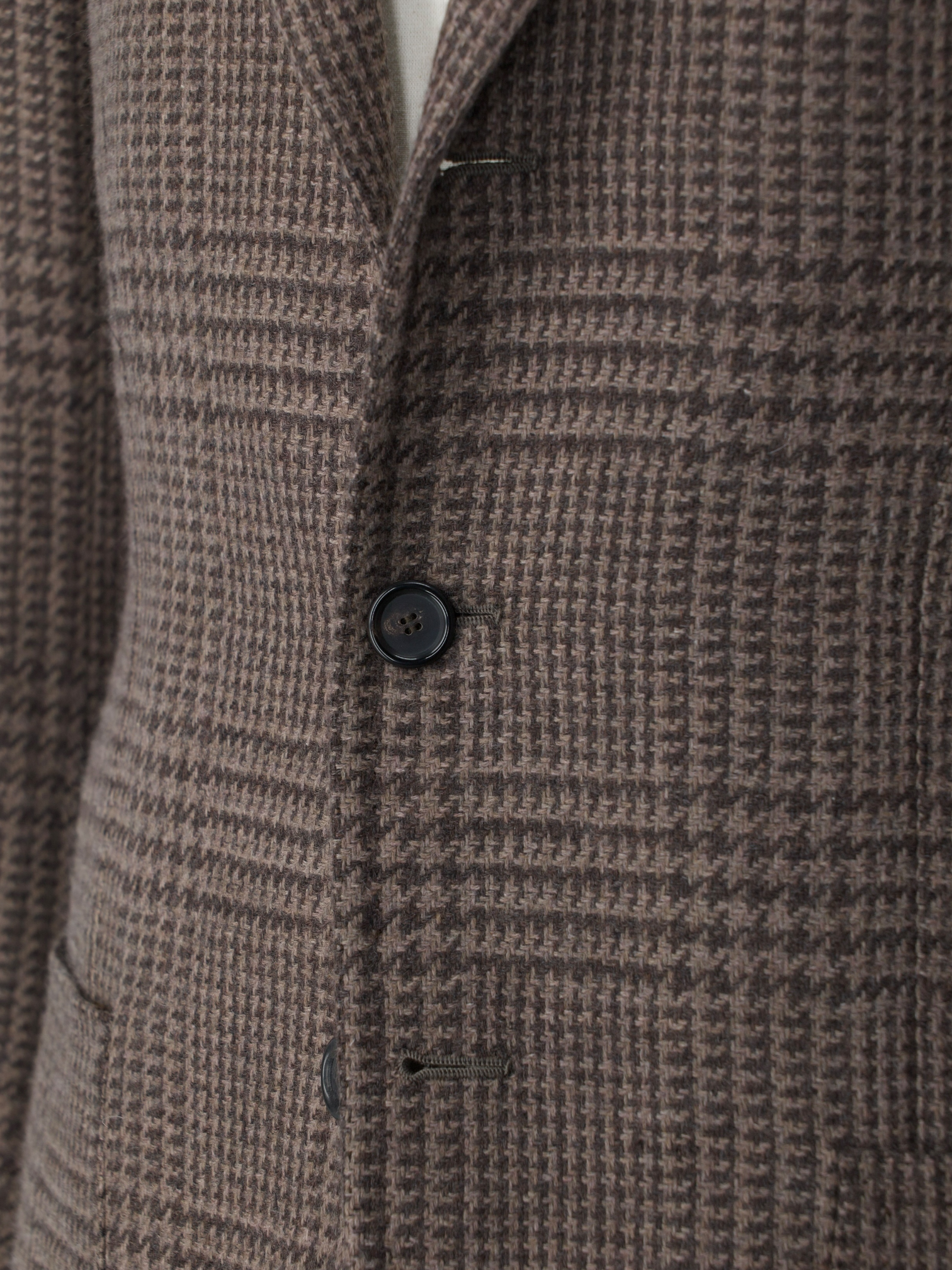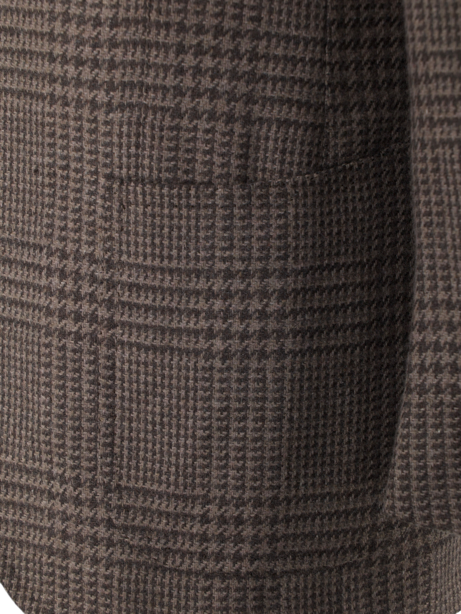 Discover the Cesare Attolini warm taupe jacket, cut from pure cashmere in a bold Prince of Wales check that blends classic pattern with rich seasonal tone. The fabric has a soft, plush handle with a warmth and depth that feels indulgent without excess. Designed with notch lapels, a 2.5 button closure and horn buttons, the jacket is finished with patch pockets that lend it a relaxed, informal spirit. The colour is a mellow taupe with subtle variations that highlight the complexity of the check, making it a versatile choice for autumn and winter.