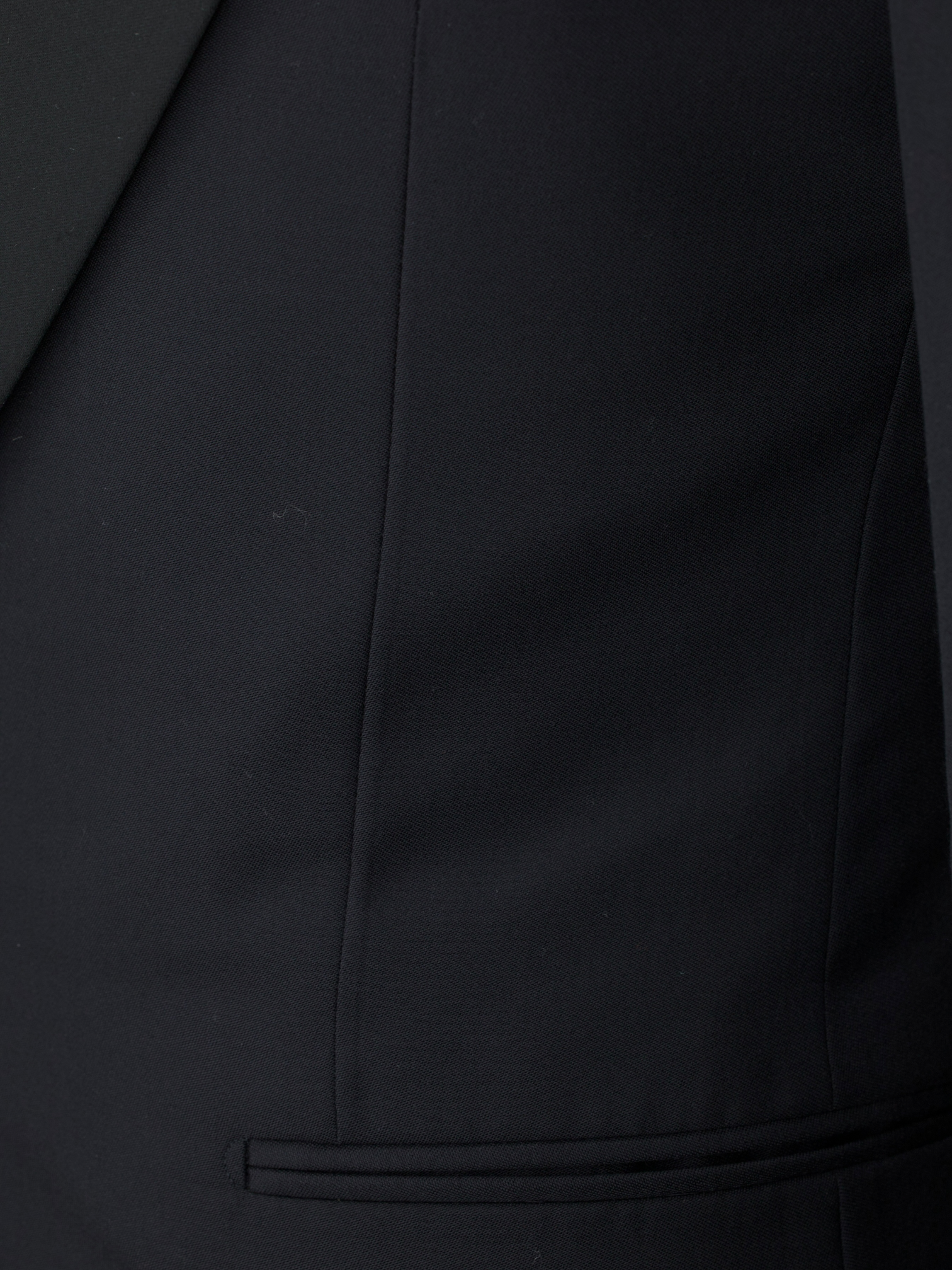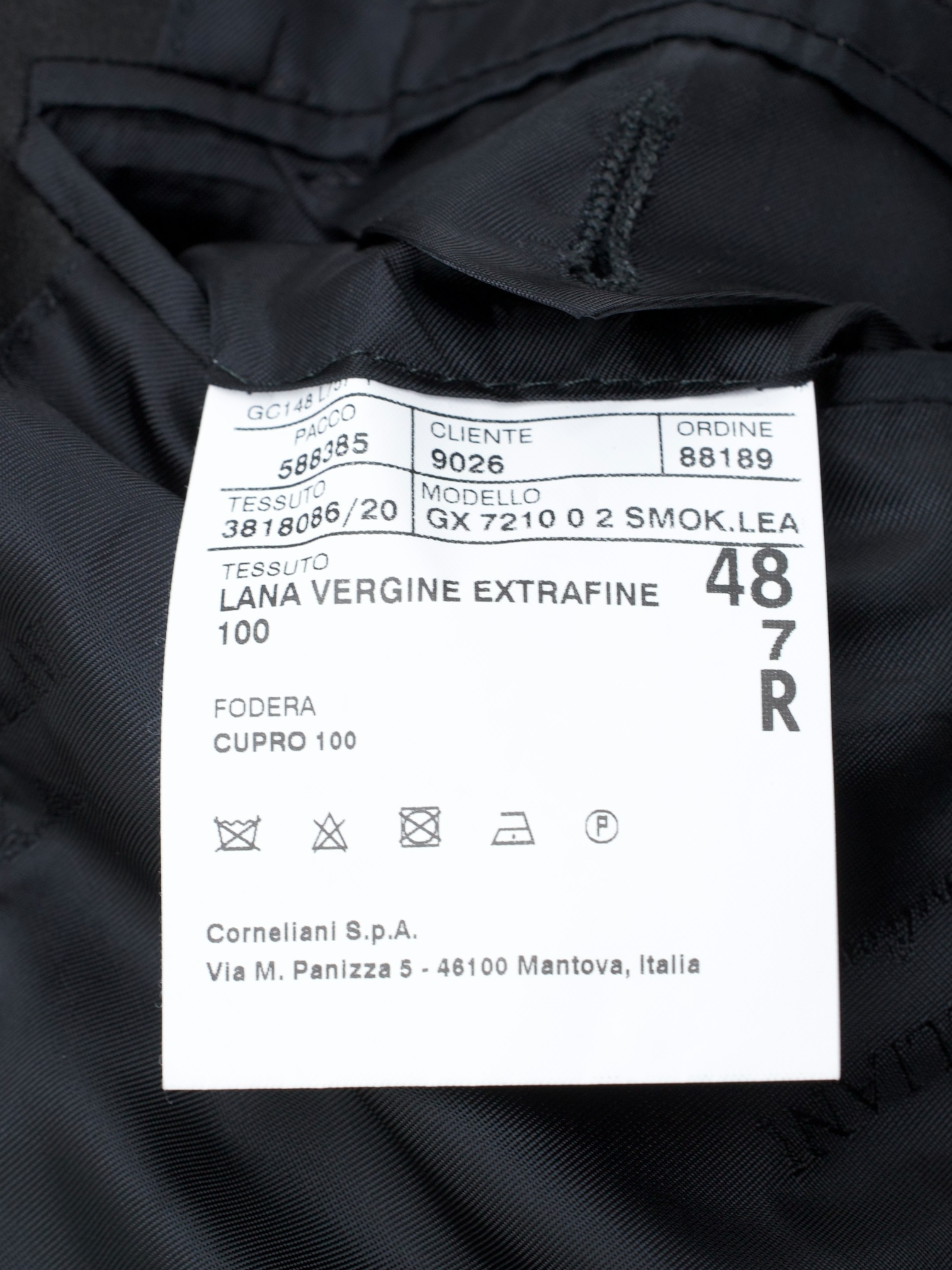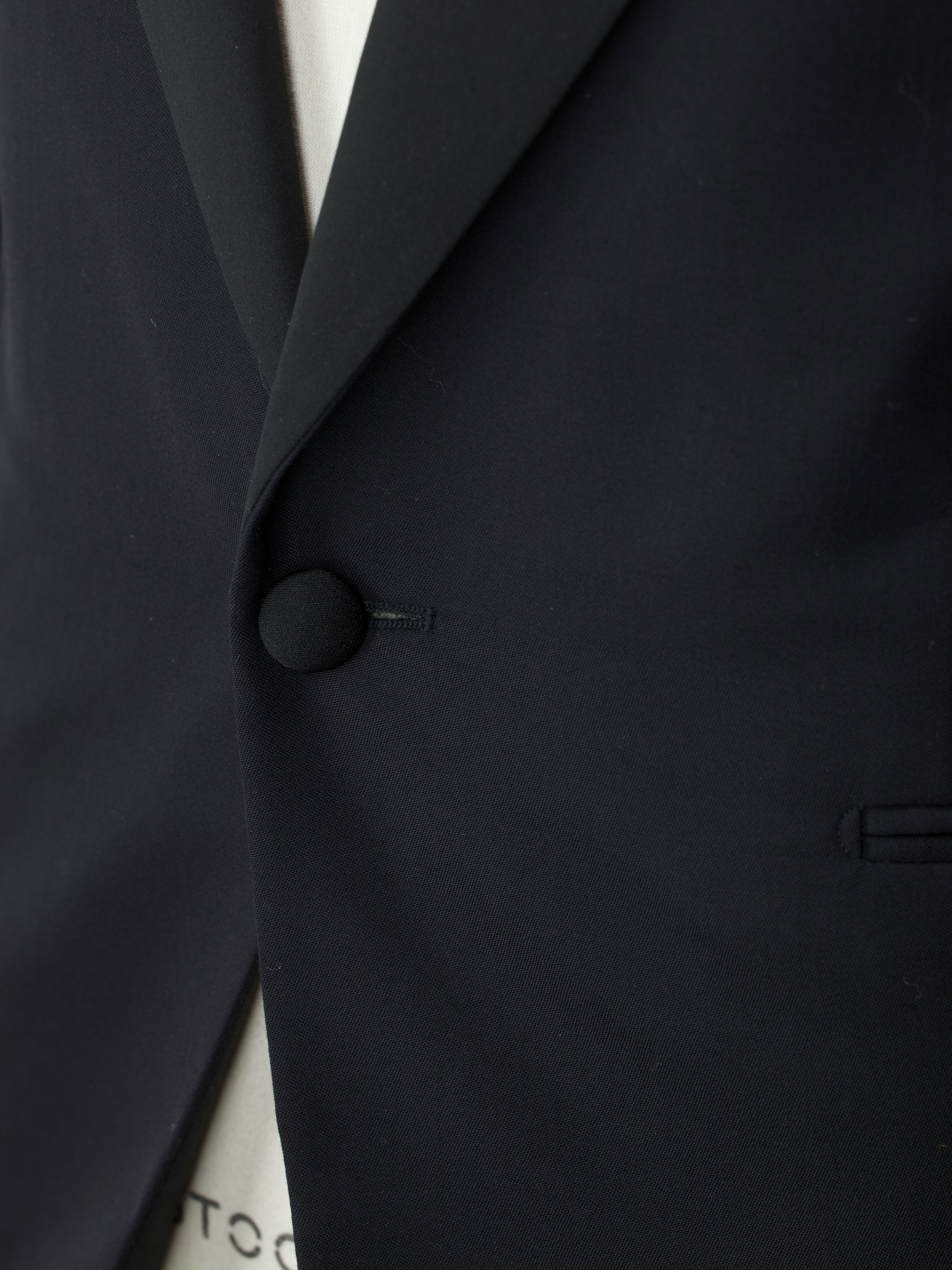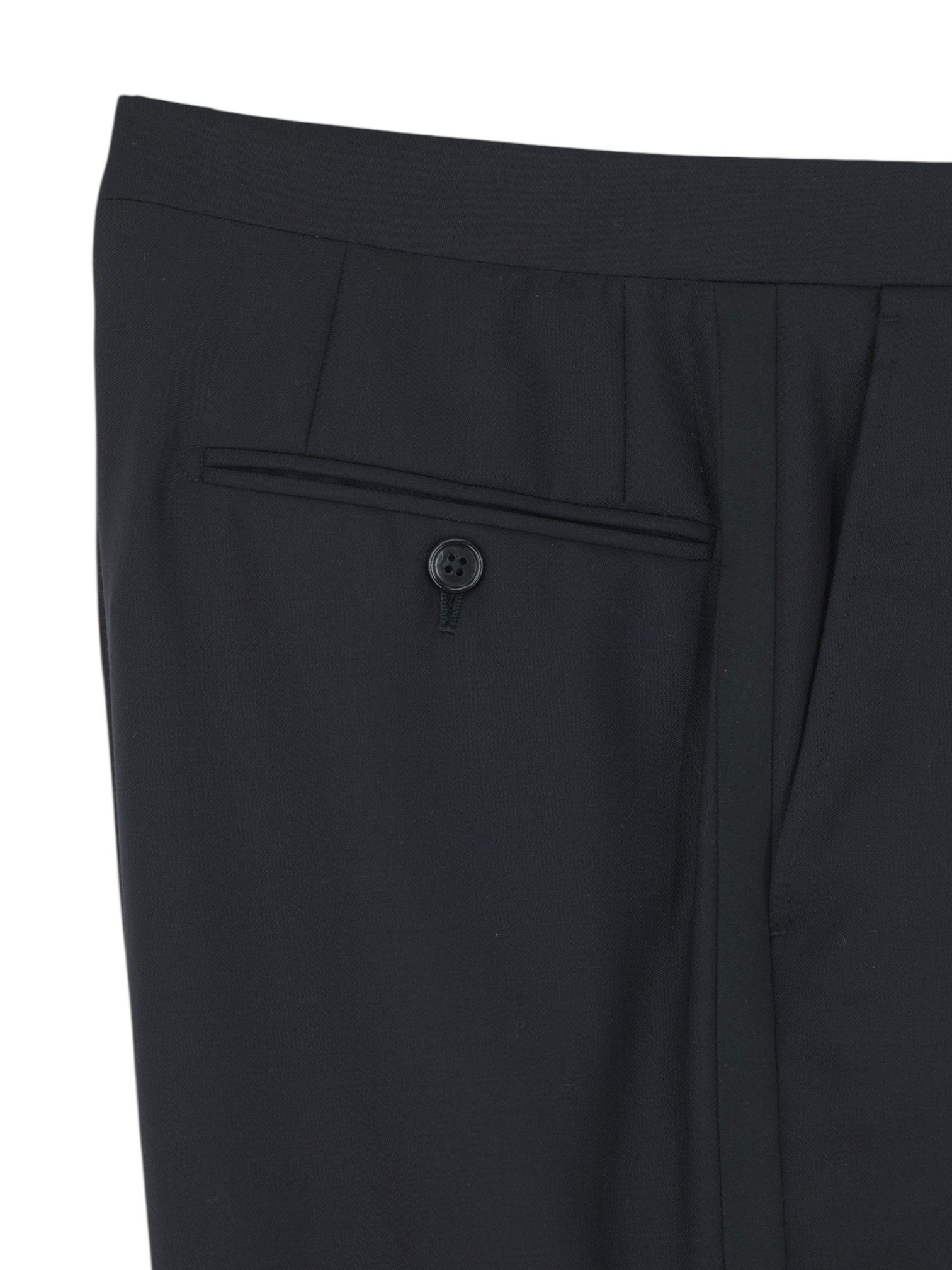 Part of Corneliani’s Ceremonia line, the house’s dedicated formalwear collection, this tuxedo is constructed with careful attention to proportion and finish. The Super 150’s wool lends fluidity and a gentle lustre, enhancing the depth of black under evening light. The trousers are equipped with internal buttons for traditional suspenders, reinforcing the formal integrity of the ensemble and ensuring a clean waistband without reliance on a belt. It is a piece that honours sartorial tradition while delivering the quiet confidence expected of modern formal tailoring. Discover the elaborated sartorial details below.
