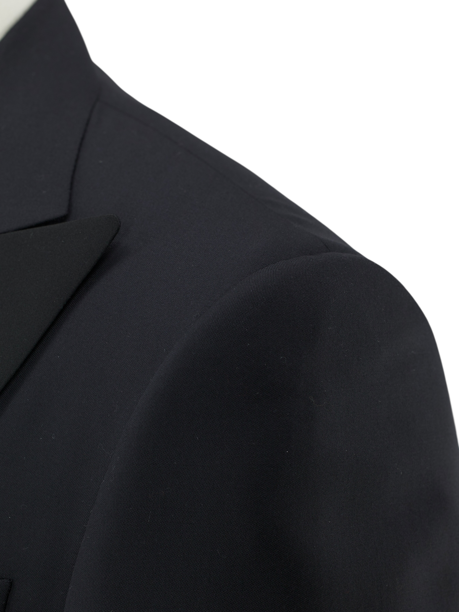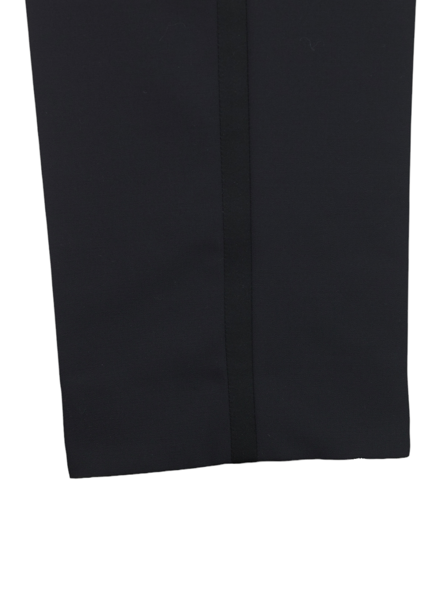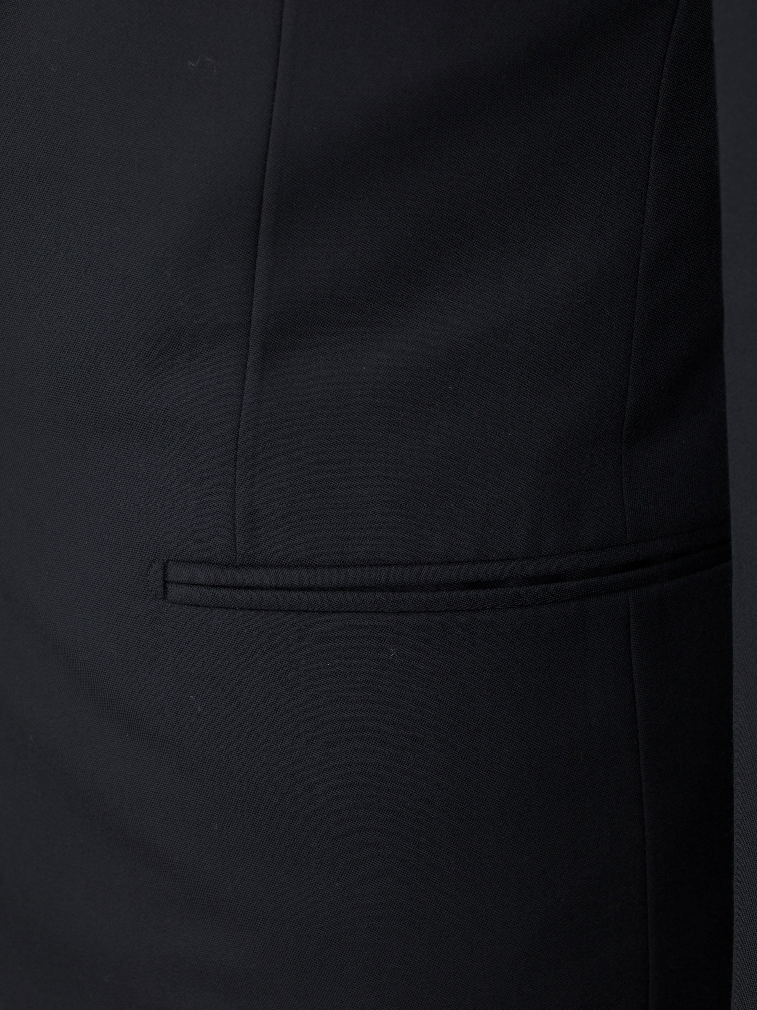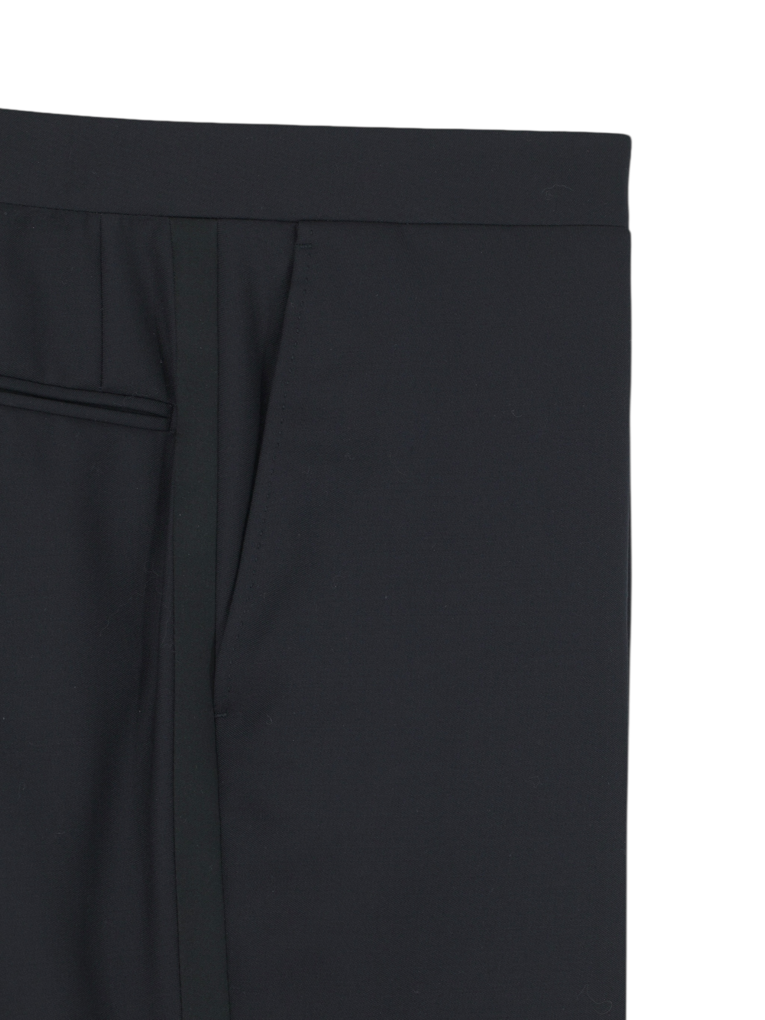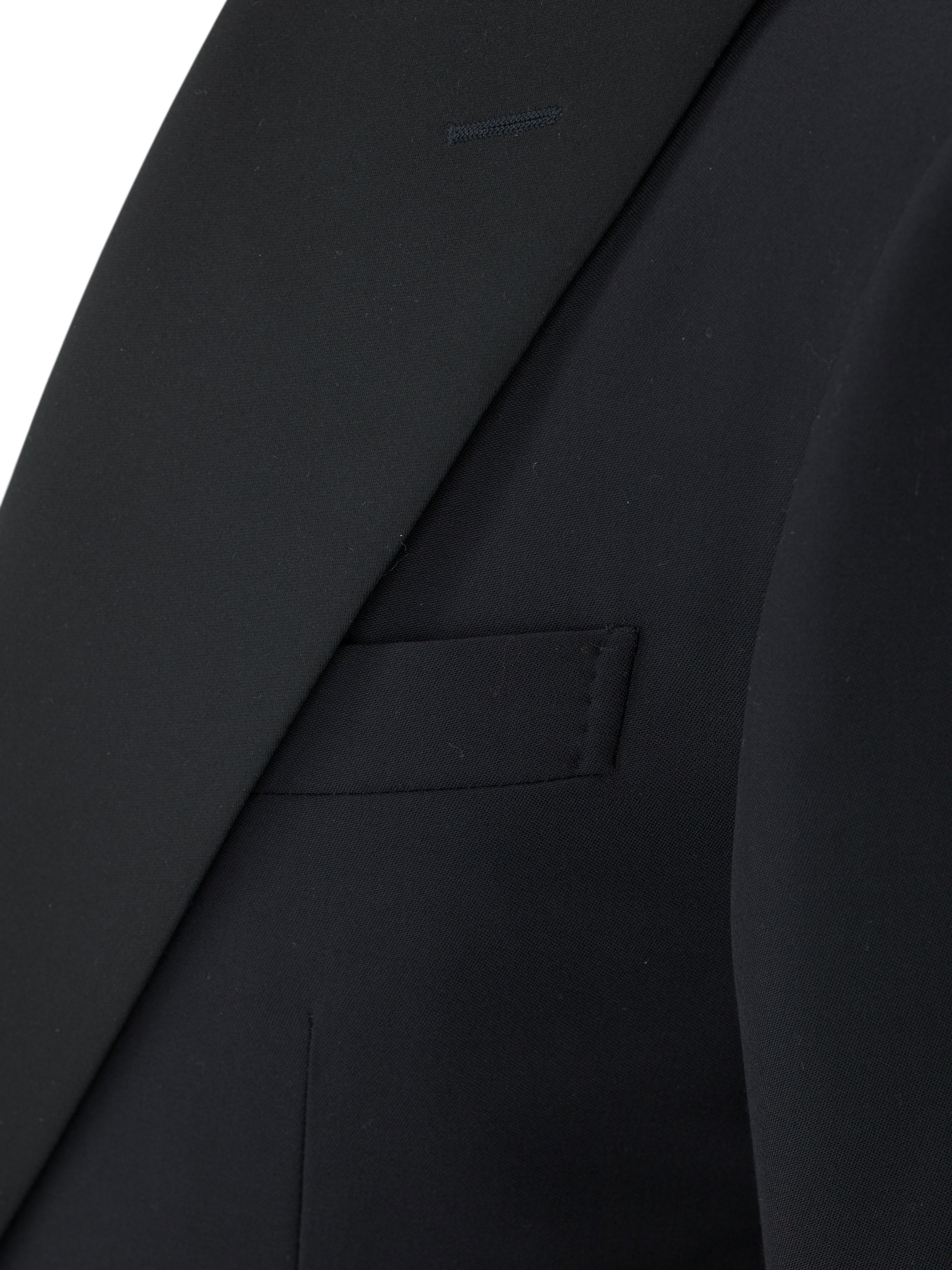 Part of Corneliani’s Ceremonia line, the house’s dedicated formalwear collection, this tuxedo is constructed with careful attention to proportion and finish. The Super 150’s wool lends fluidity and a gentle lustre, enhancing the depth of black under evening light. The trousers are equipped with internal buttons for traditional suspenders, reinforcing the formal integrity of the ensemble and ensuring a clean waistband without reliance on a belt. It is a piece that honours sartorial tradition while delivering the quiet confidence expected of modern formal tailoring. Discover the elaborated sartorial details below.