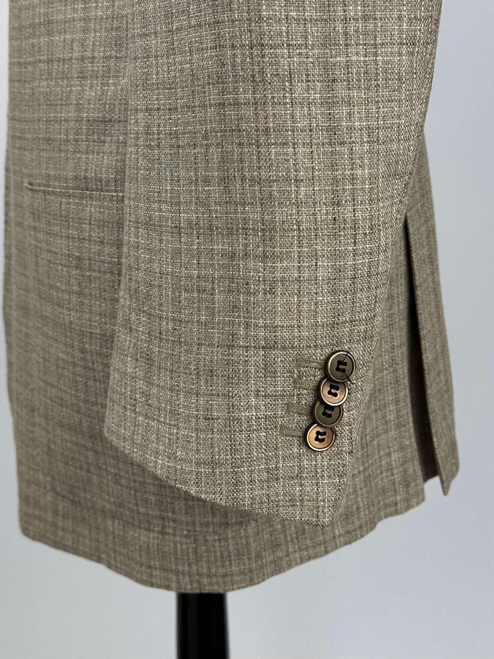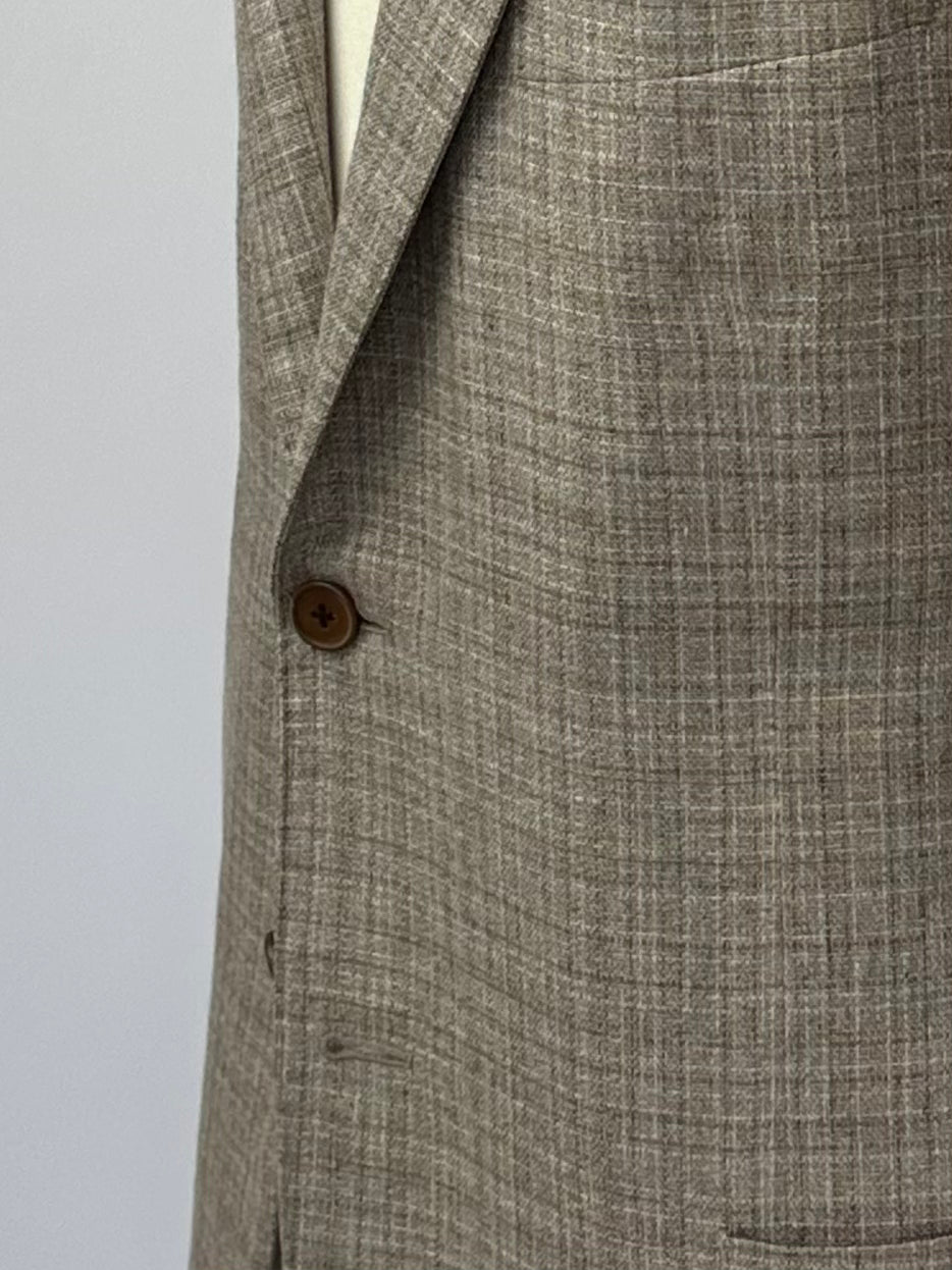 Beige unlined blazer, cut from pure luxury silk with notch lapels, patch pockets, double side vent and mother of pearl buttons. Discover the elaborated sartorial details below.