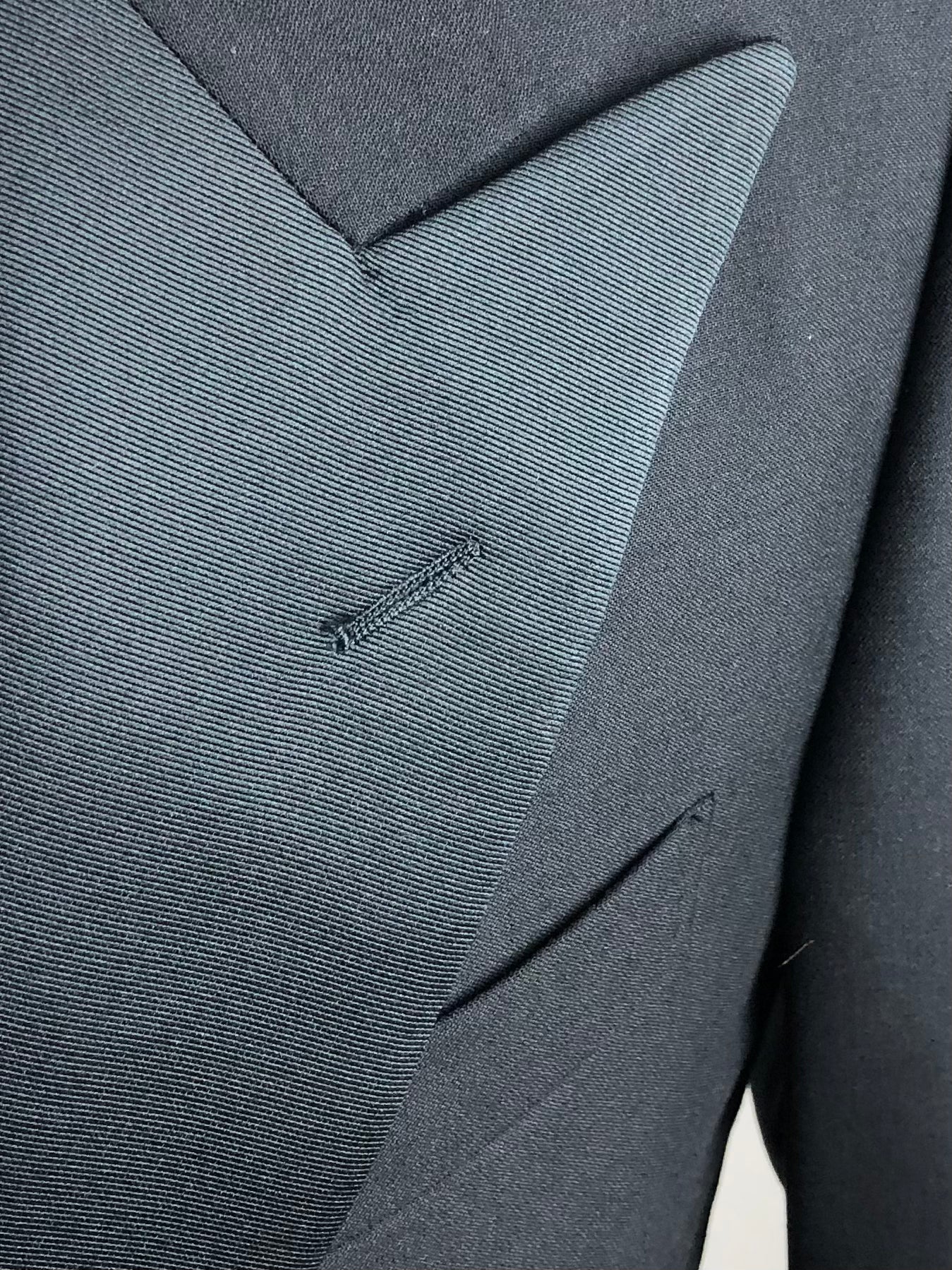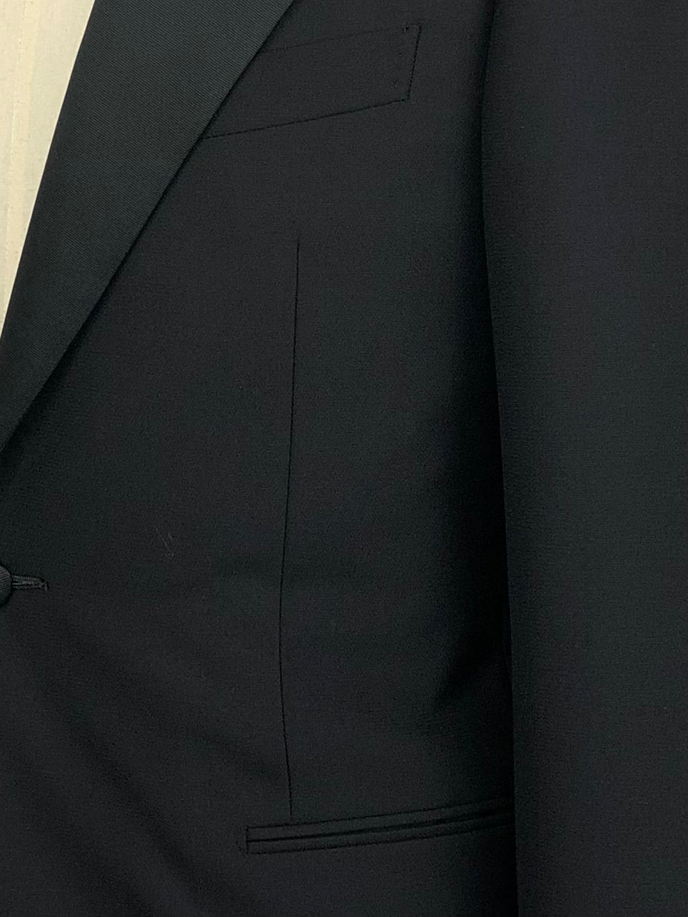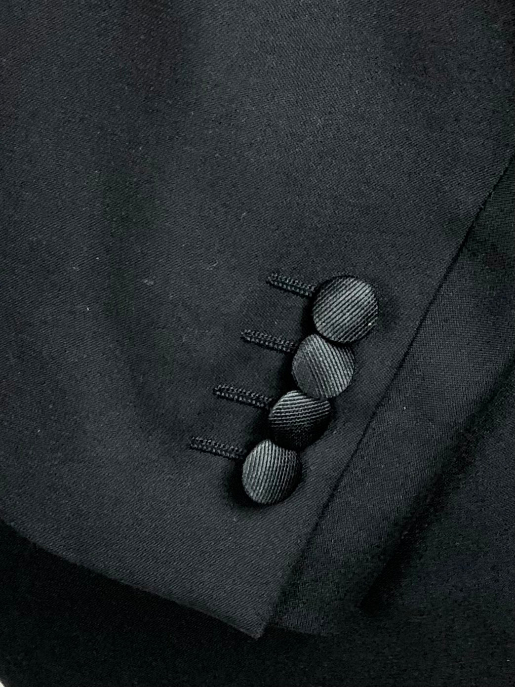 As seen in the Godfather movies - black classic Italian Tuxedo, cut from a luxury Super 150’s virgin wool with peak lapels, jetted pockets, no vent, silk buttons and flat front trousers with silk piping along the legs. Discover the elaborated sartorial details below.