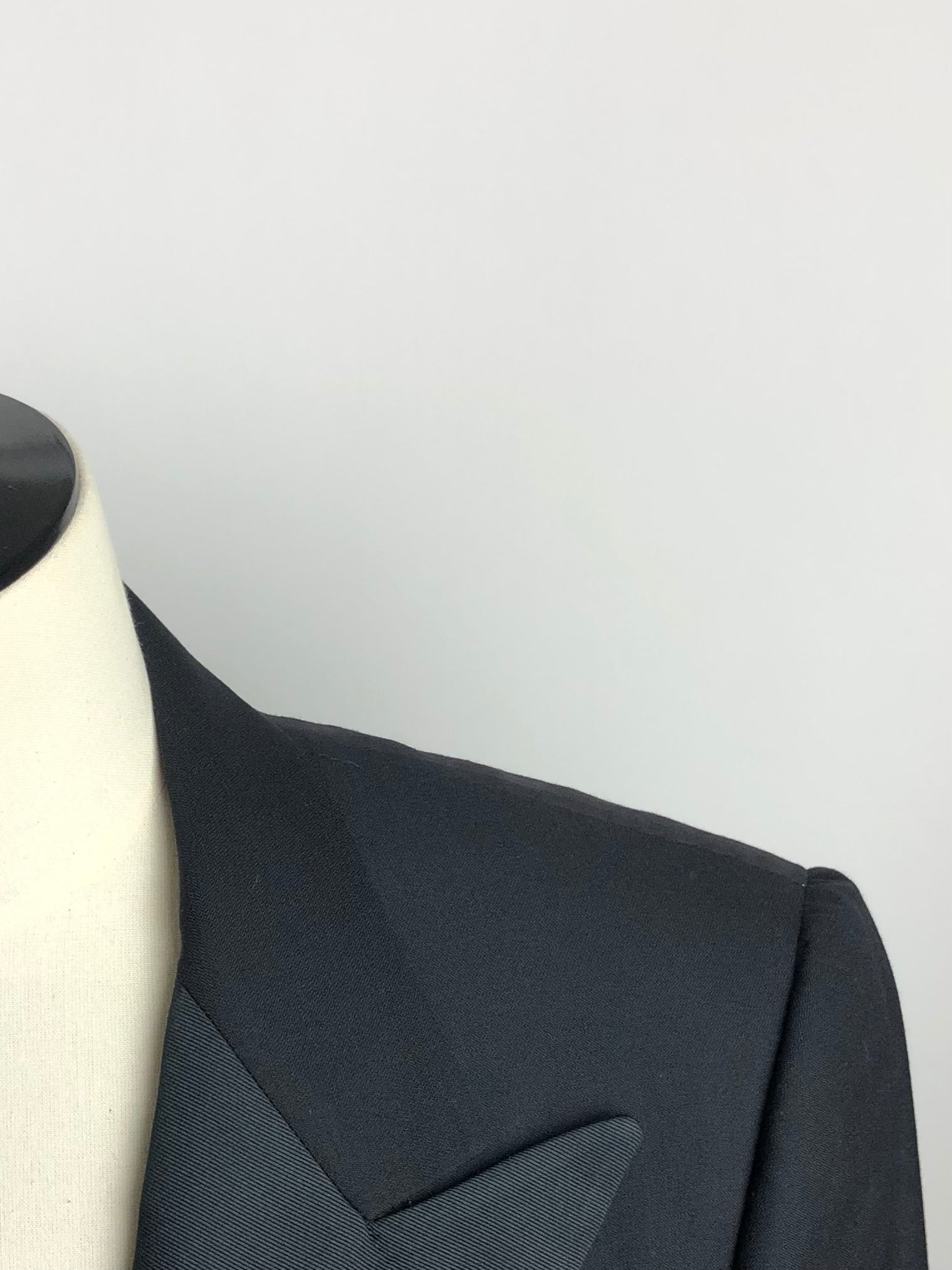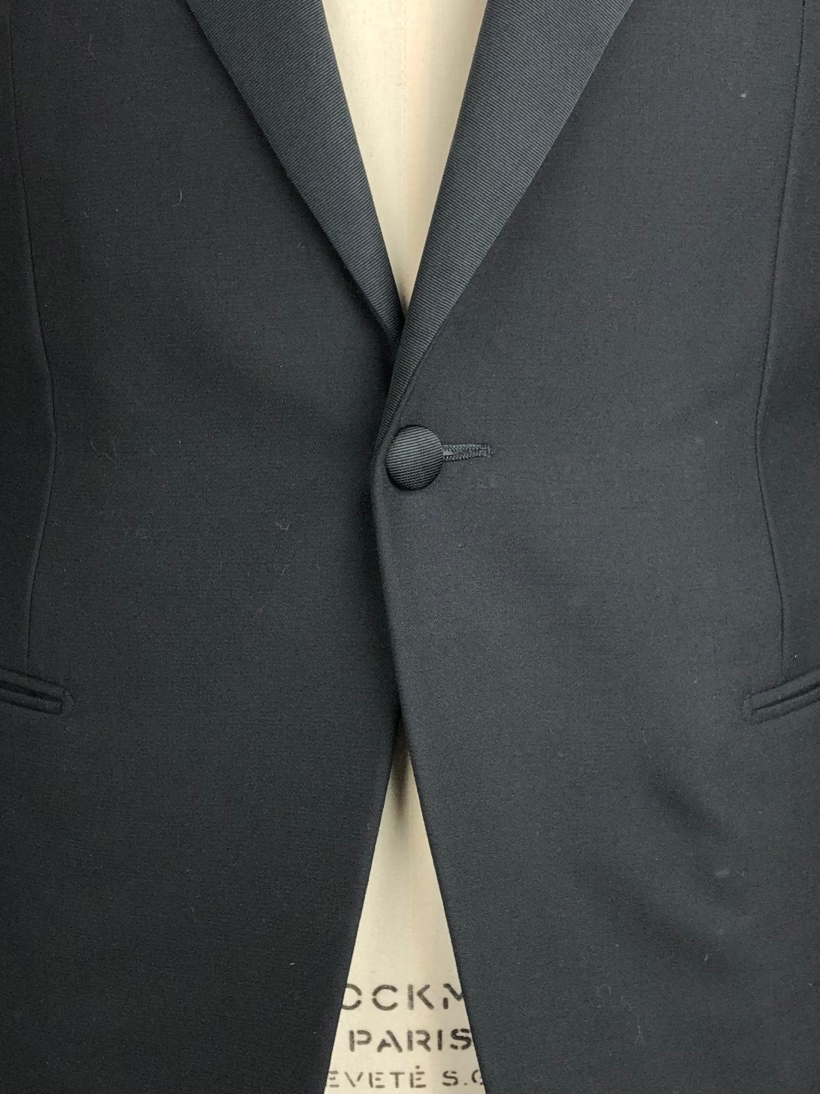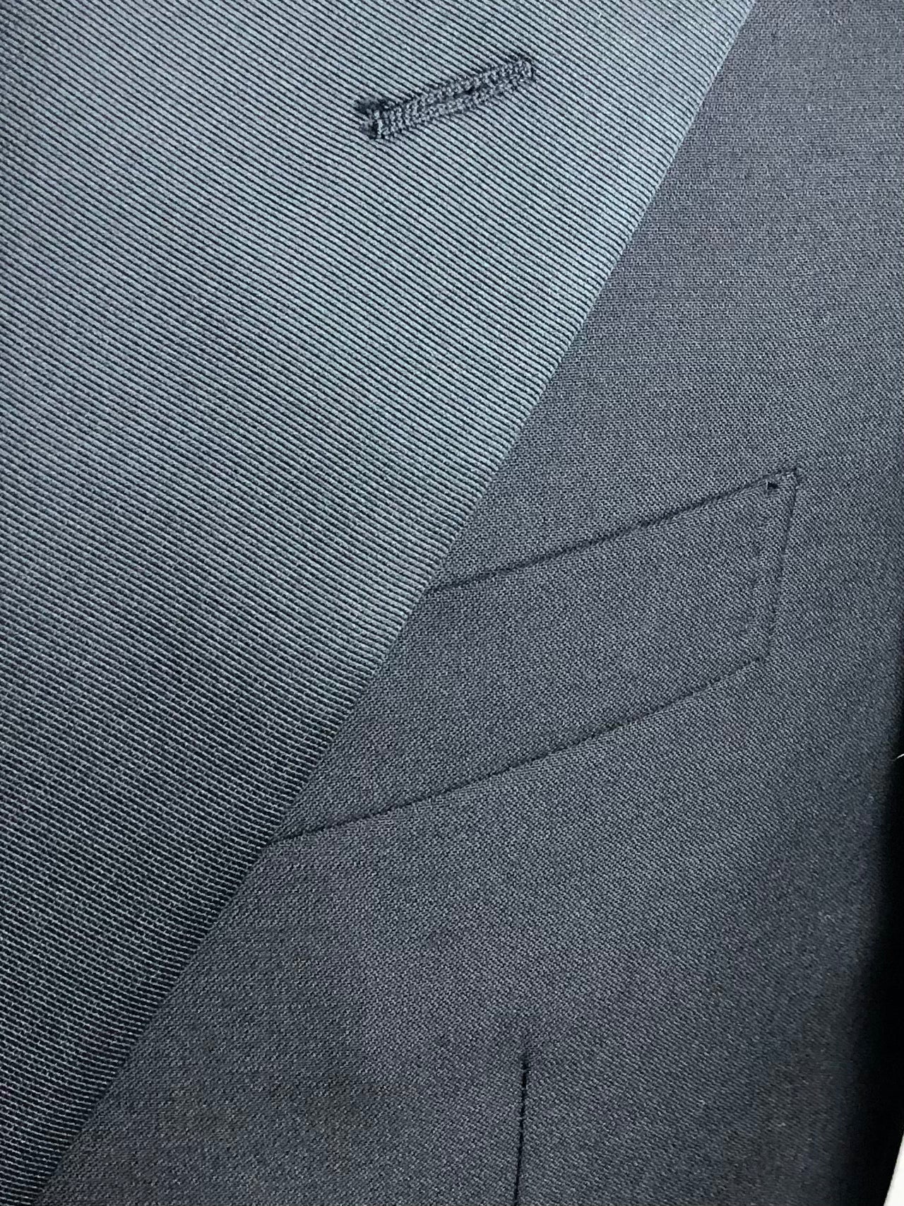 As seen in the Godfather movies - black classic Italian Tuxedo, cut from a luxury Super 150’s virgin wool with peak lapels, jetted pockets, no vent, silk buttons and flat front trousers with silk piping along the legs. Discover the elaborated sartorial details below.