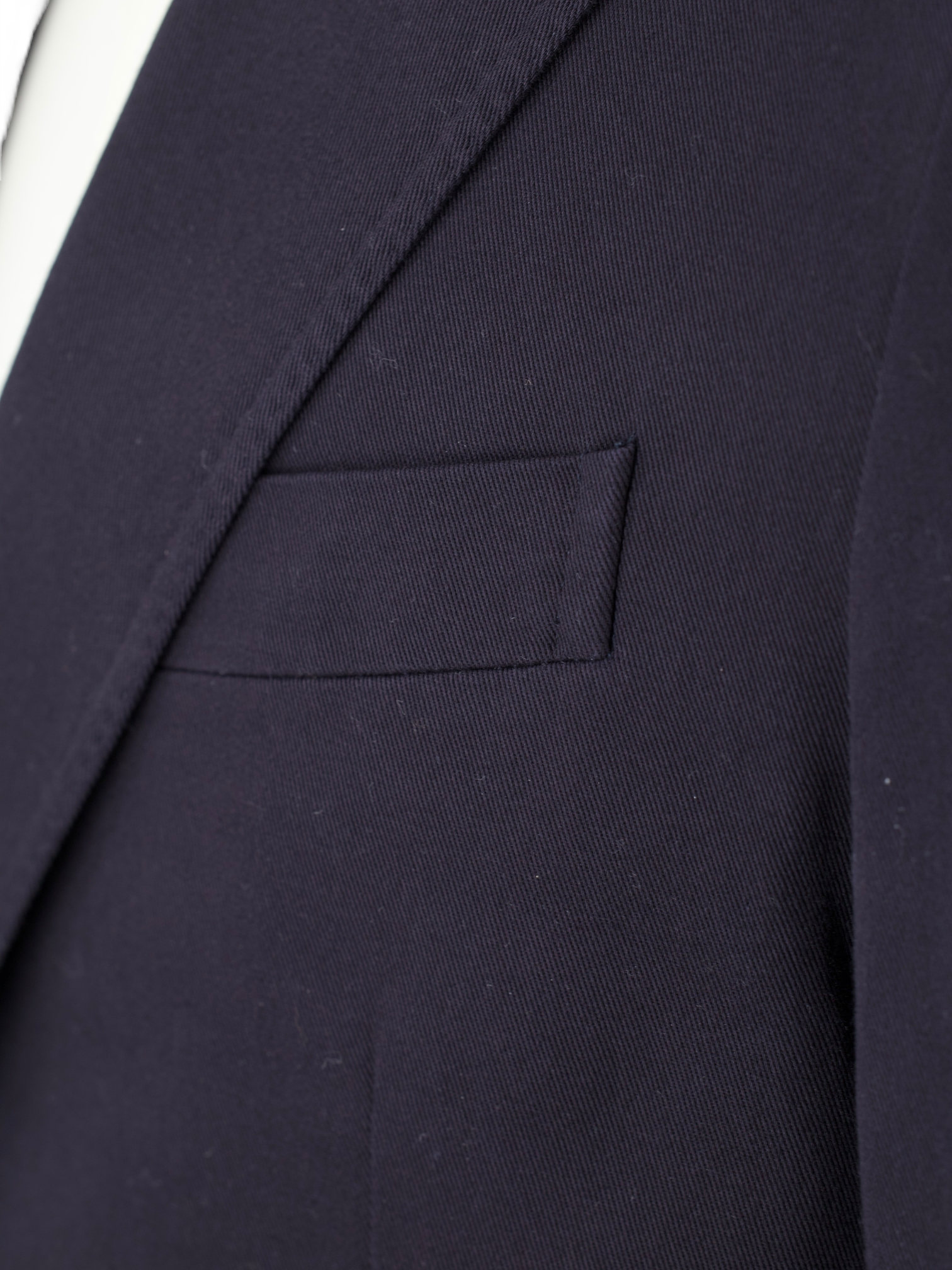 Also known as ‘barchetta’ Italian for ‘little boat’, it is so named because this pocket floats on the chest gently angled upward, just like the bow of a sailboat. These pockets echo the lively roll of a lapel that carries the spring of canvas and natural wool, unlike machine-made chest pockets that have a more stamped-out, rectangular shape and less life.