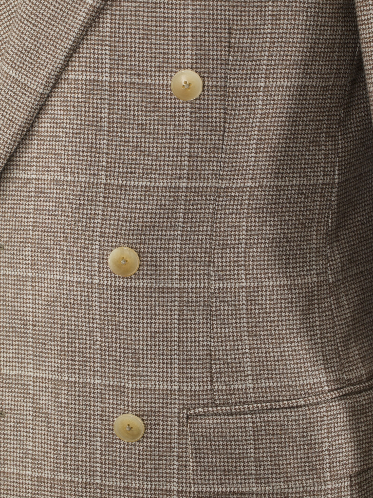 Discover the Ermenegildo Zegna Couture light brown jacket, crafted from pure cashmere in a soft windowpane check that blends understated pattern with a warm, tonal palette. The fabric is deeply plush with a velvety hand, offering both visual richness and exceptional comfort. Tailored in a six-button double-breasted configuration, the jacket features sharp peak lapels, flap pockets with a ticket pocket, and a fully lined interior for a clean, structured drape.