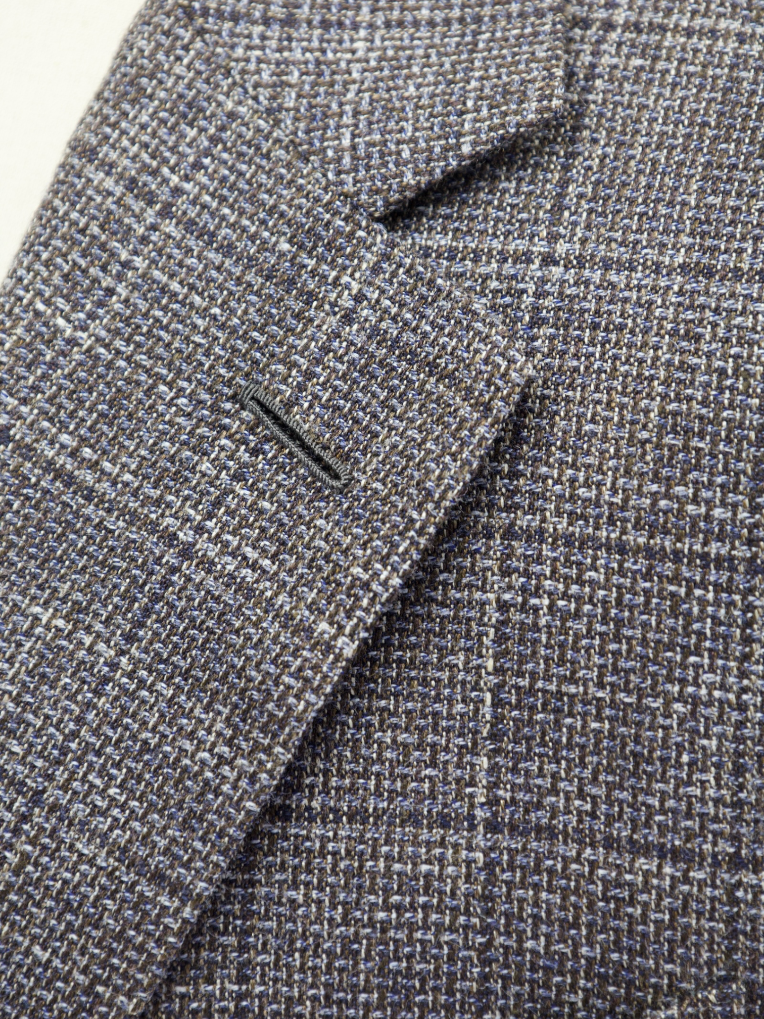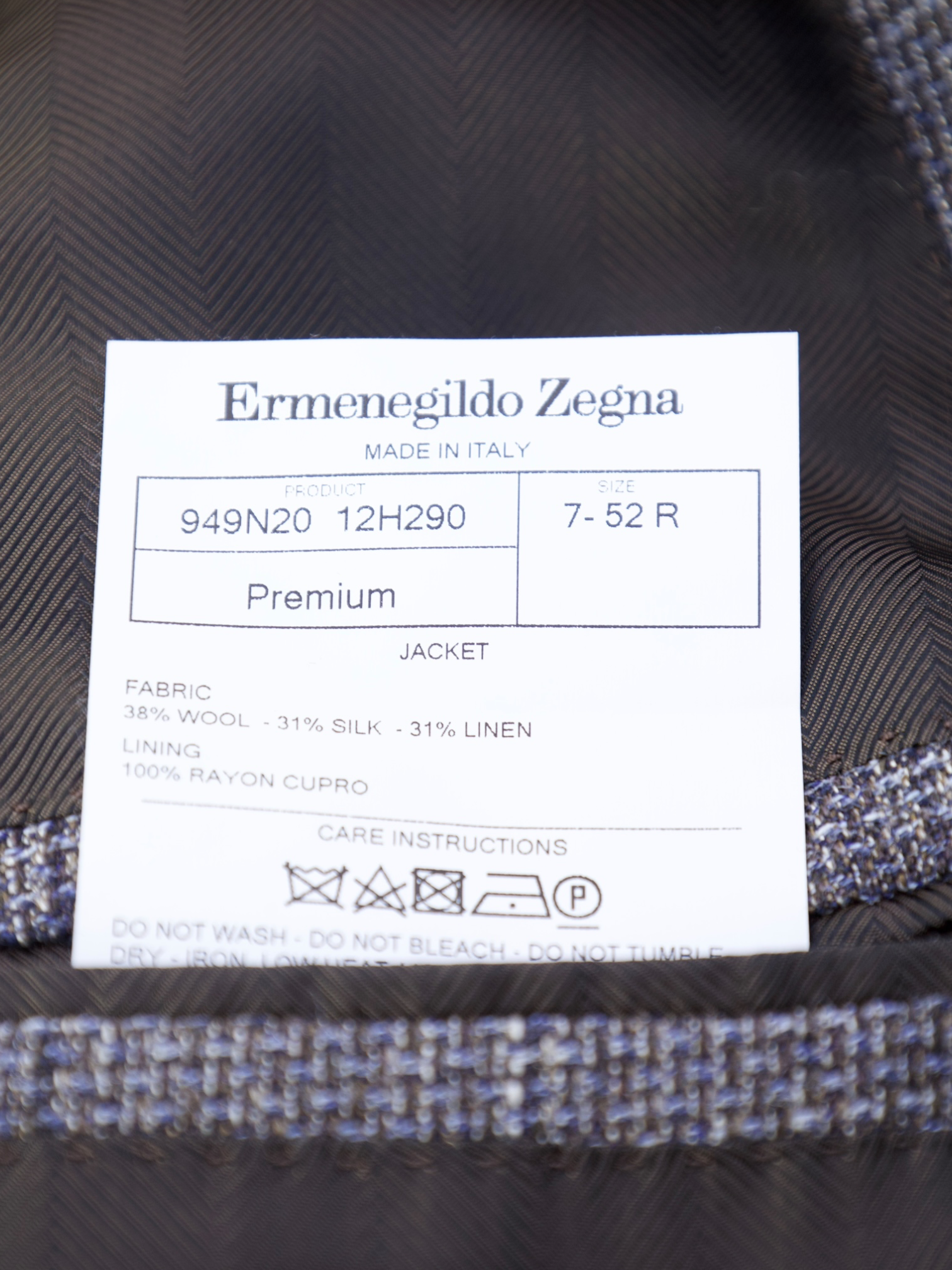 This couture jacket is meticulously handcrafted in Ermenegildo Zegna’s exclusive atelier, showcasing the brand’s dedication to precision and luxury. The wool, silk, and linen blend is sourced from Zegna’s renowned mills, where it is expertly woven to create a fabric that balances elegance, softness, and durability. Artisans invest countless hours in hand-finishing details such as the lapel roll, seam alignment, and buttonholes, ensuring a garment of unparalleled quality and refinement. This piece exemplifies Zegna’s commitment to timeless design and contemporary craftsmanship. Discover the elaborated sartorial details below.