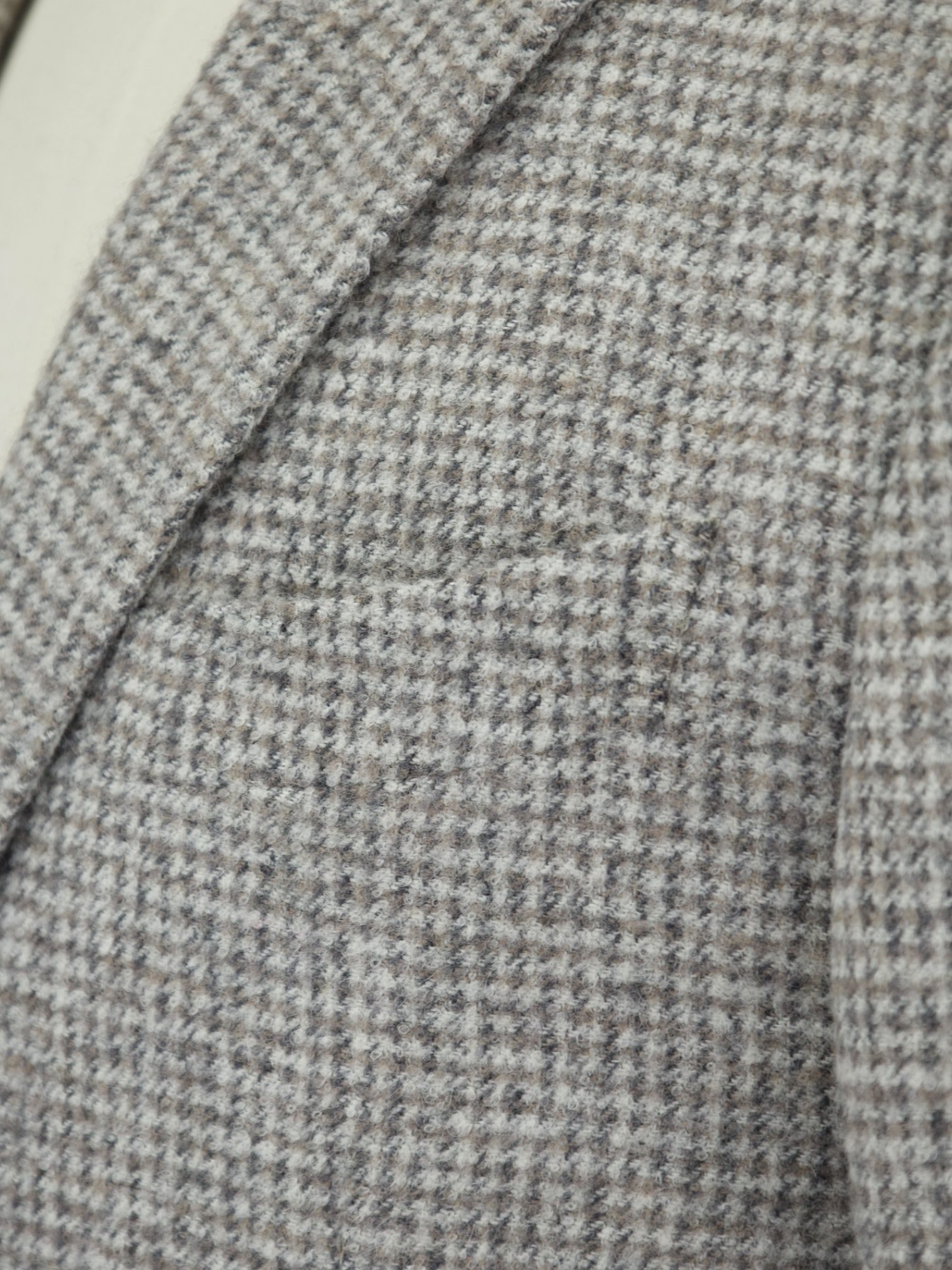 Also known as ‘barchetta’ Italian for ‘little boat’, it is so named because this pocket floats on the chest gently angled upward, just like the bow of a sailboat. These pockets echo the lively roll of a lapel that carries the spring of canvas and natural wool, unlike machine-made chest pockets that have a more stamped-out, rectangular shape and less life.