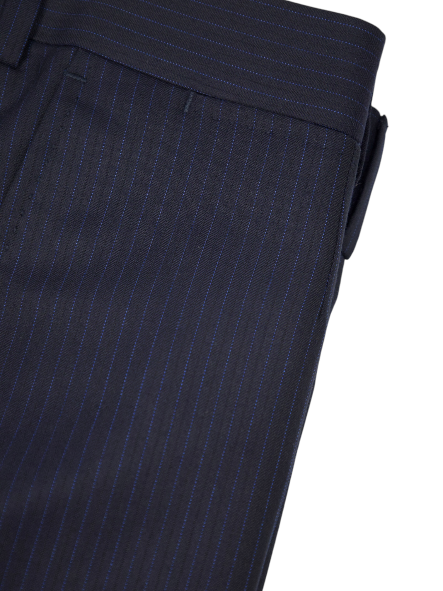The suit features a classic navy hue adorned with elegant pinstripes, adding a touch of timeless sophistication. The "Mila" fit offers a modern, tailored silhouette that is both comfortable and flattering, making it suitable for formal occasions and high-end business settings. The jacket comes with notch lapels and a single-breasted closure, while the trousers provide a sleek, well-fitted look.