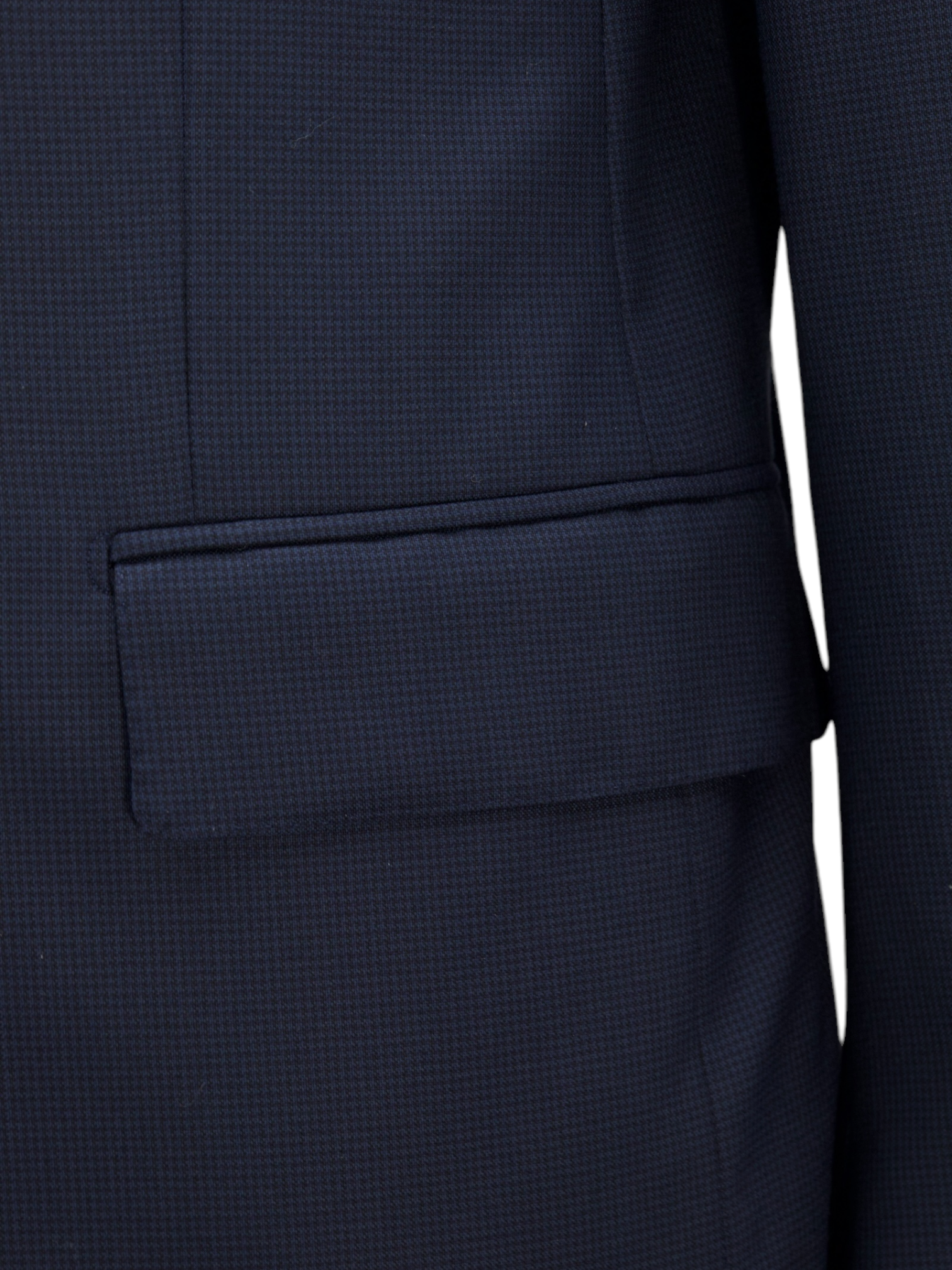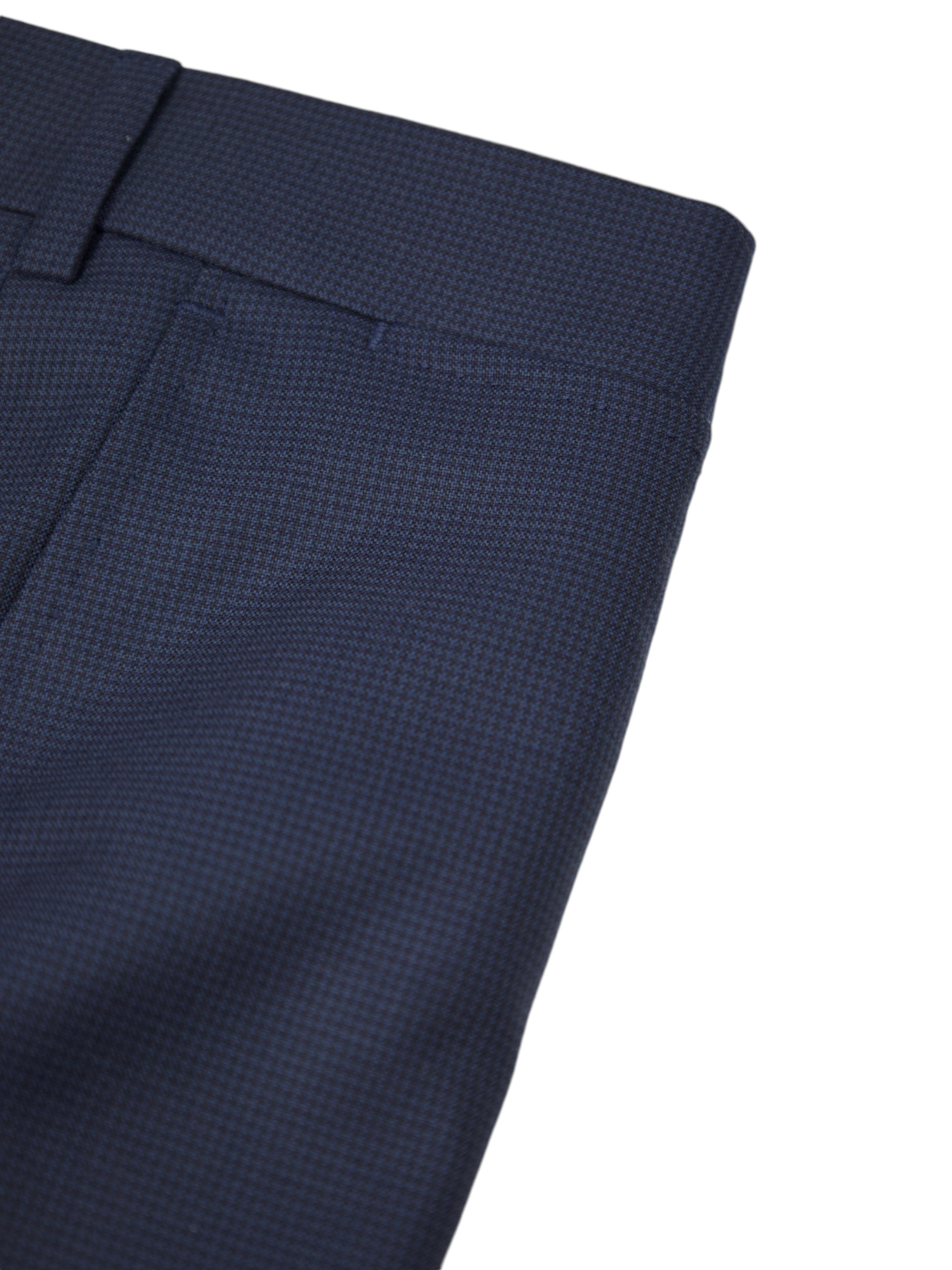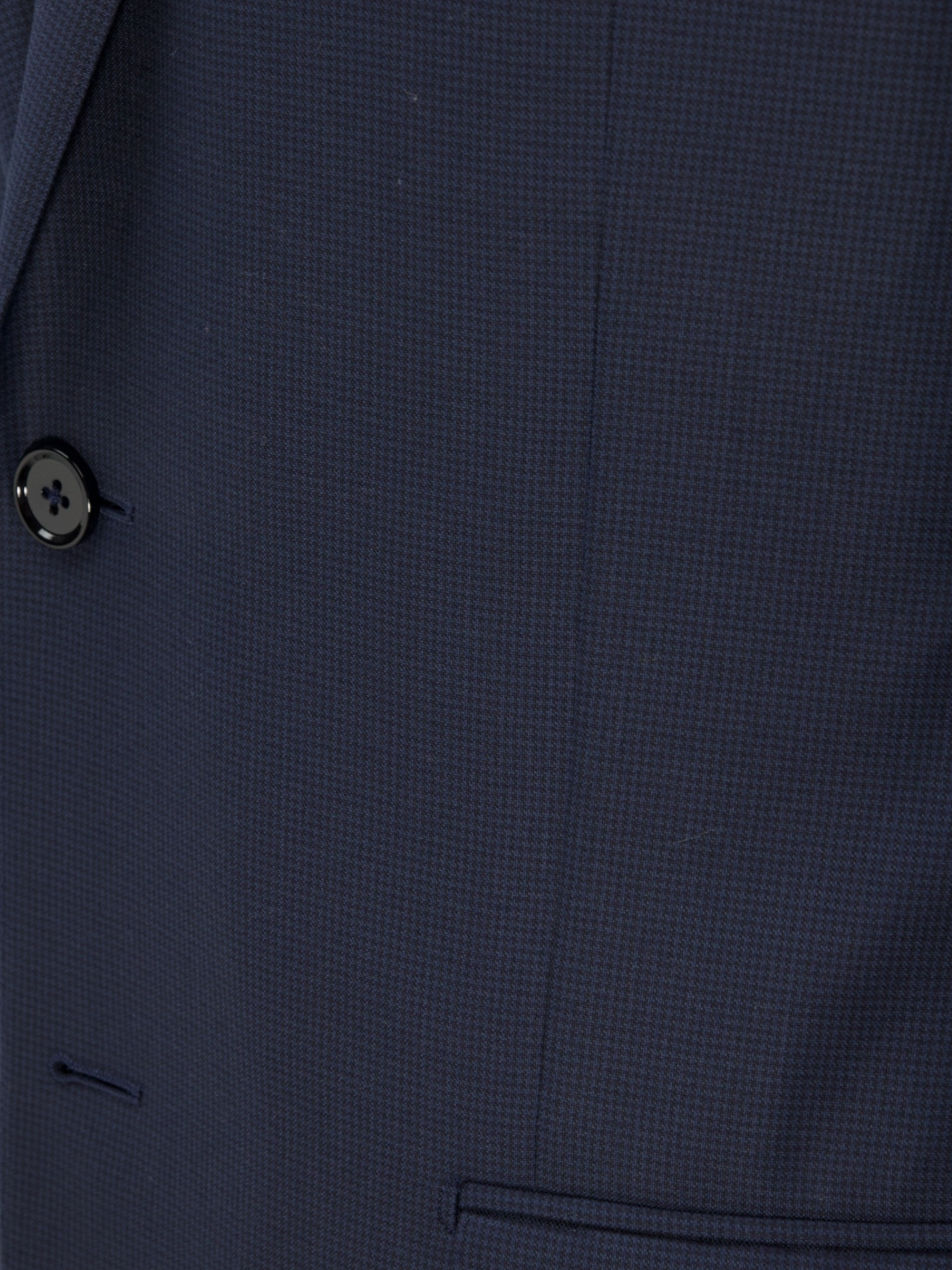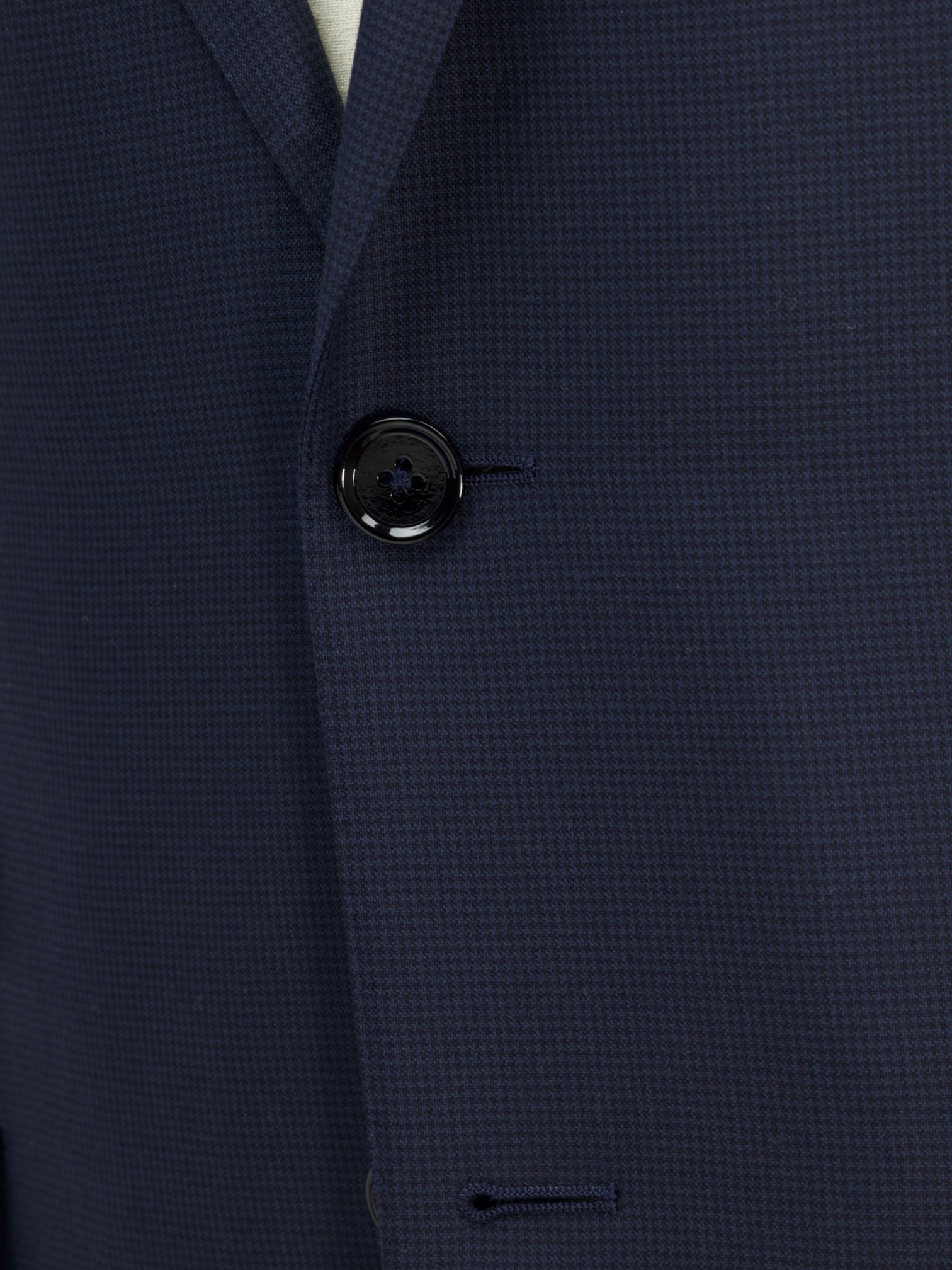 The suit's subtle puppytooth pattern adds a refined texture to the classic navy hue, offering a contemporary twist to traditional suiting. Designed in the 'Mila' fit, the suit provides a modern, tailored silhouette that is both sharp and comfortable. The jacket includes notch lapels and a single-breasted closure, while the trousers are impeccably cut to enhance the overall polished look.