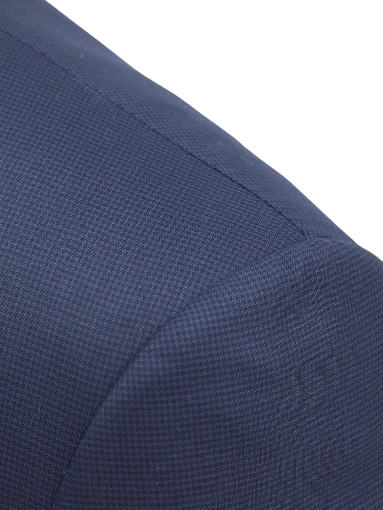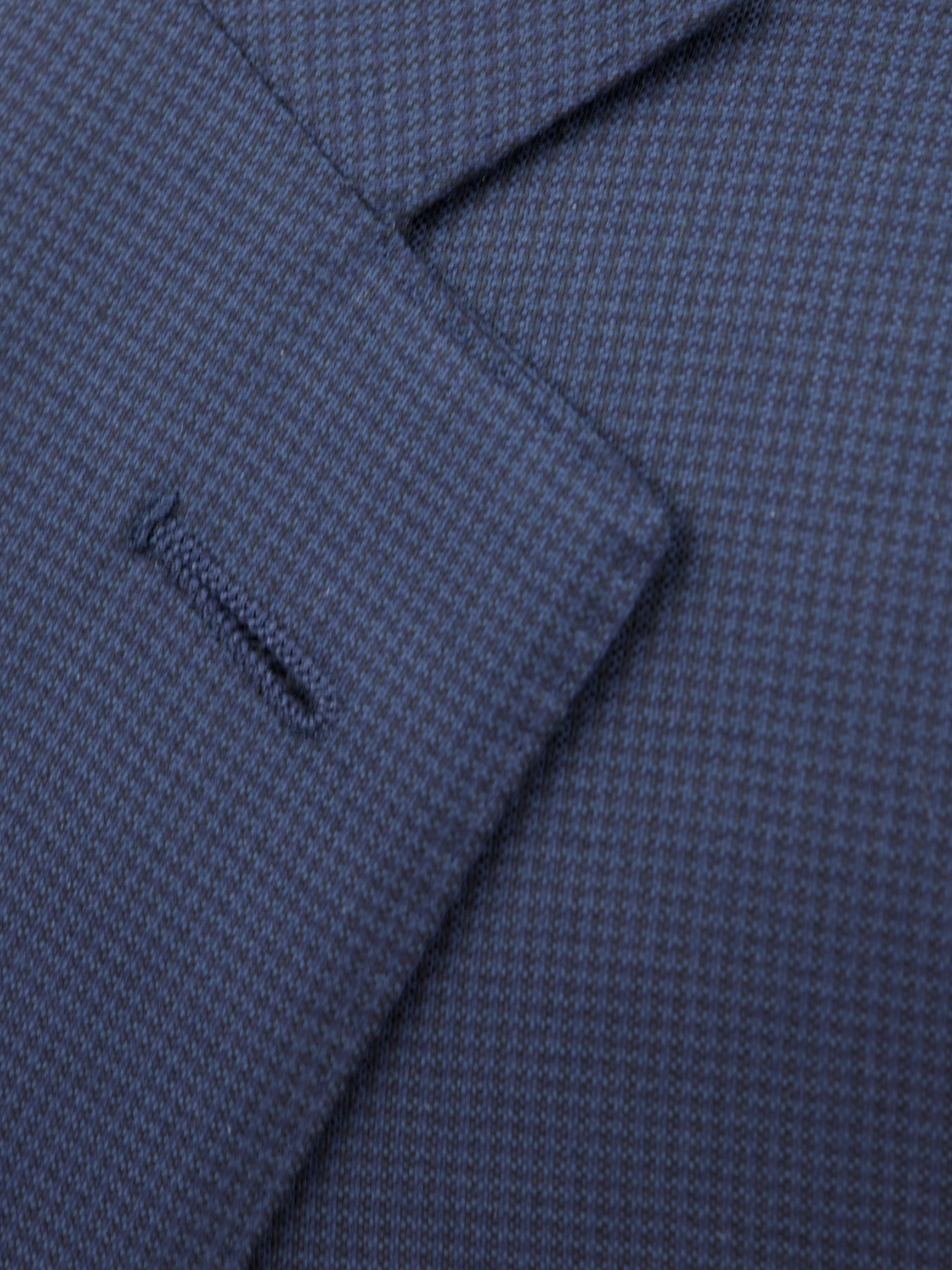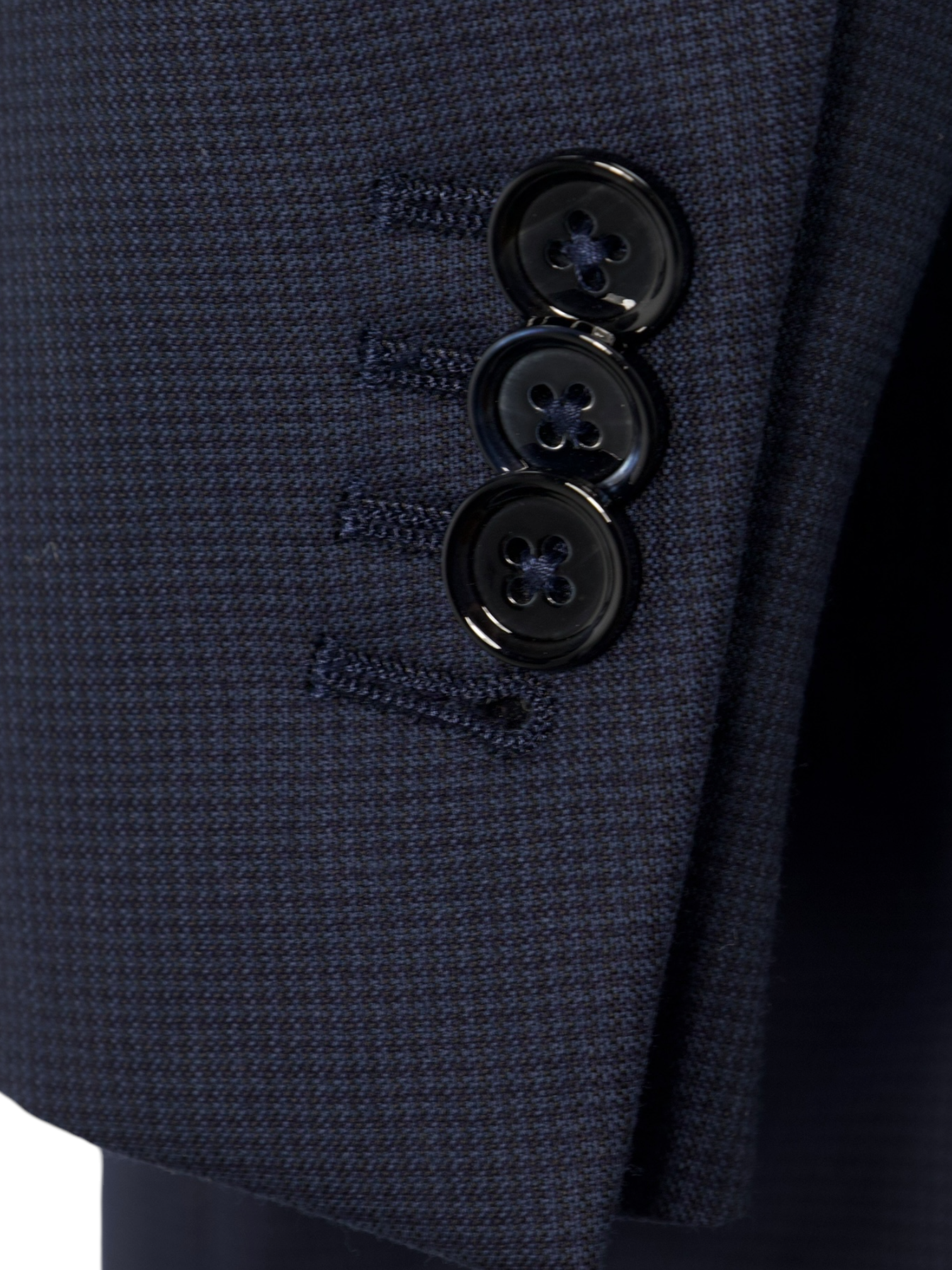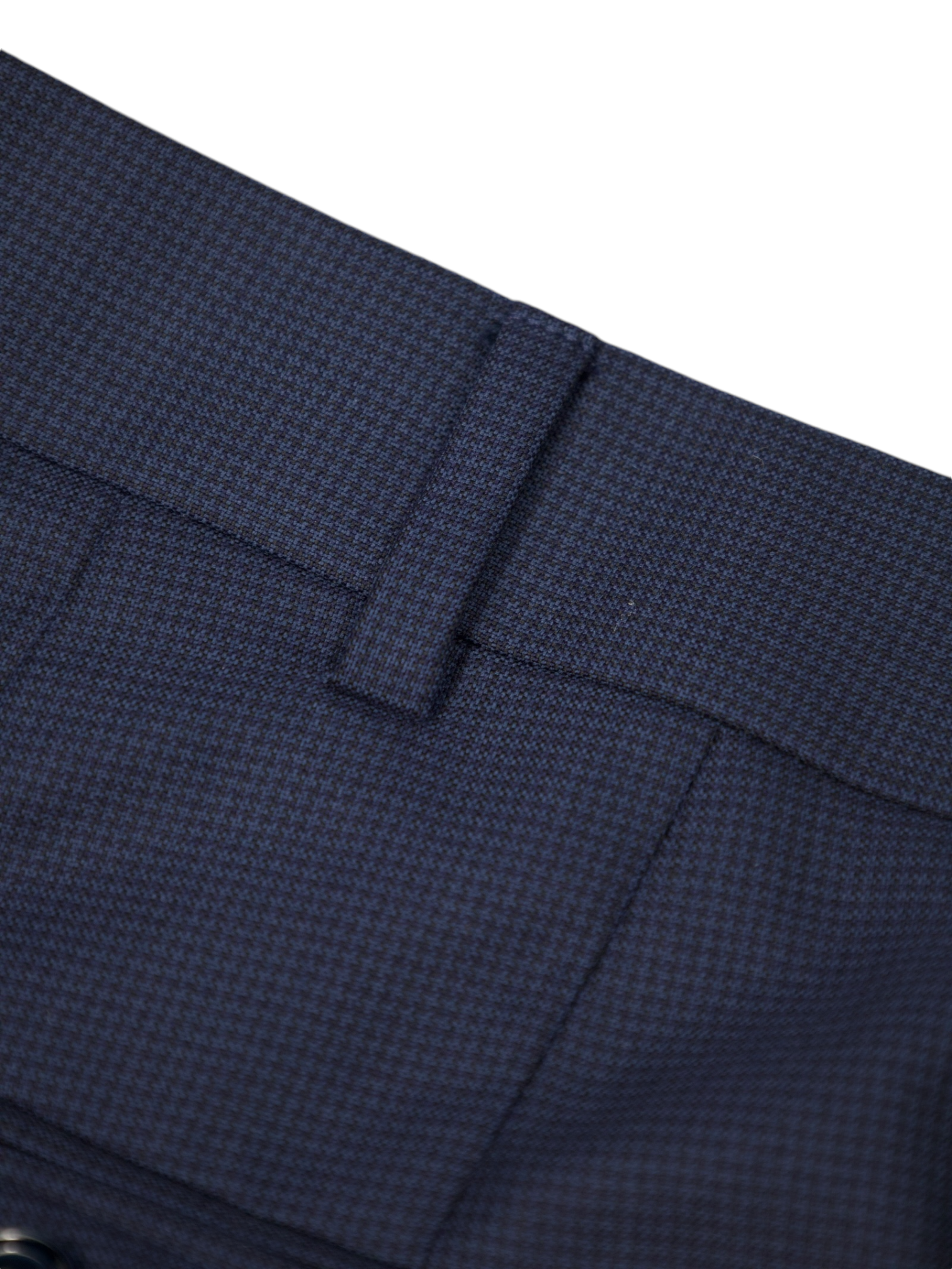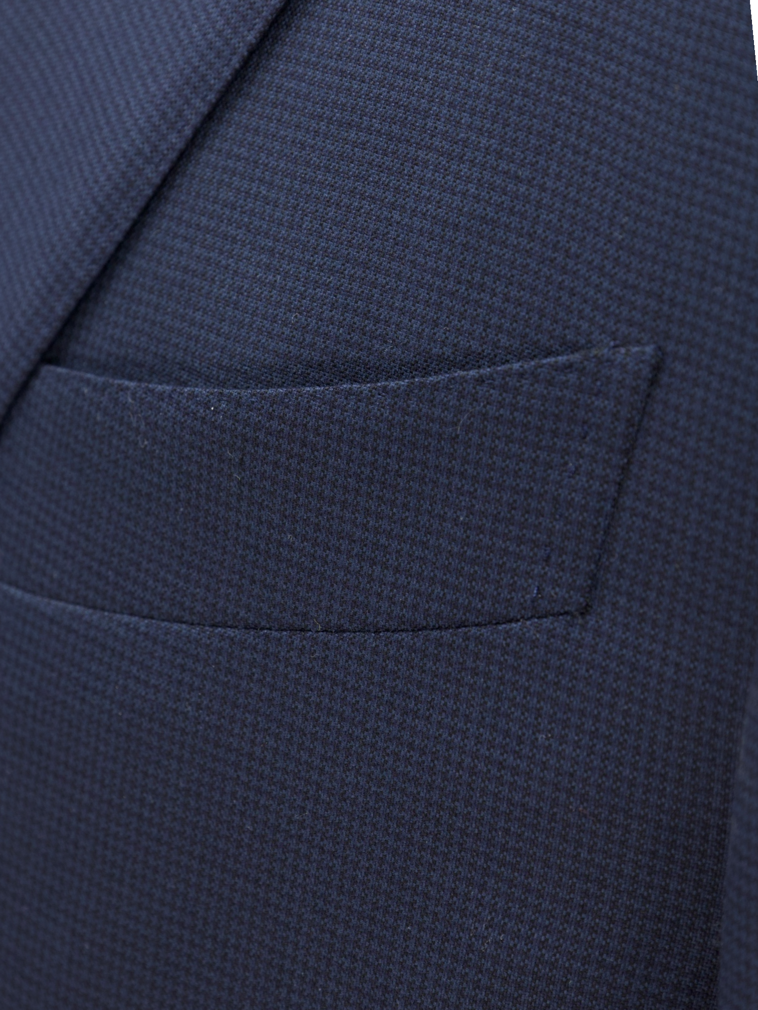 The suit's subtle puppytooth pattern adds a refined texture to the classic navy hue, offering a contemporary twist to traditional suiting. Designed in the 'Mila' fit, the suit provides a modern, tailored silhouette that is both sharp and comfortable. The jacket includes notch lapels and a single-breasted closure, while the trousers are impeccably cut to enhance the overall polished look.