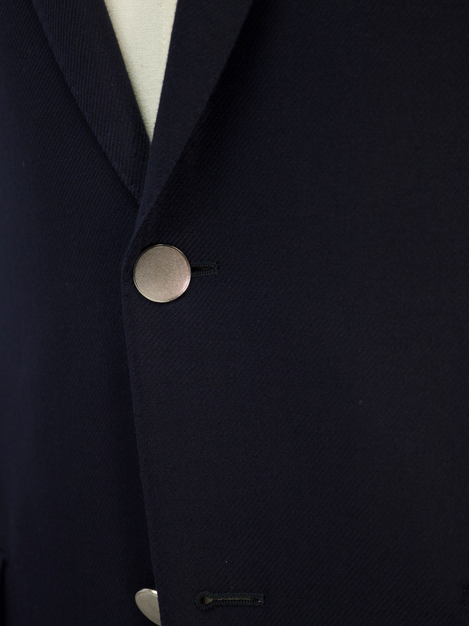 Metal buttons, often silver-colored, add a classic, distinguished touch to blazers, commonly seen on navy or double-breasted styles. These buttons, typically made from brass or stainless steel, enhance the formality of the jacket while providing durability and a polished finish that complements a sartorial look.