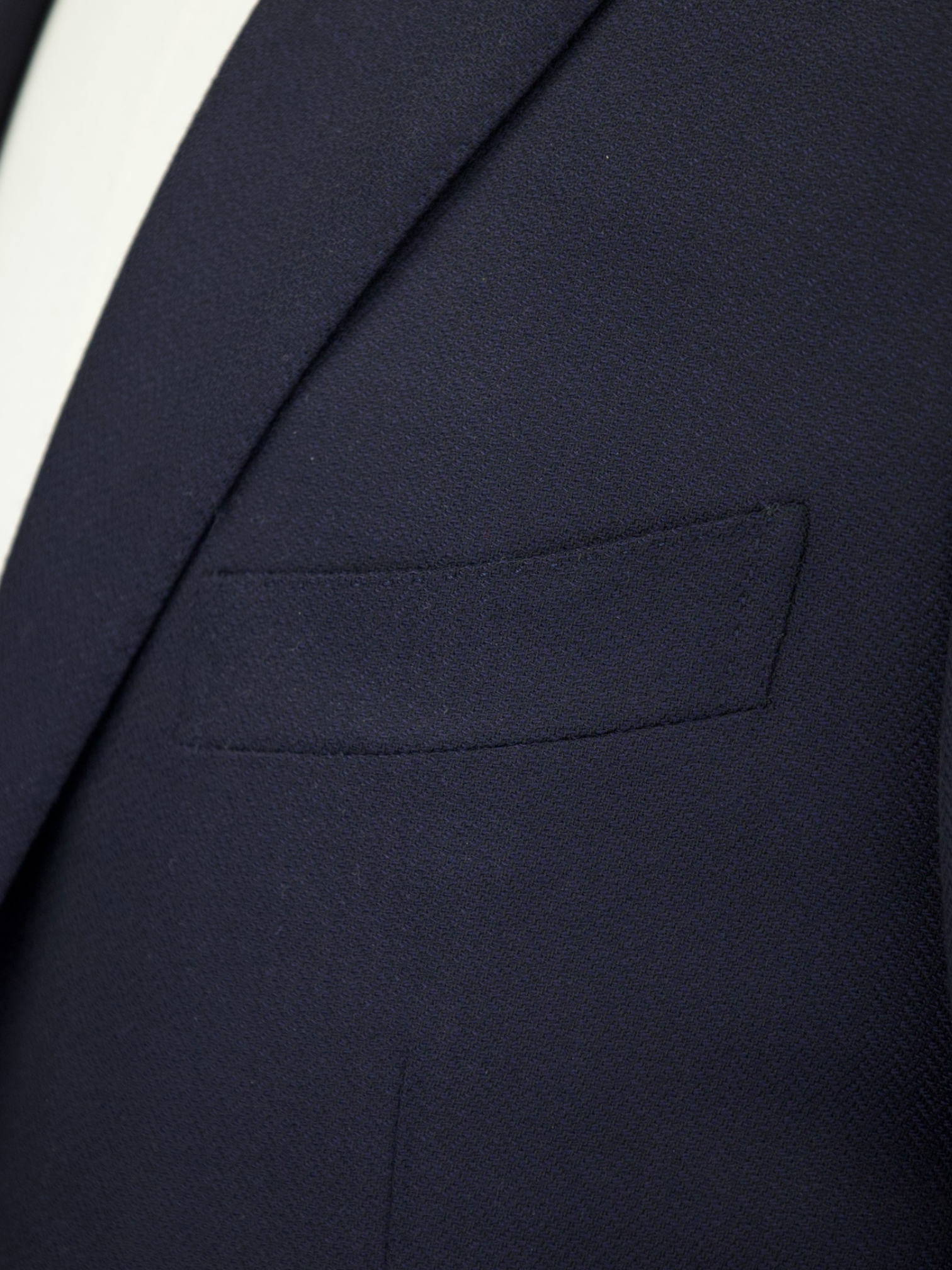 Also known as ‘barchetta’ Italian for ‘little boat’, it is so named because this pocket floats on the chest gently angled upward, just like the bow of a sailboat. These pockets echo the lively roll of a lapel that carries the spring of canvas and natural wool, unlike machine-made chest pockets that have a more stamped-out, rectangular shape and less life.