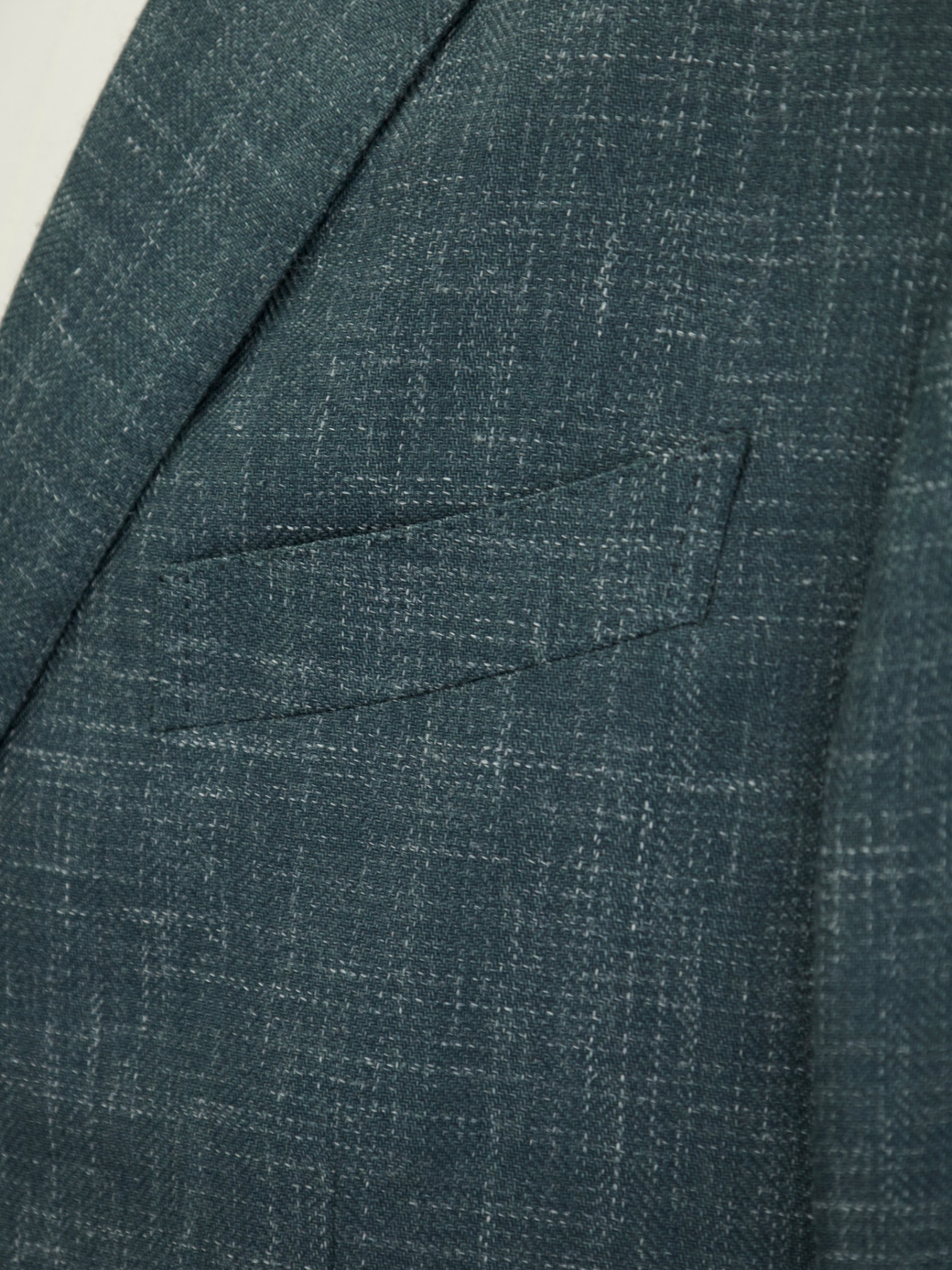 Also known as ‘barchetta’ Italian for ‘little boat’, it is so named because this pocket floats on the chest gently angled upward, just like the bow of a sailboat. These pockets echo the lively roll of a lapel that carries the spring of canvas and natural wool, unlike machine-made chest pockets that have a more stamped-out, rectangular shape and less life.