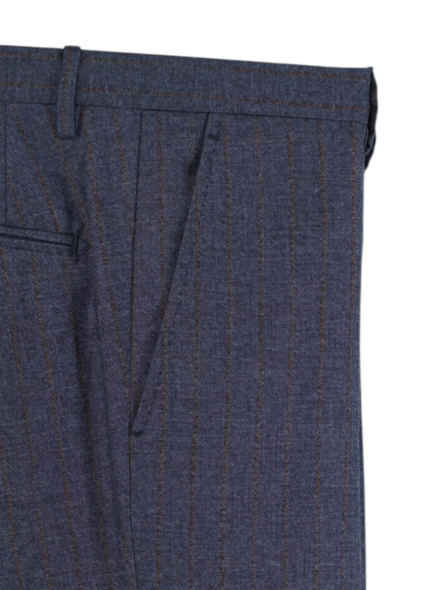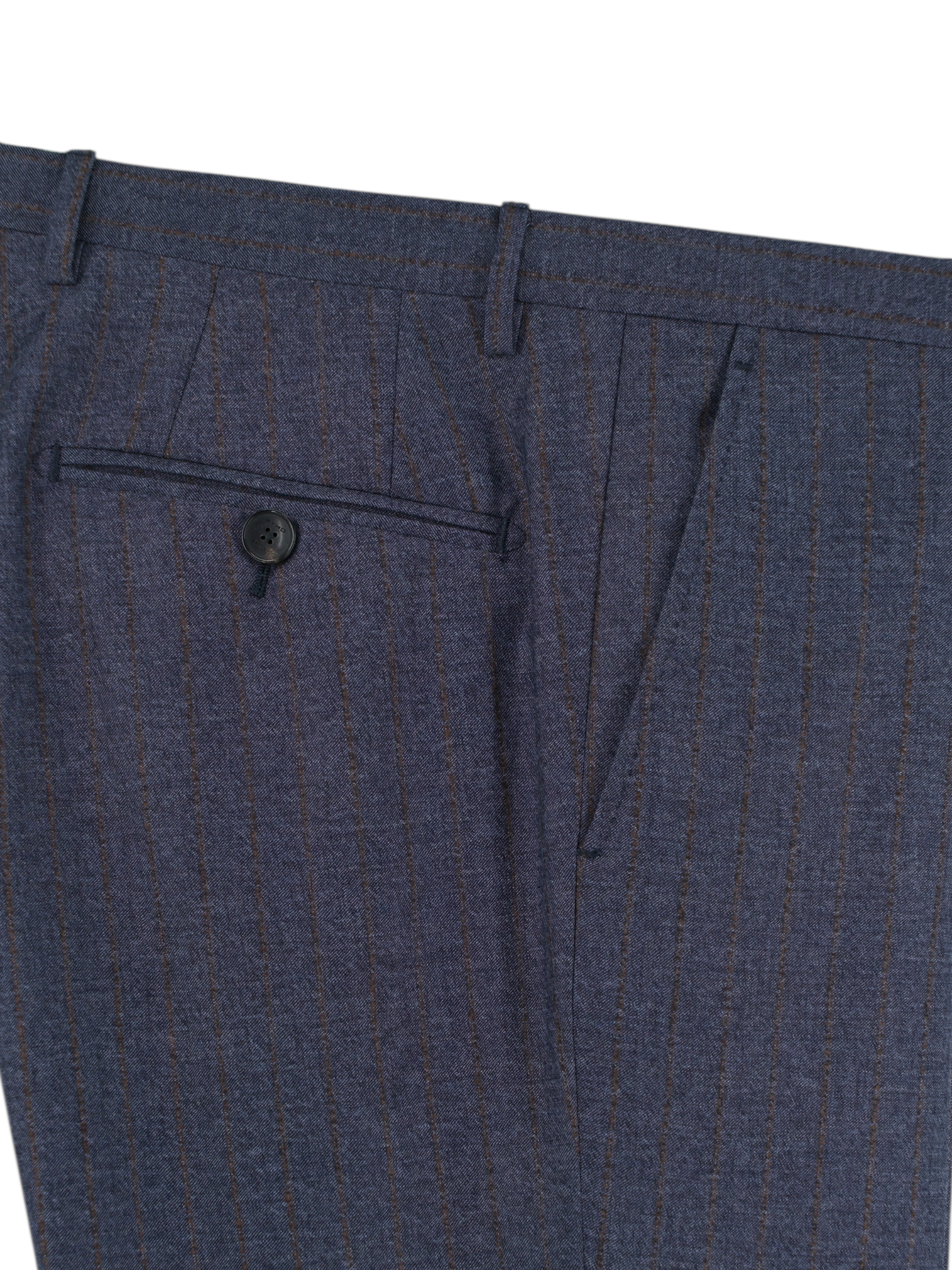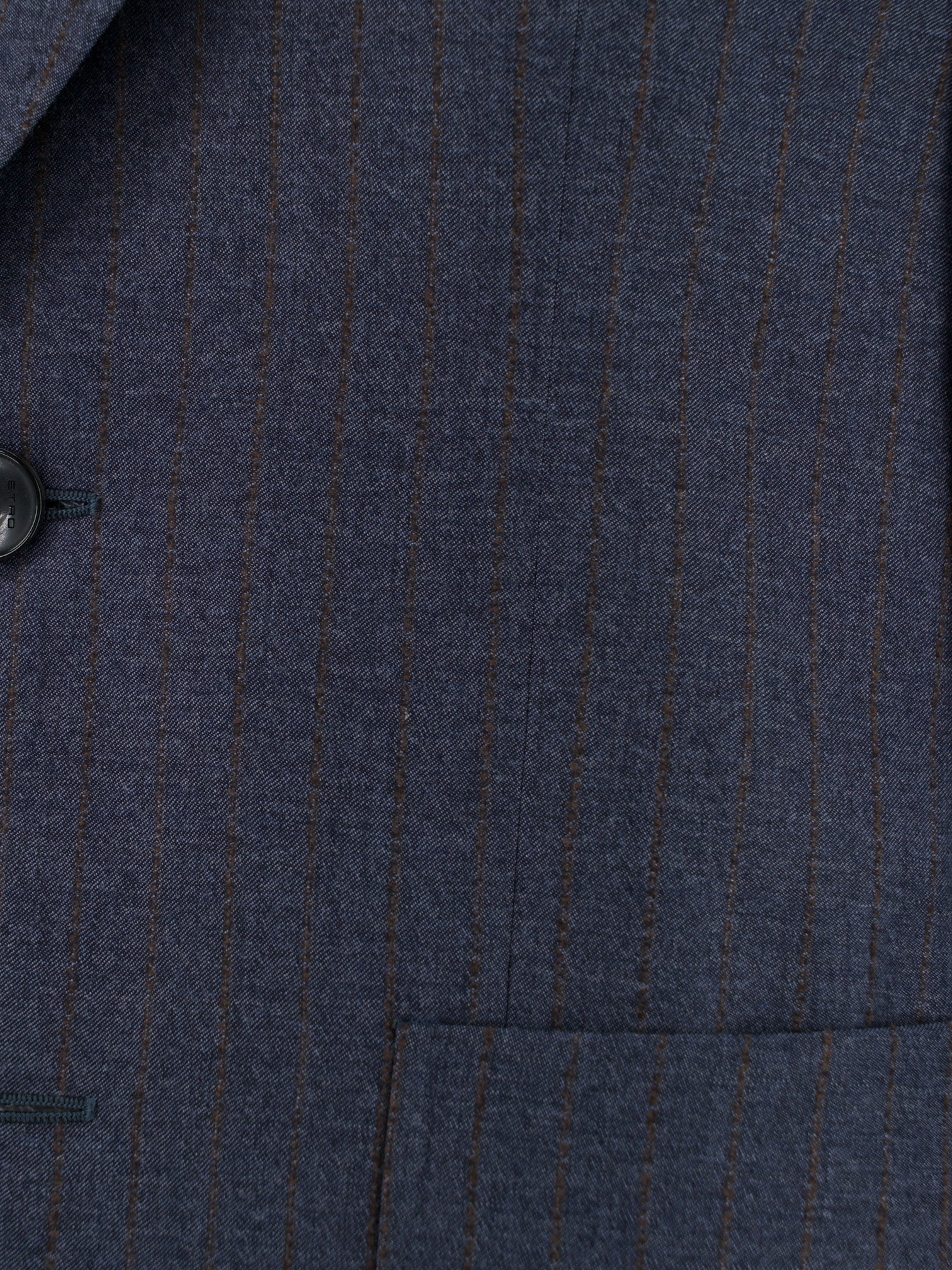 Discover the Etro steel blue and brown wool and silk pinstripe suit, a refined expression of the brand’s signature interplay between classic tailoring and expressive detail. The cloth is woven from a luxurious blend of wool and silk, with a soft steel blue undertone that sets a calm foundation for the warm brown pinstripe running through it. The jacket features sharp peak lapels, a tapered fit, and a two-button closure that keeps the silhouette clean and confident. Inside, Etro’s quintessential paisley silk lining adds a vibrant flourish; unexpected, intricate, and unmistakably the house’s own.