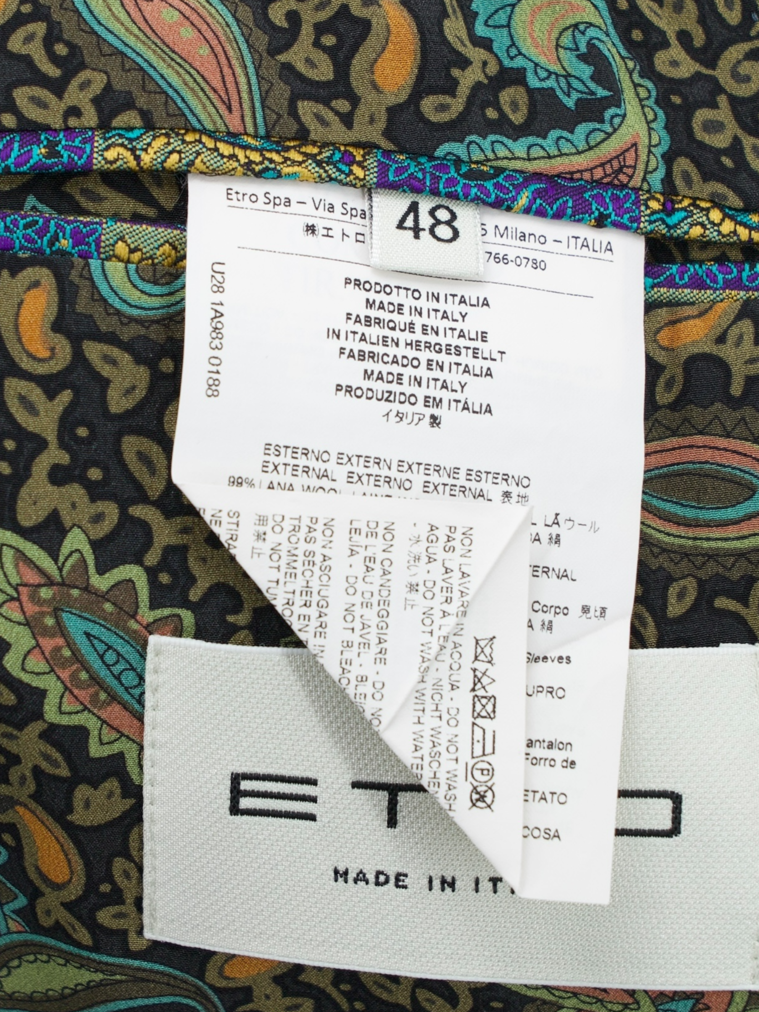 This is tailoring approached with a fashion-savvy sensibility, where construction and colour speak in equal measure. The silk content in the fabric gives it a subtle sheen and fluidity, allowing the suit to move with ease while maintaining a structured form. Etro’s tailoring remains grounded in traditional Italian craftsmanship, but it’s never bound by convention. The balance here is deliberate; the sober elegance of the pinstripe offset by the playful riot of colour within. For those who appreciate tailoring with personality, this suit delivers poise with just the right amount of irreverence. Discover the elaborated sartorial details below.