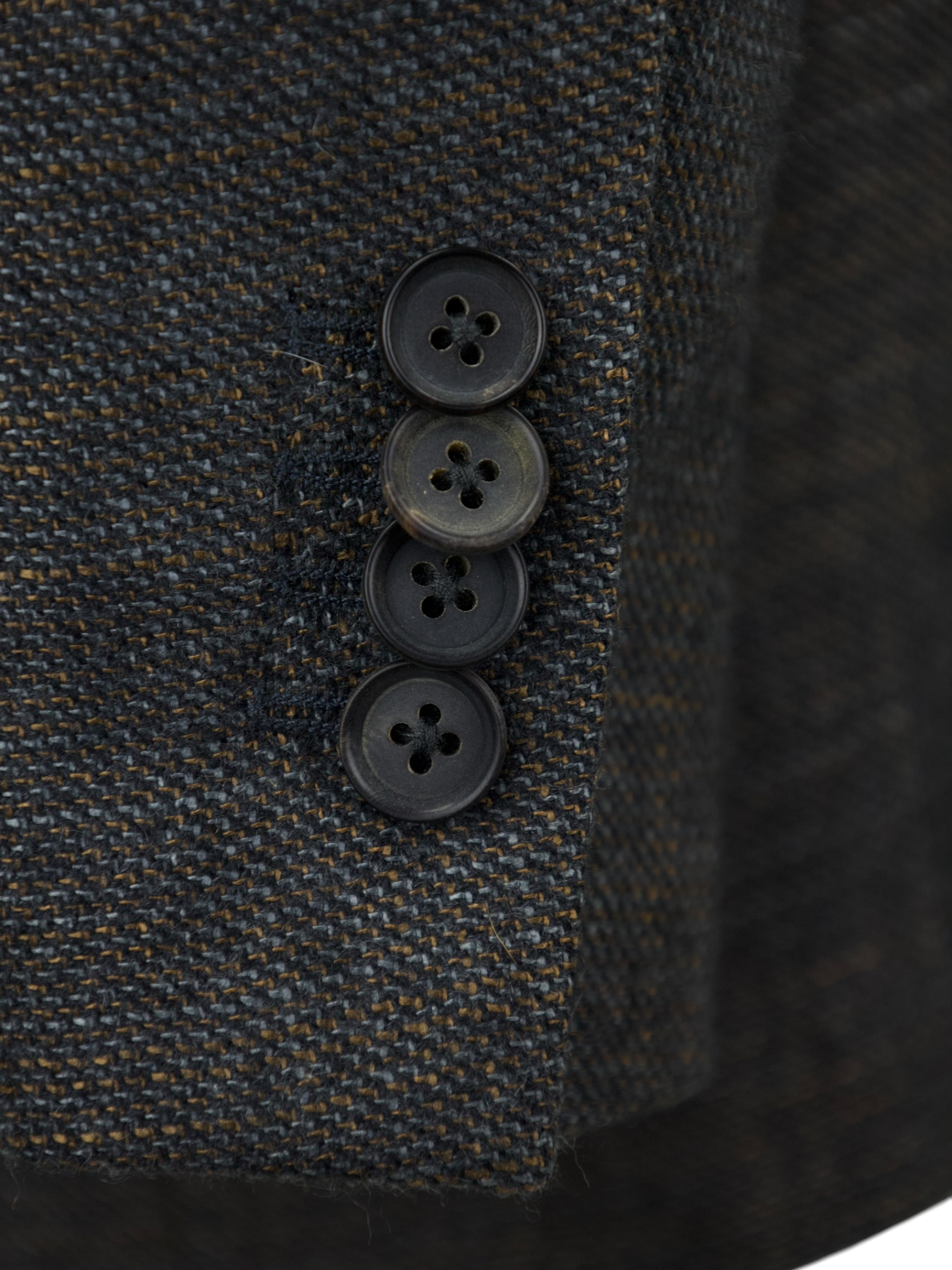 Discover the Isaia dark taupe cashmere and silk micro-pattern jacket, a refined blend of luxurious materials and meticulous craftsmanship. This jacket features a dark grey undertone intricately woven with mocha brown and light grey threads, creating a visually rich dark taupe hue. Designed with classic notch lapels, a fully lined interior, and adorned with genuine horn buttons, it exemplifies Isaia's commitment to elegance and quality.